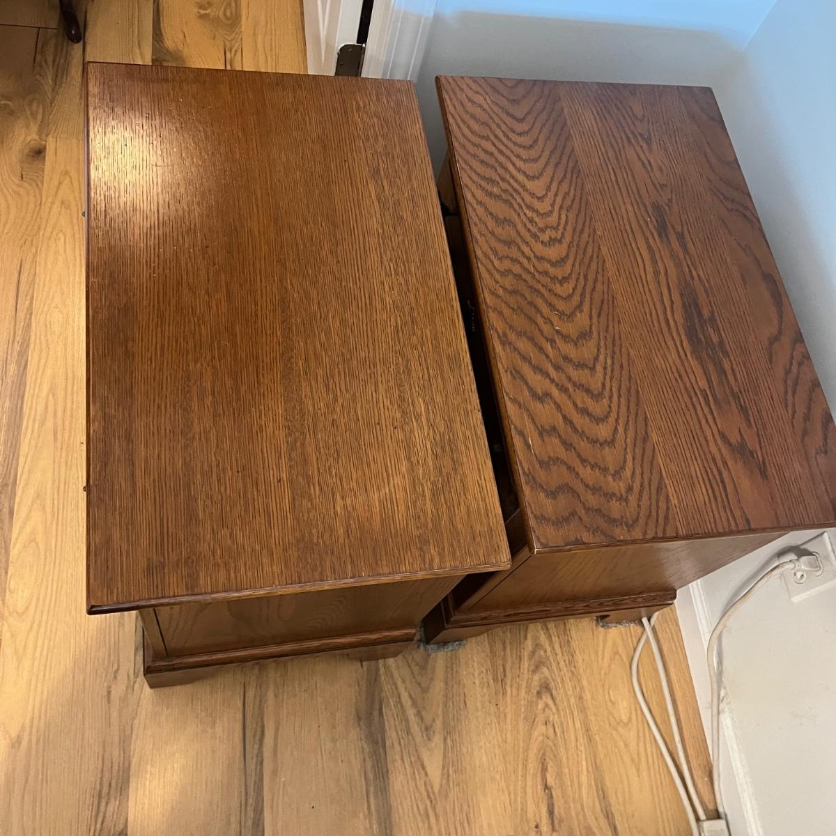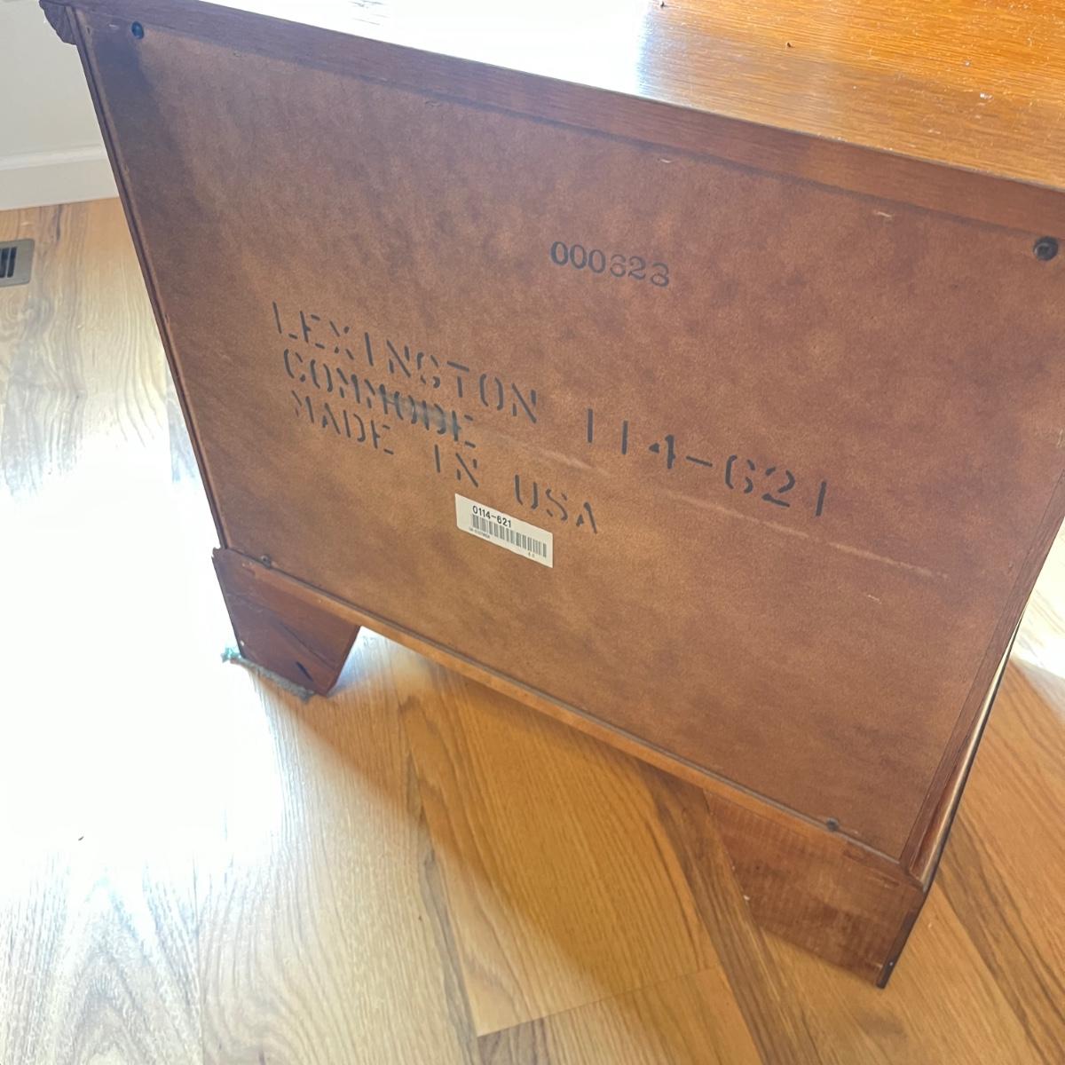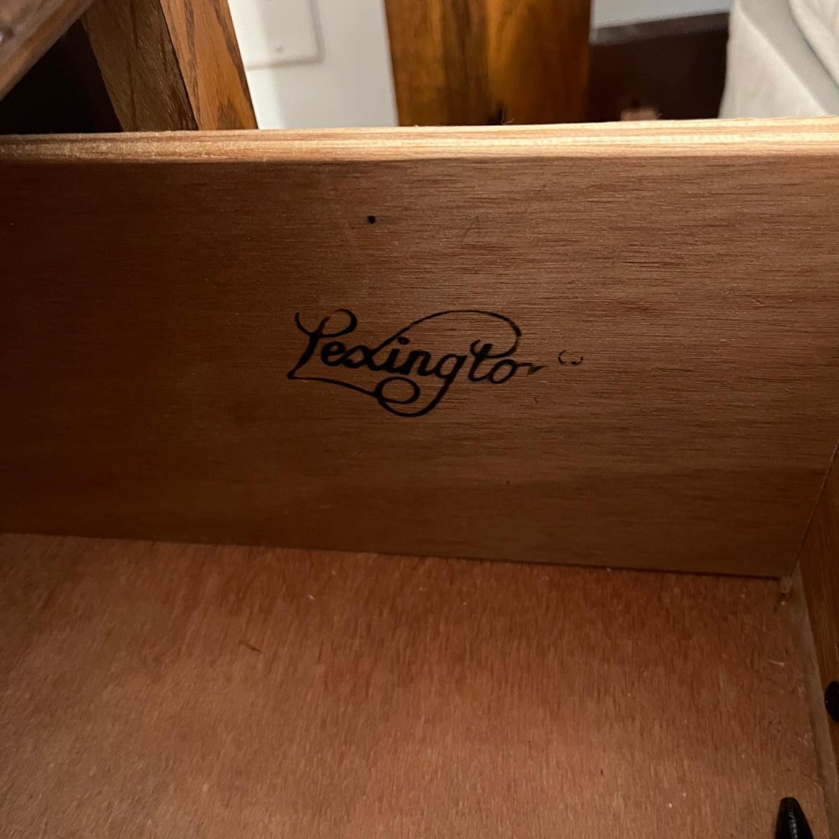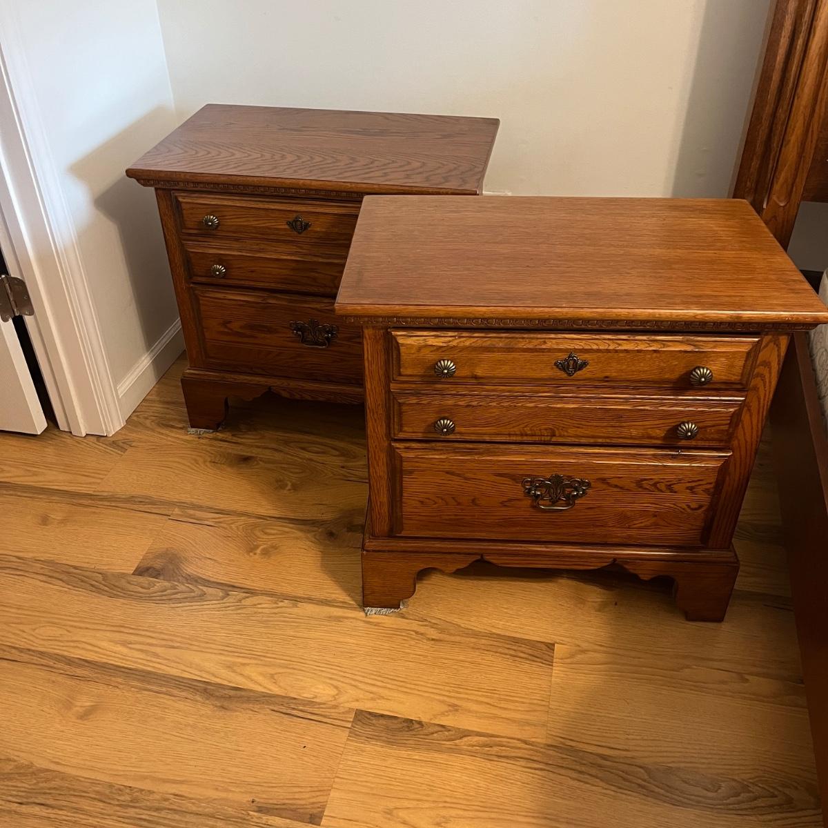 Lot includes two Lexington side tables with two drawers on each piece. Side tables measure 16” x 26” x 24.75”H. One side tabletop has a faint water circle and a few nicks and scratches, see pictures. Matching bedroom suite furniture is available in other lots in this sale.