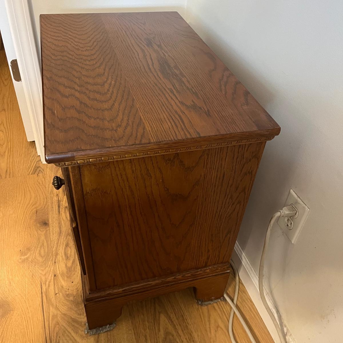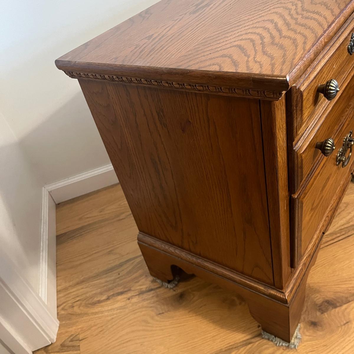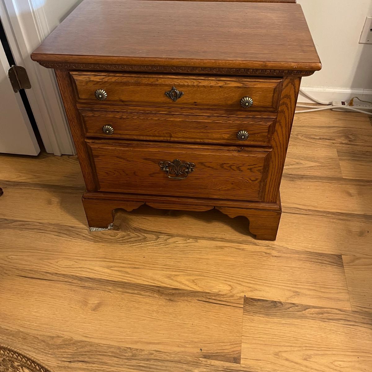 Lot includes two Lexington side tables with two drawers on each piece. Side tables measure 16” x 26” x 24.75”H. One side tabletop has a faint water circle and a few nicks and scratches, see pictures. Matching bedroom suite furniture is available in other lots in this sale.