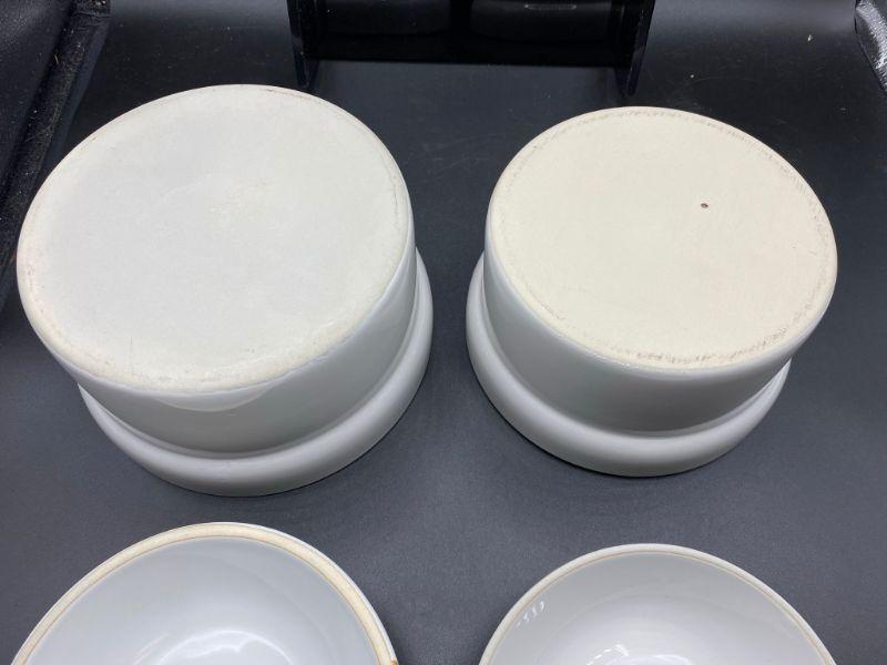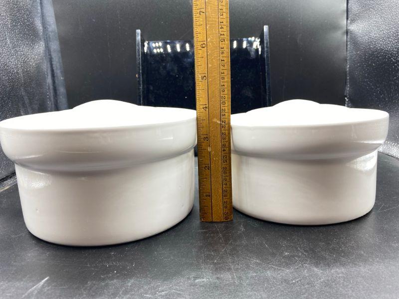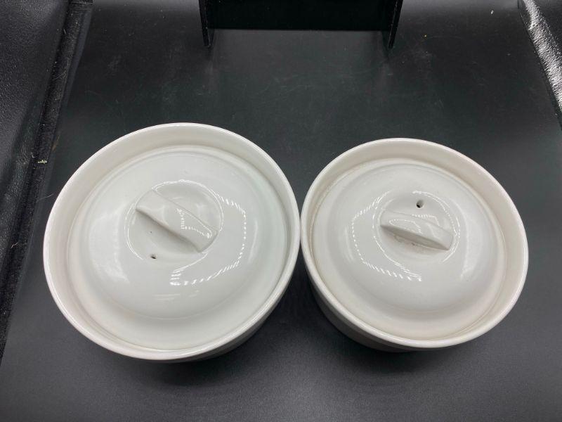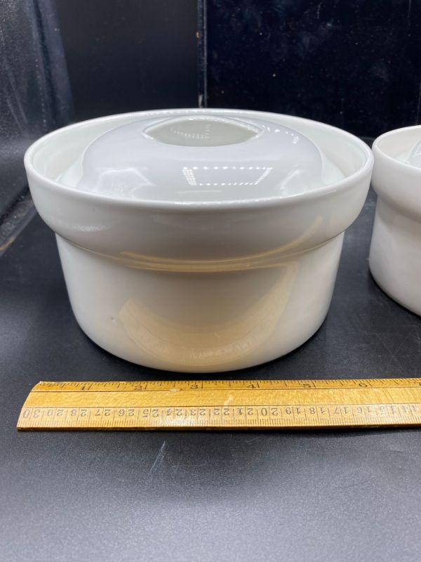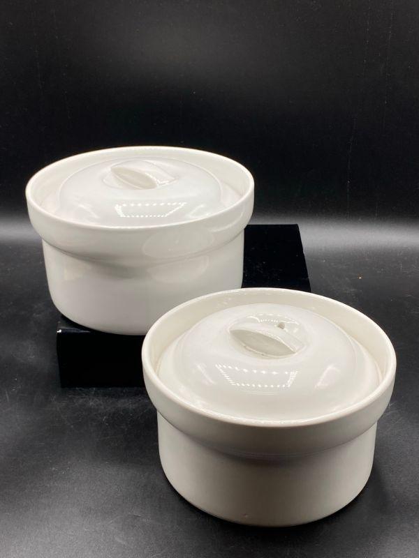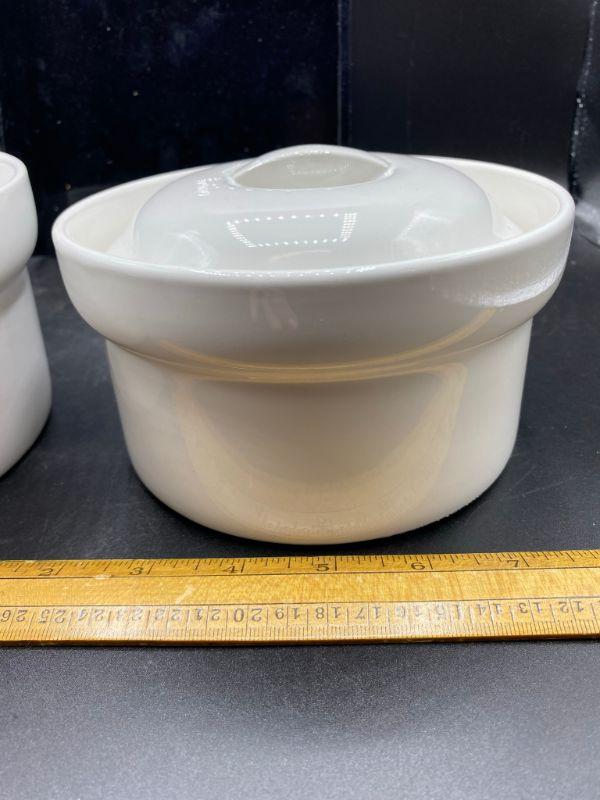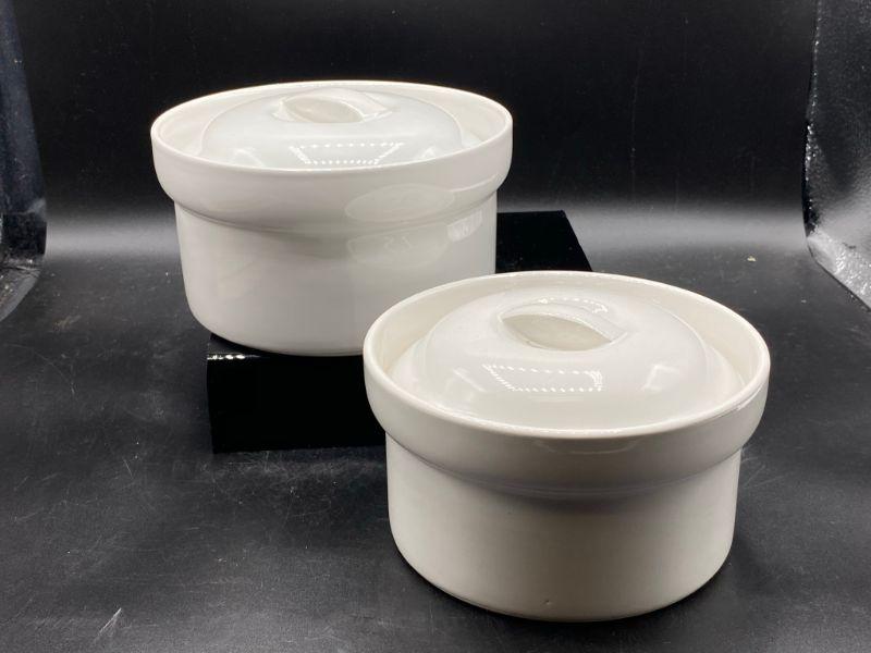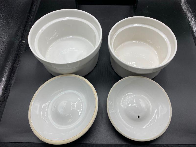 Pair of lidded crock style casserole dishes. One is slightly bigger then the other. Good condition. Unmarked.