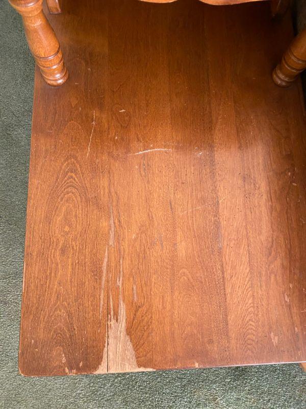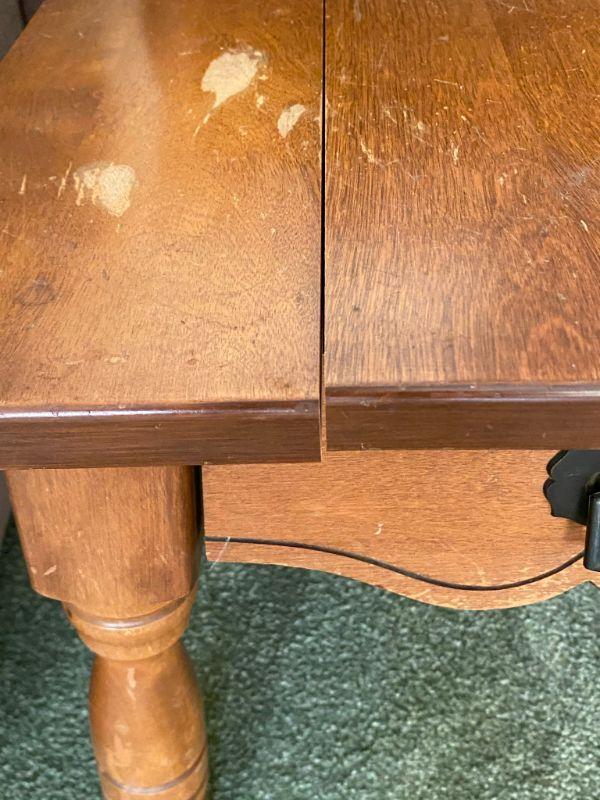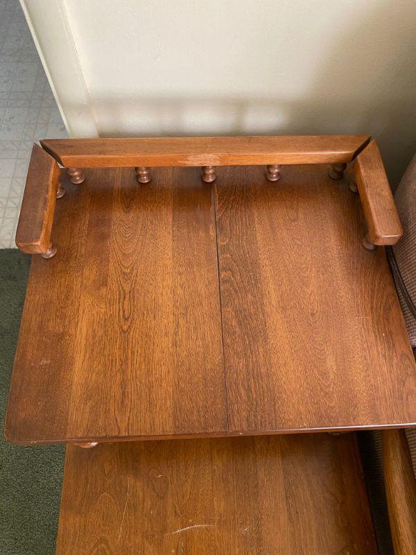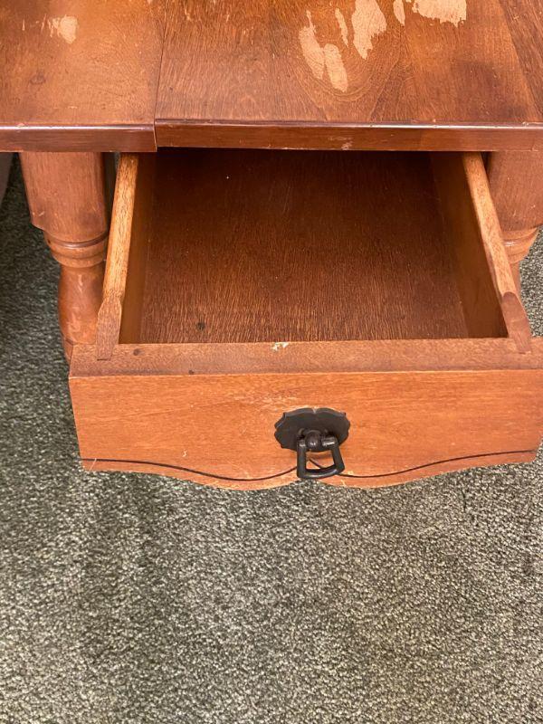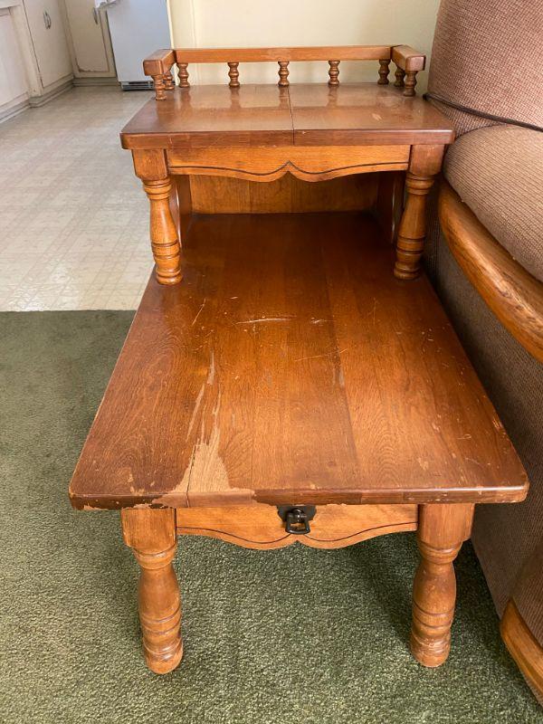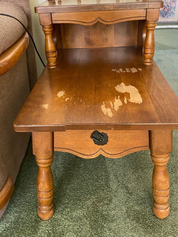 Pair of light finished wood end tables. Double surface with small drawer. Solid wood, do have signs of age. Wood has split in spots. Great for repurpose.