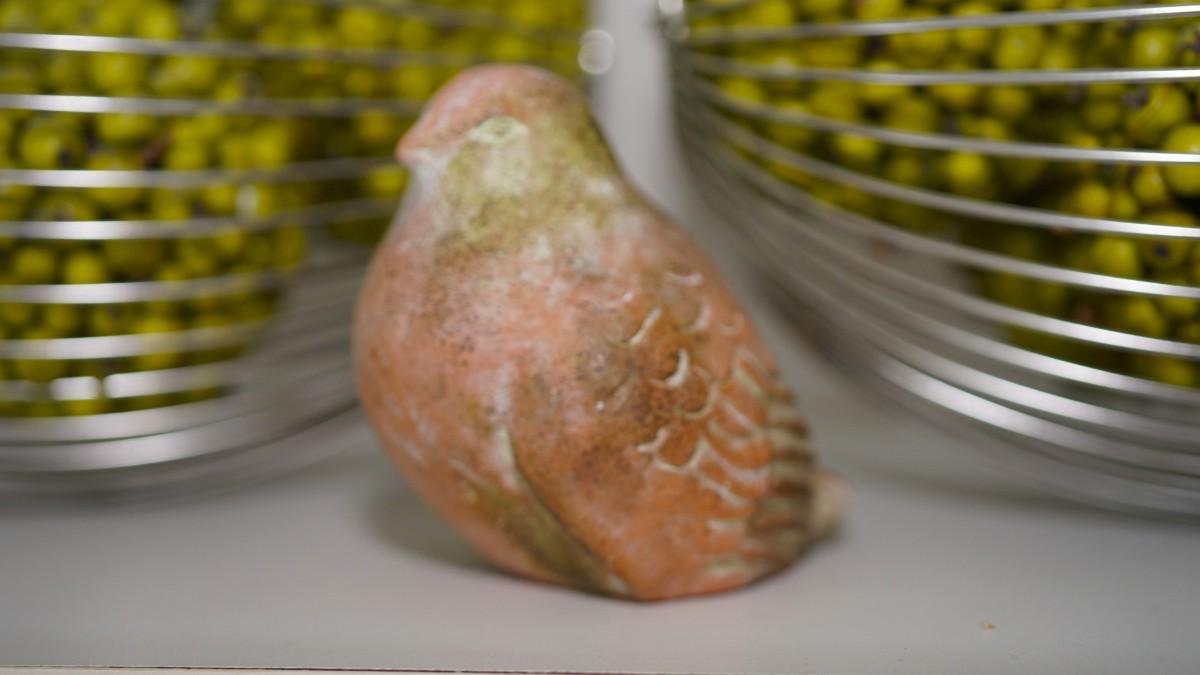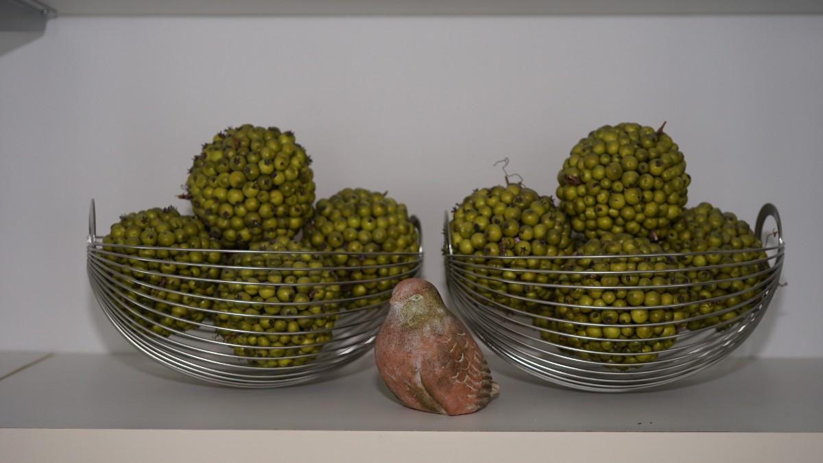 Simple but interesting grouping for the area that needs a "lift" of character in your home. A pair of two chrome lightweight baskets that hold each five balls of berry formed seeds dried. The ceramic terra cotta finish ceramic sparrow compliments the grouping