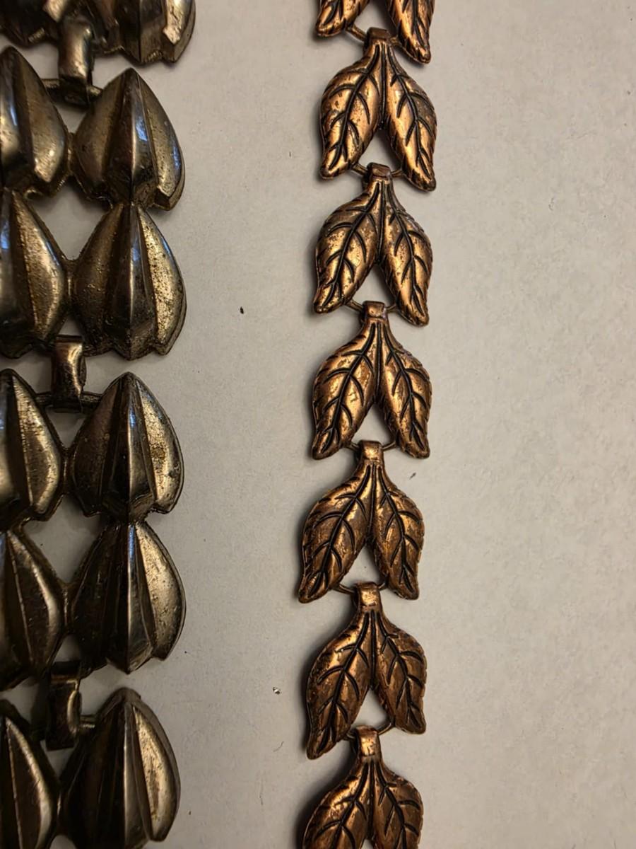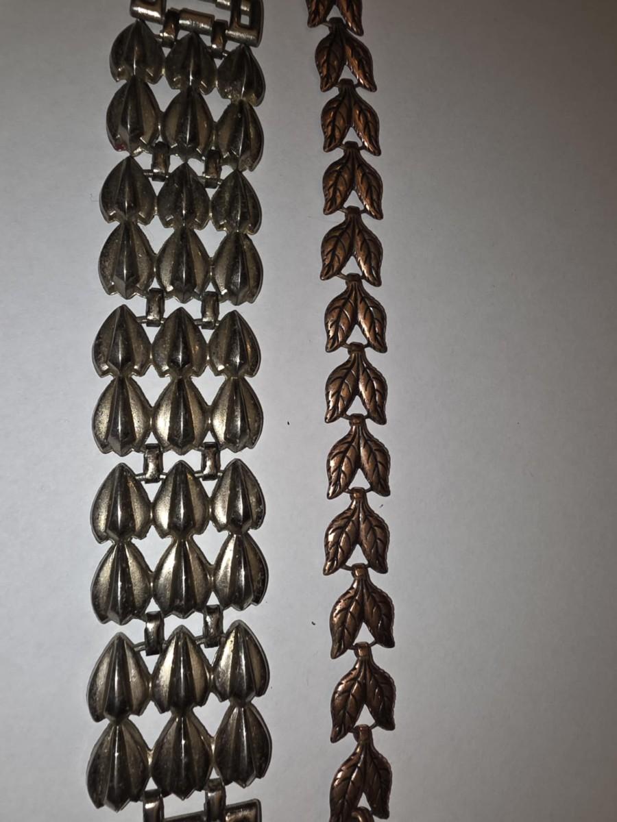 One has a copper tone with leaves the other is thicker band in silver tone and is more cuff style. 8 in each