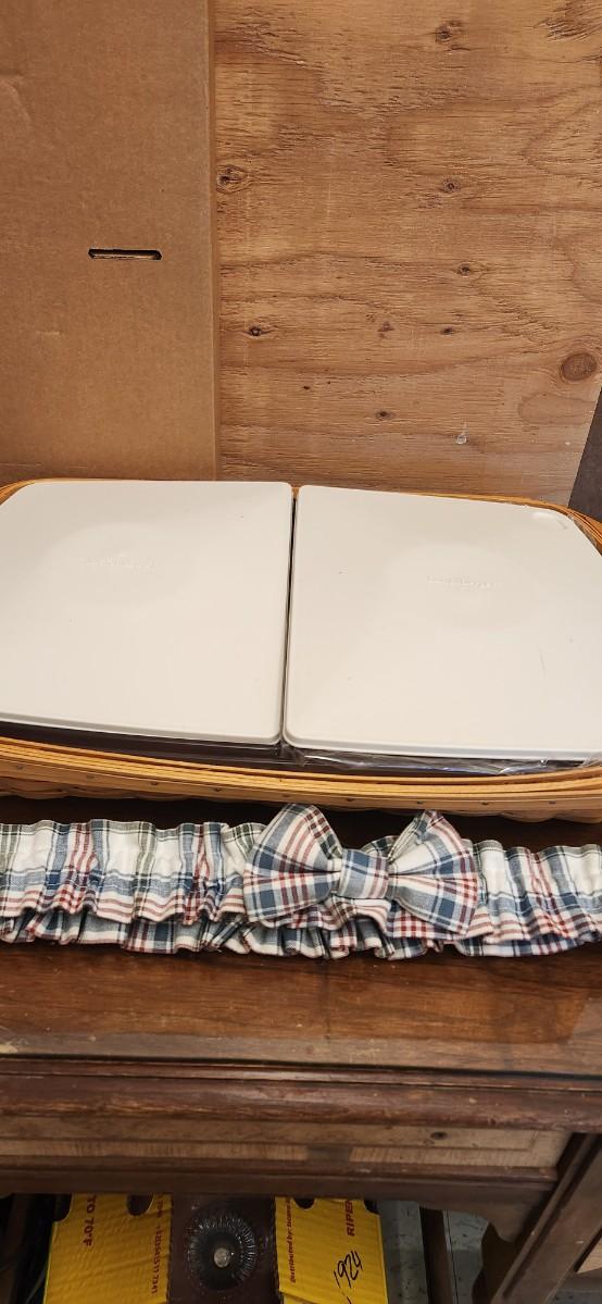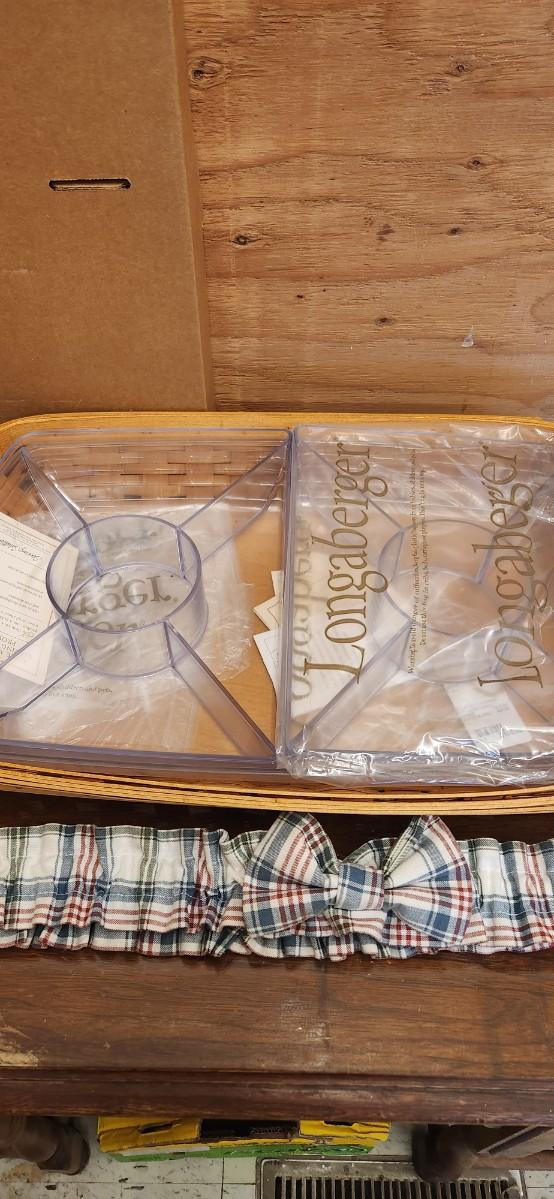 Pair of Longaberger serving baskets both with plaid garters and serve it up divided inserts as well as hard inserts.