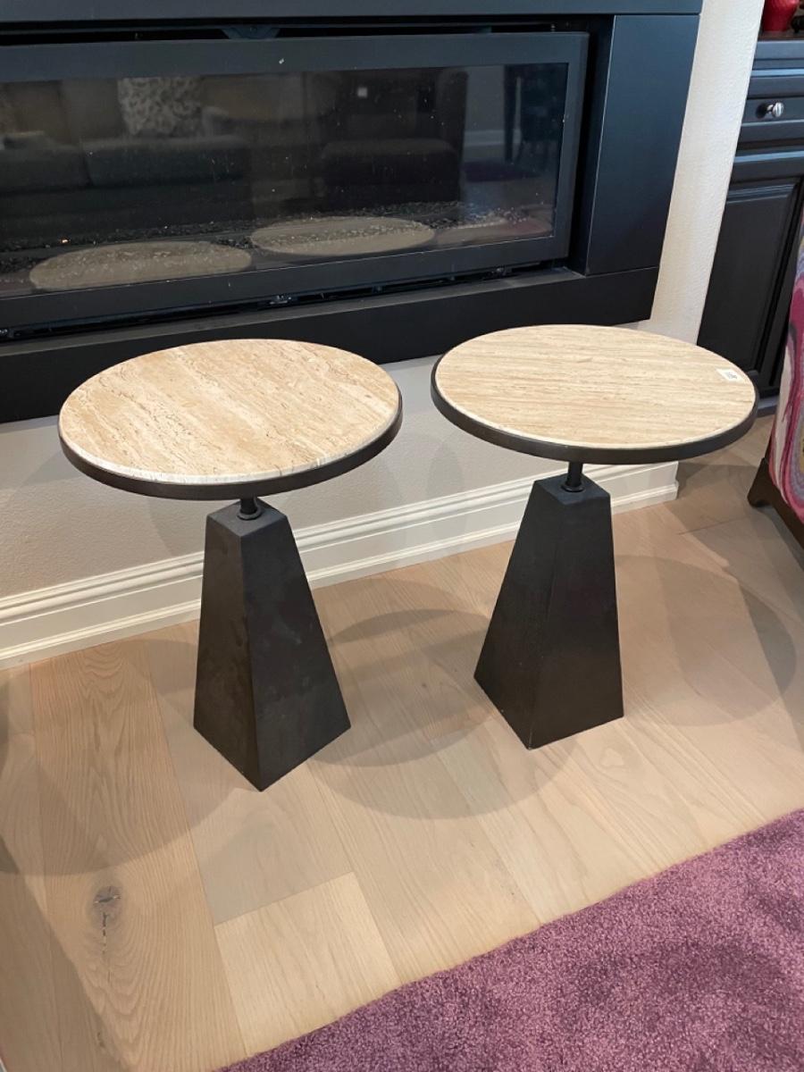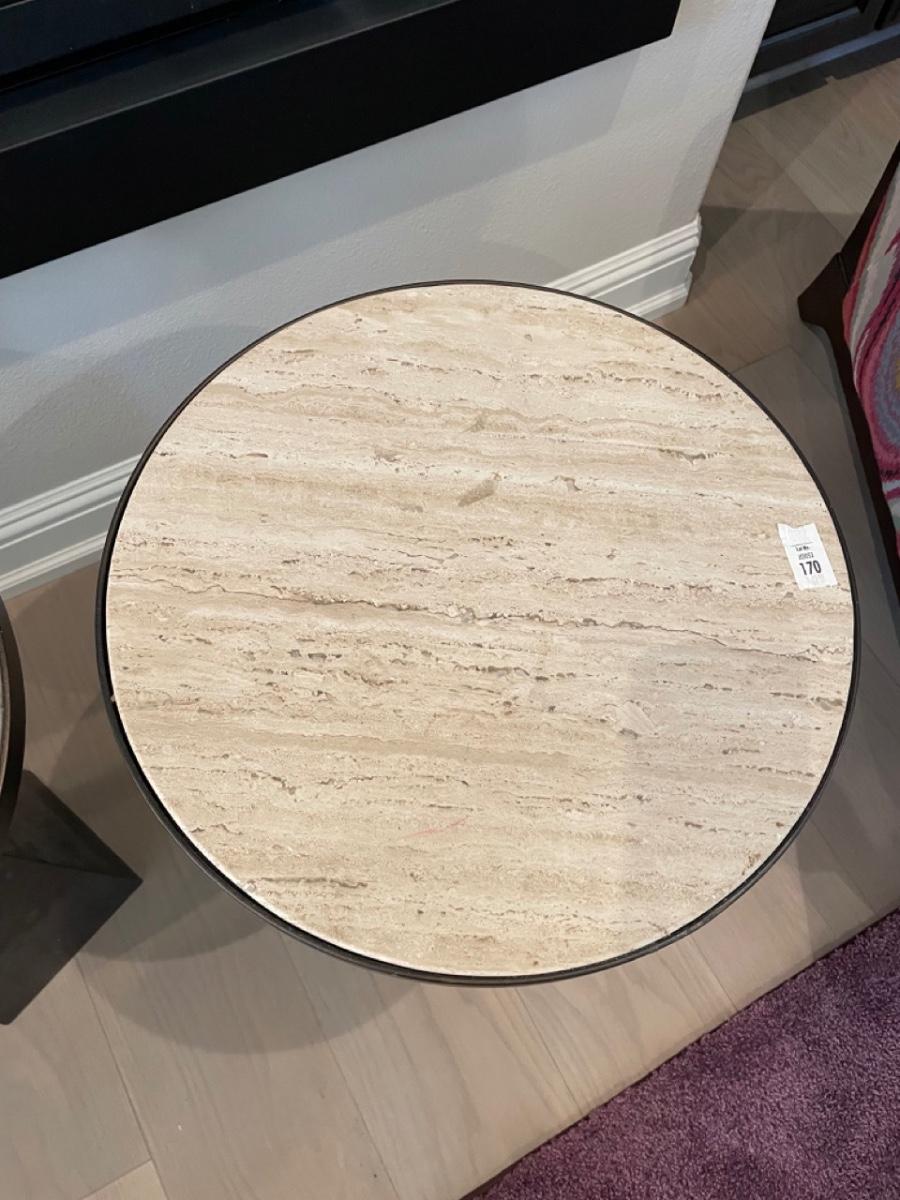 Stone top and metal base. Very sturdy and stylish. In very good condition.16" diameter