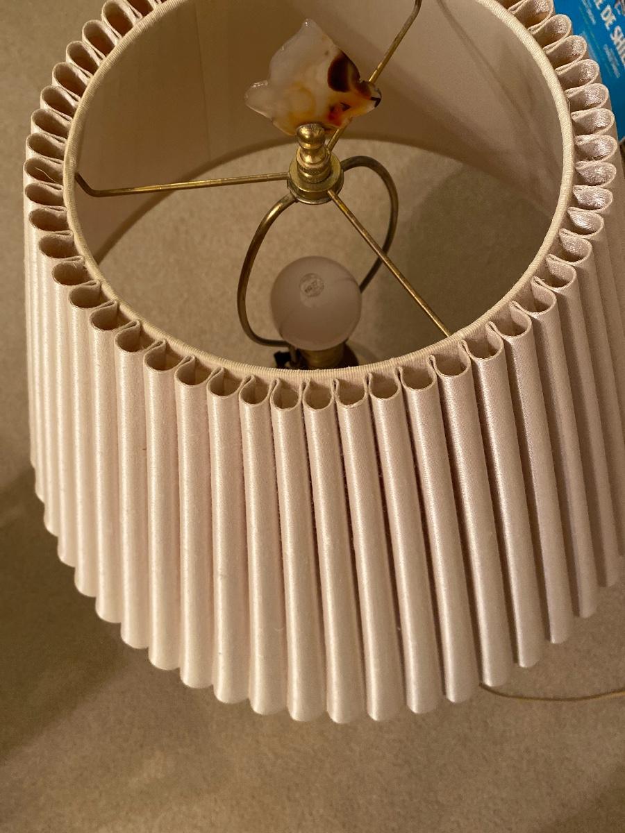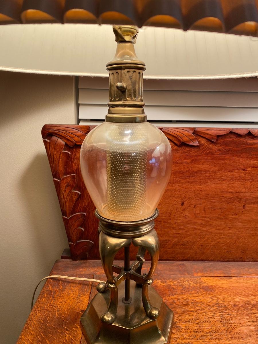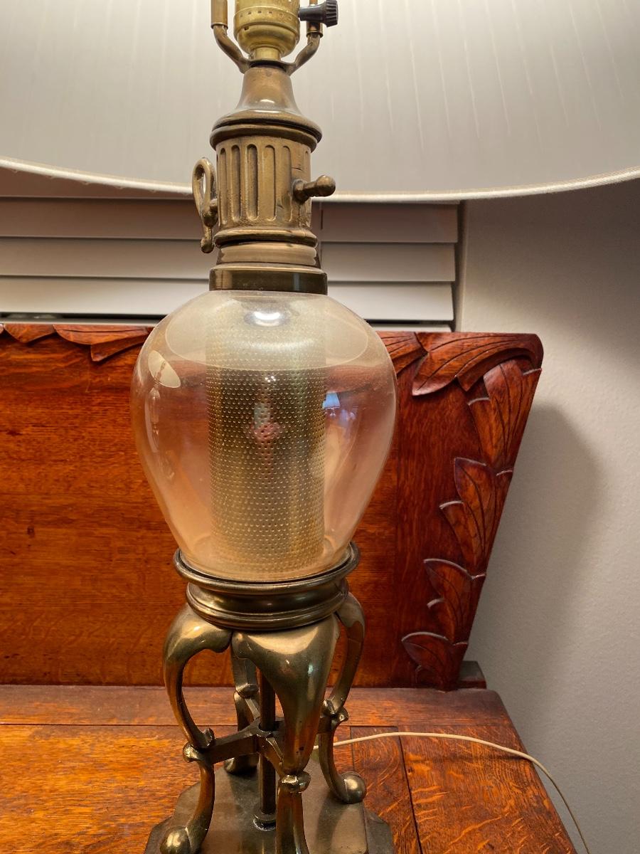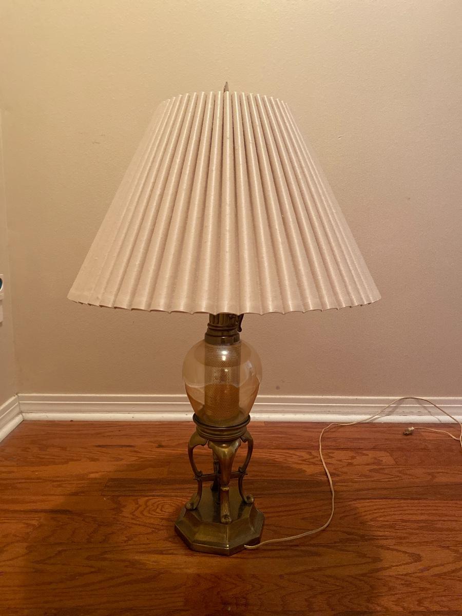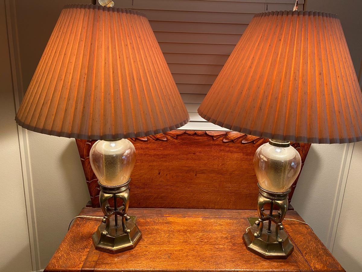 Pair of lovely vintage brass & glass lamps. Very nice lamps with great shades & glass leaf finials.