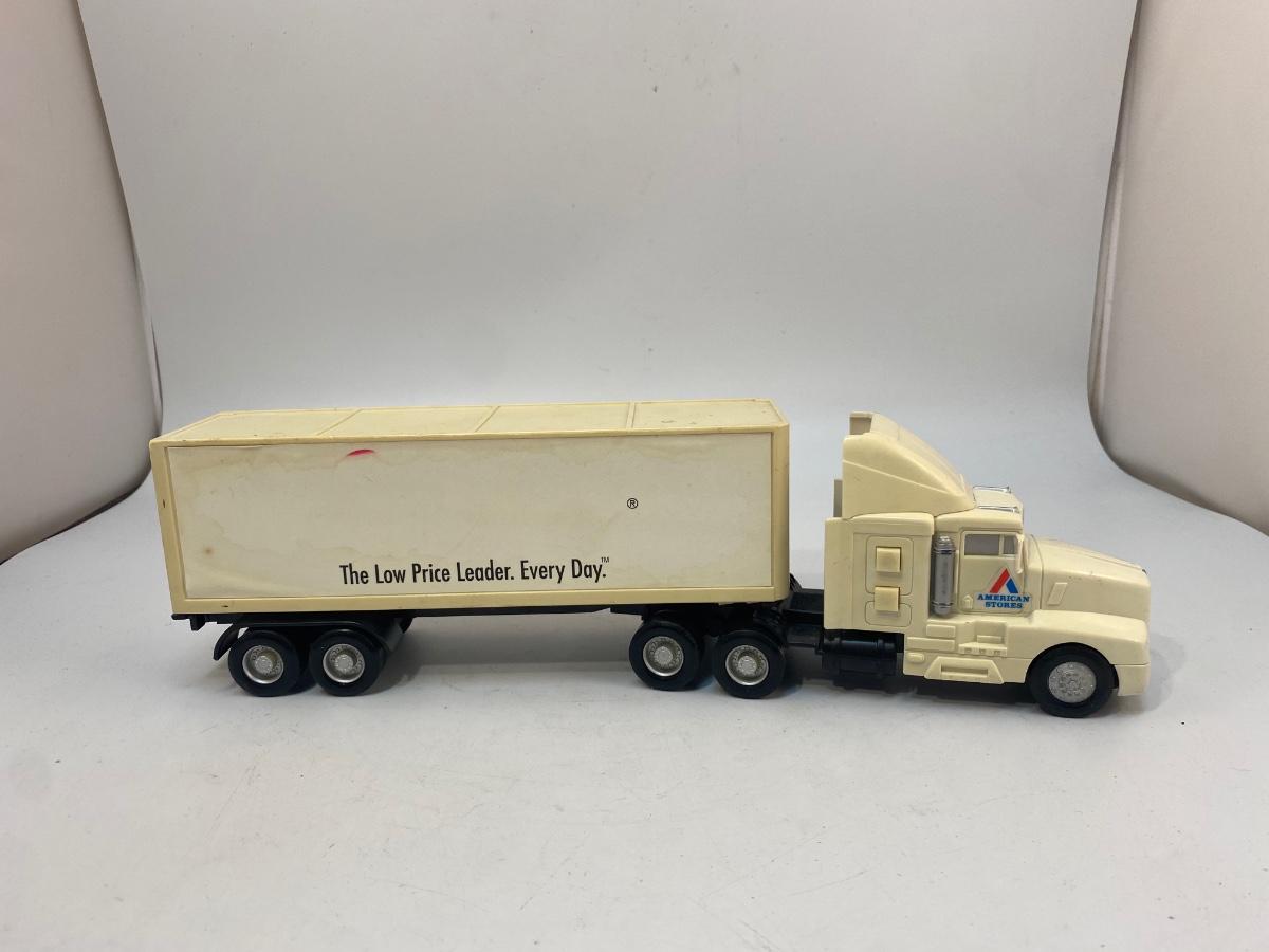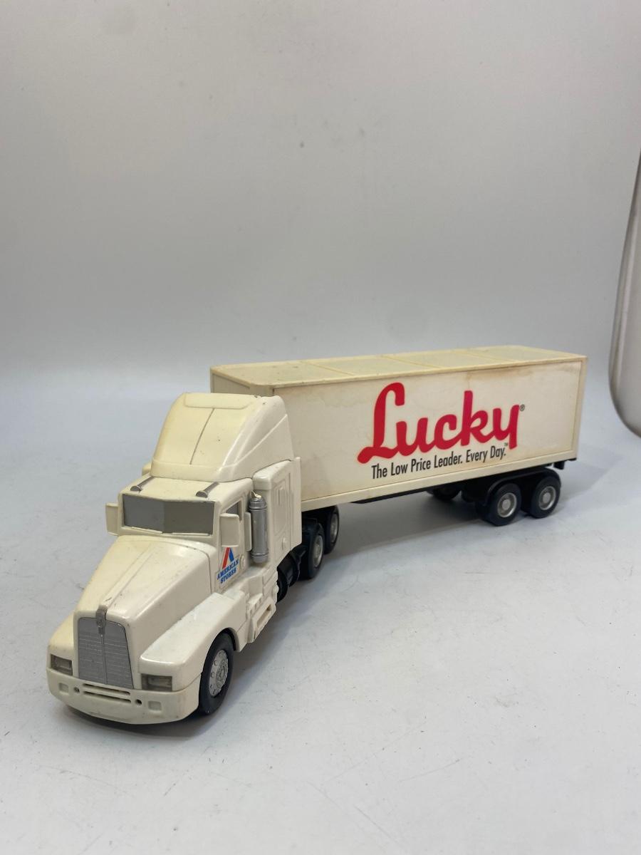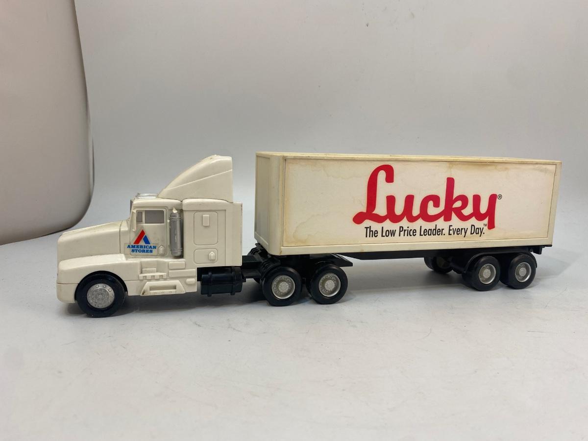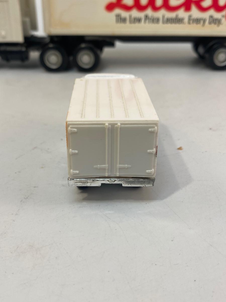 Pair of Lucky Grocery Store Die Cast Delivery Semi Box Trucks. Both in played with condition. The semi is actually a radio of some sort. There is a speaker in the trailer and buttons on side of cab. Battery compartment on the bottom but could not get cover open.