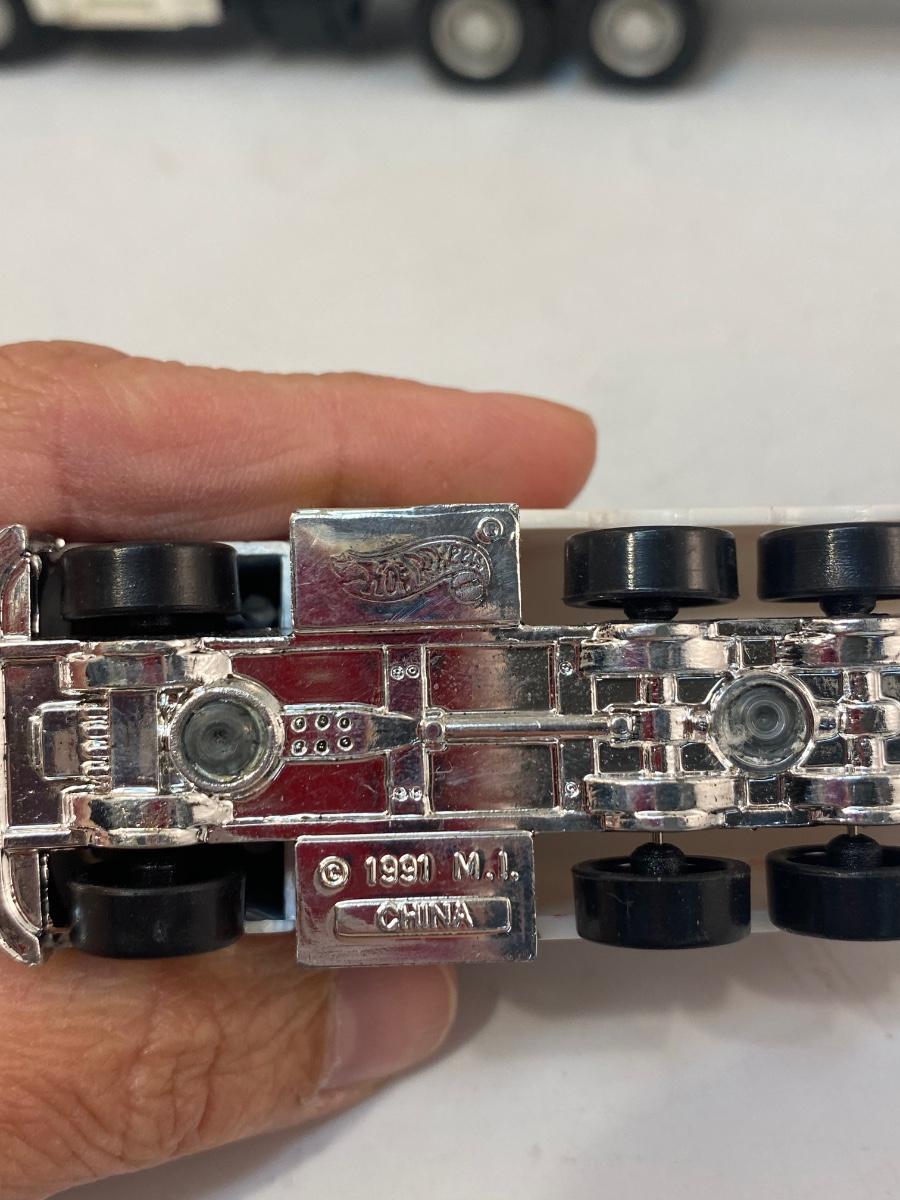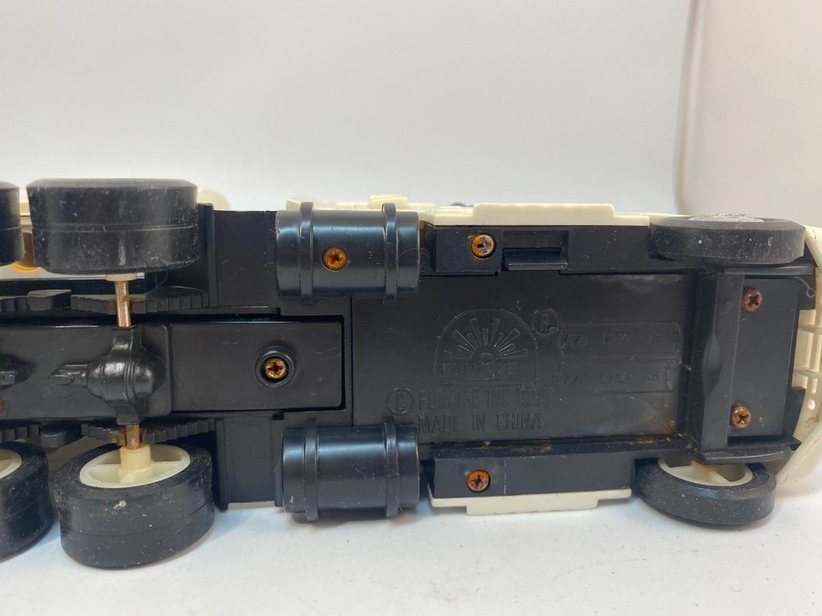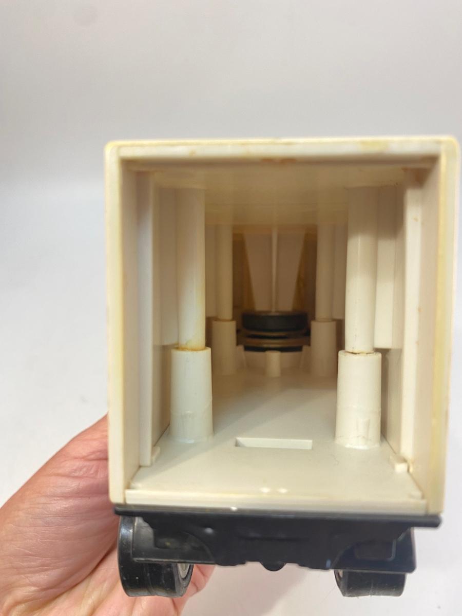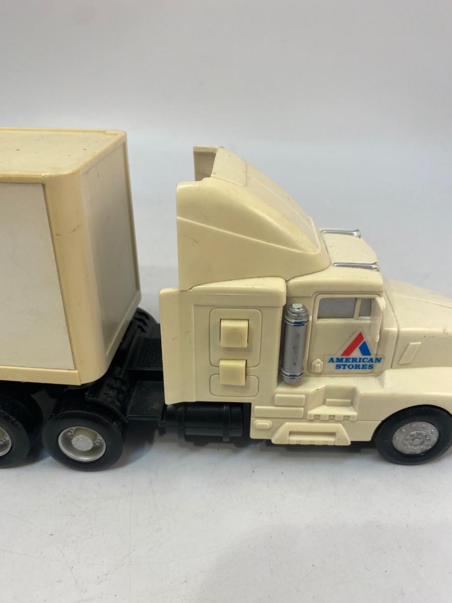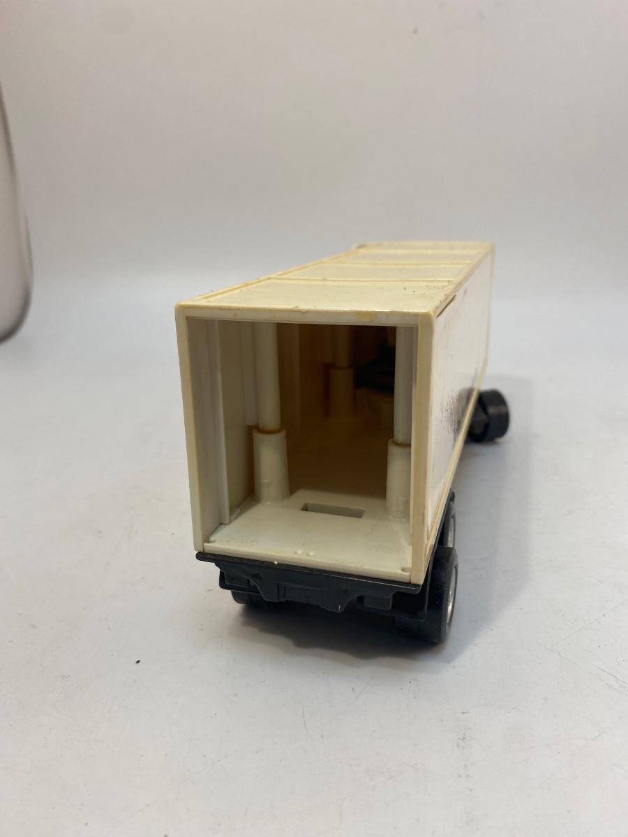Pair of Lucky Grocery Store Die Cast Delivery Semi Box Trucks. Both in played with condition. The semi is actually a radio of some sort. There is a speaker in the trailer and buttons on side of cab. Battery compartment on the bottom but could not get cover open.