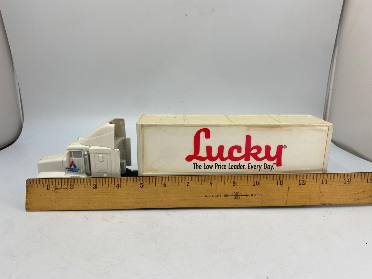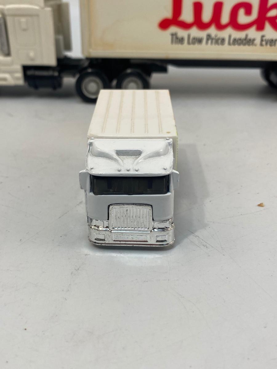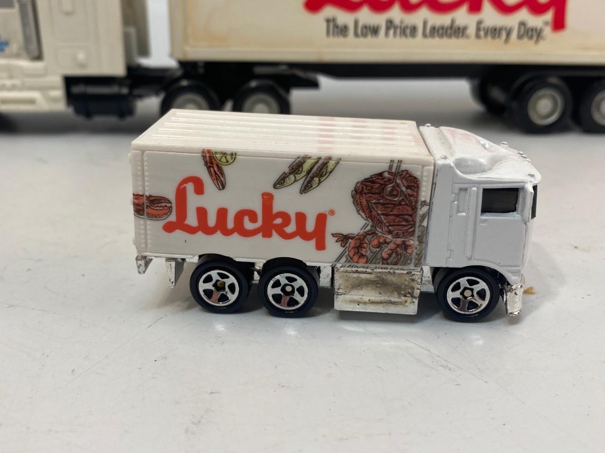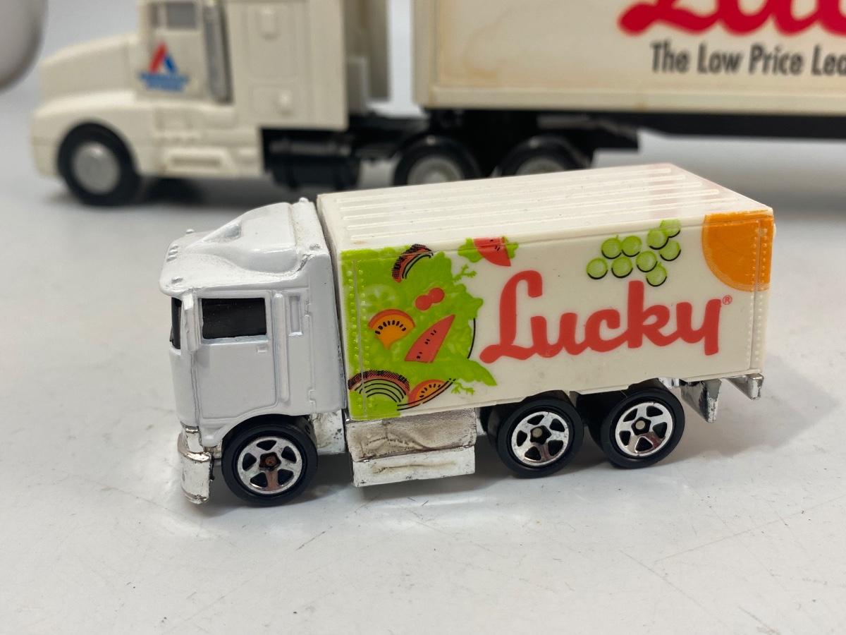 Pair of Lucky Grocery Store Die Cast Delivery Semi Box Trucks Vintage Advertising Toy