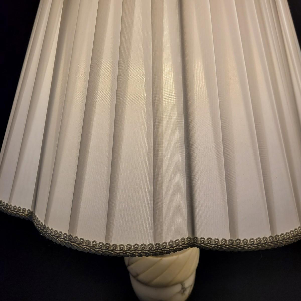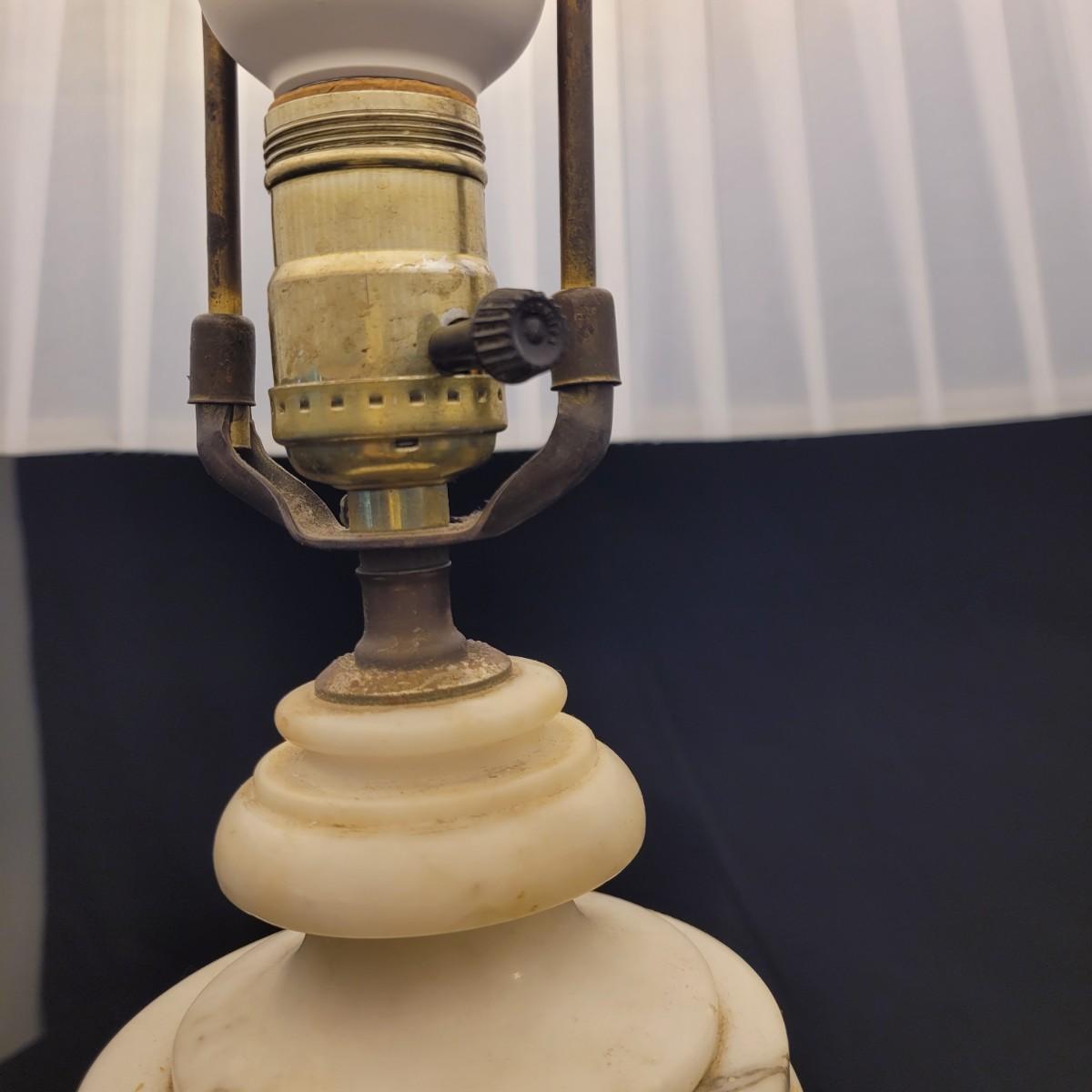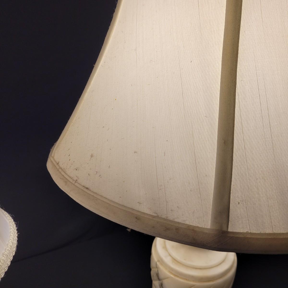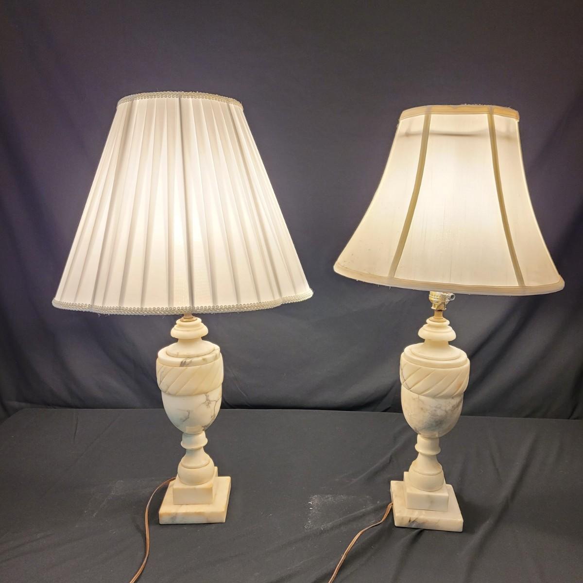 Pair of lamps with solid marble bases, very heavy. Two different shades that appear to be easily cleaned from dust buildup. Marble bases measure approximately 5"sq at base, 15"H. Shipping available.