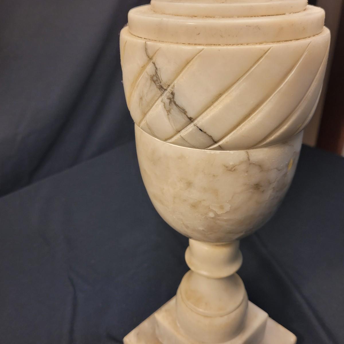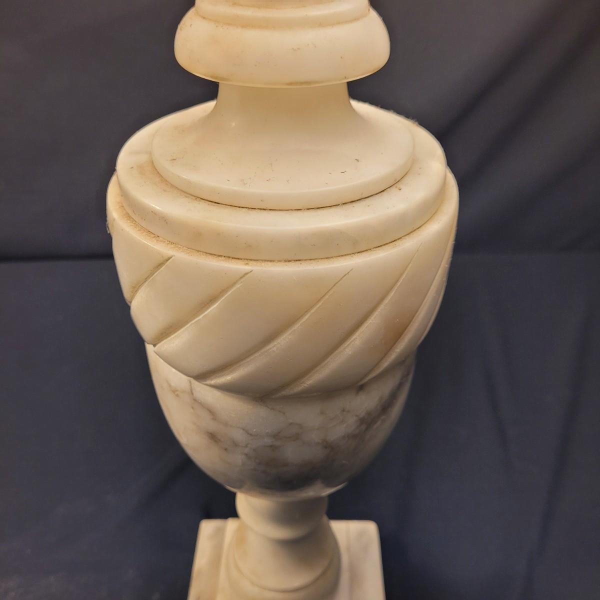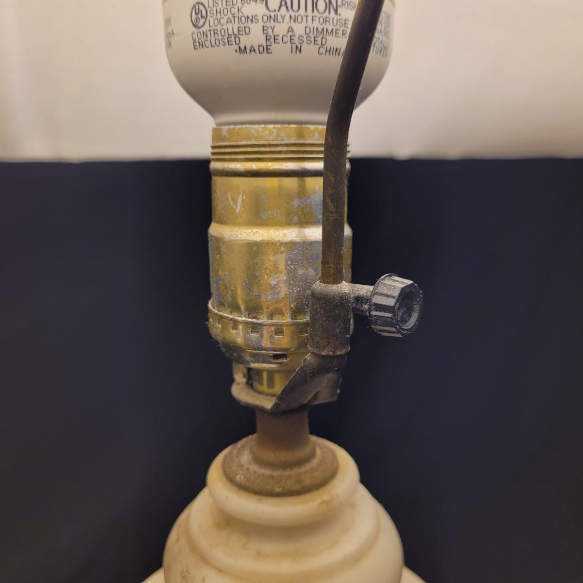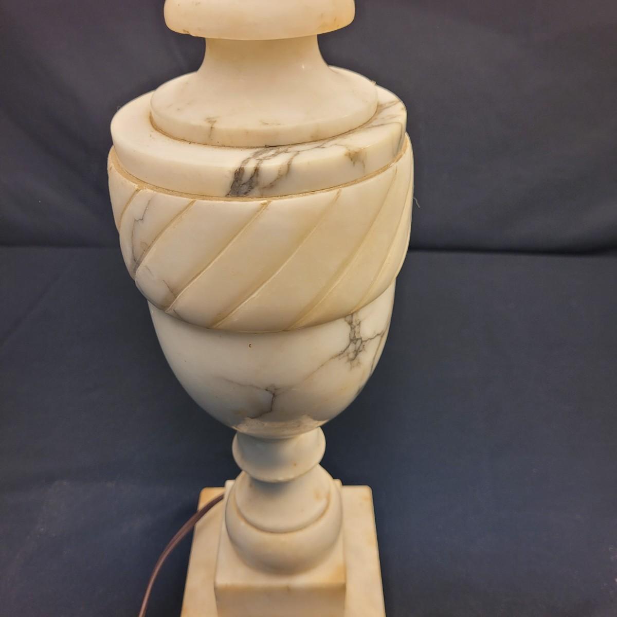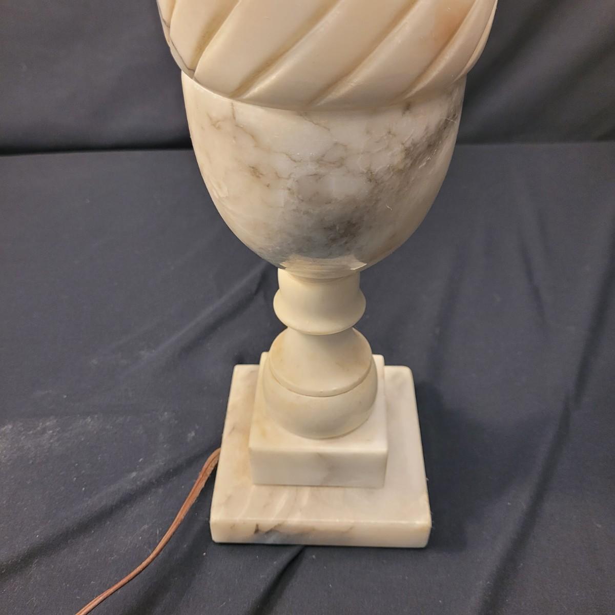 Pair of lamps with solid marble bases, very heavy. Two different shades that appear to be easily cleaned from dust buildup. Marble bases measure approximately 5"sq at base, 15"H. Shipping available.