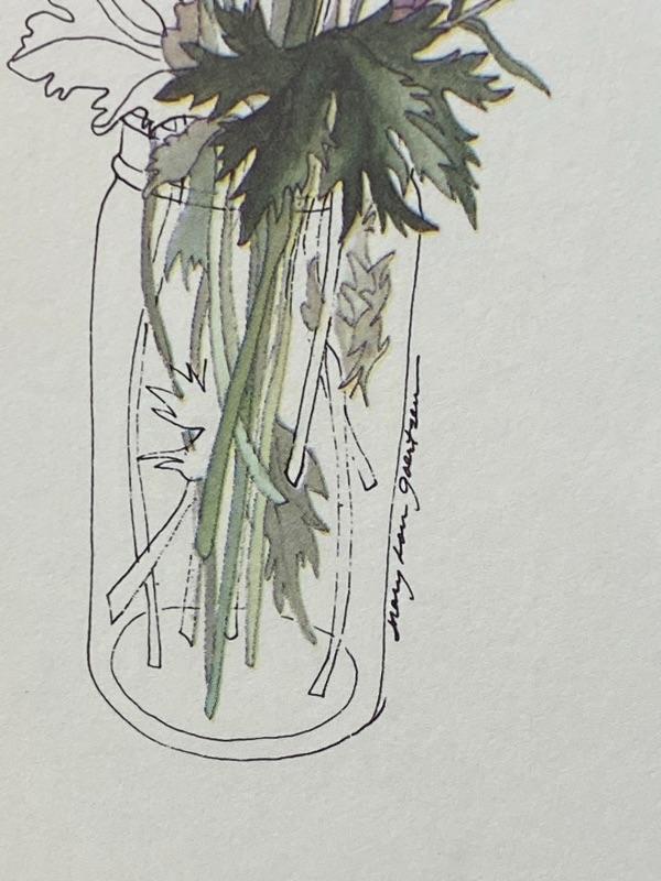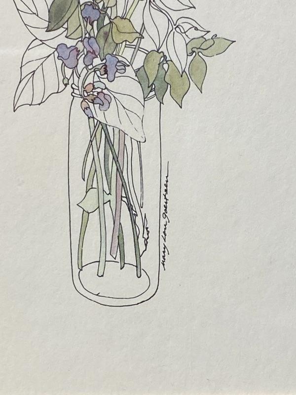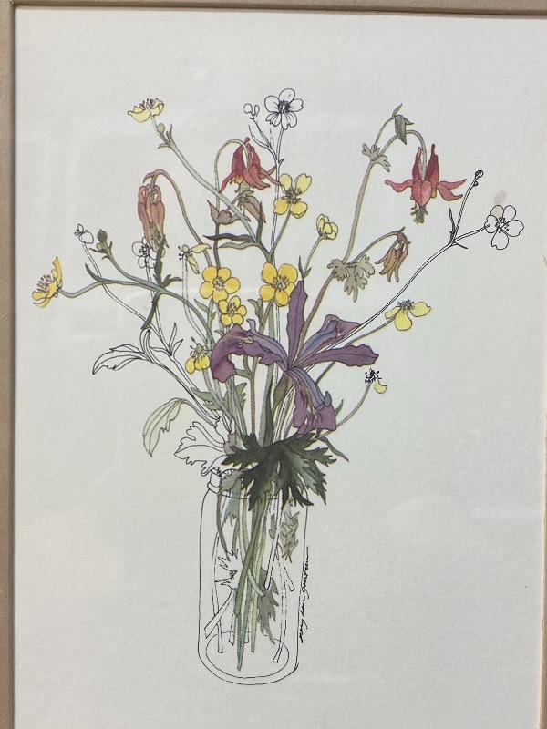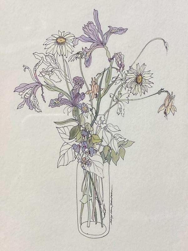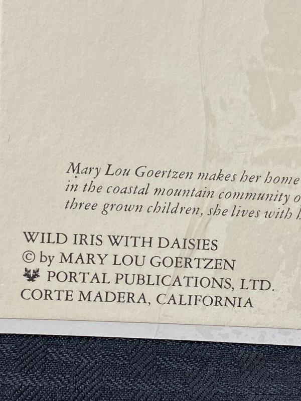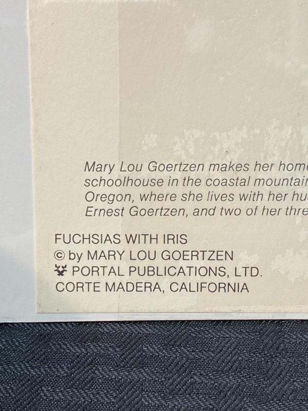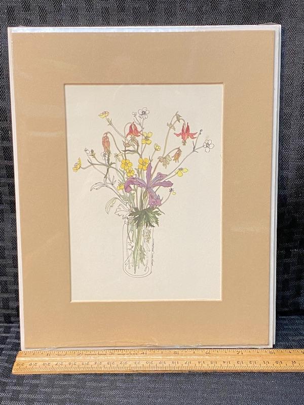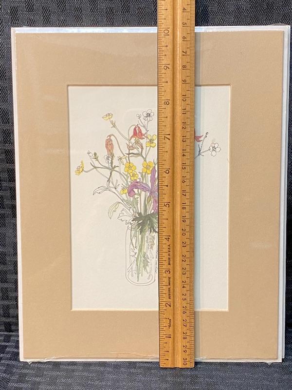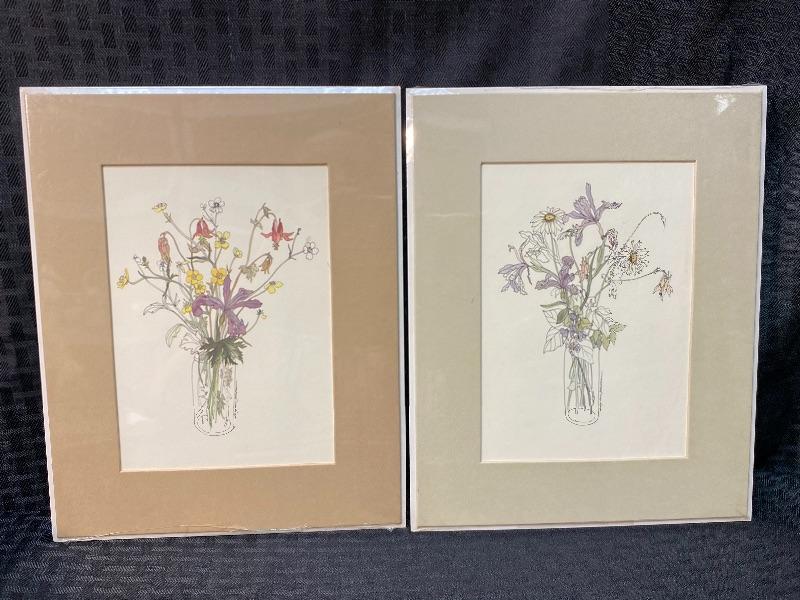 Pair of unframed matted flower lithos by Mary Luo Goertzen. "Fuchsias with Iris" & "Wild Iris with Daisies". 8x10 size. In plastic.