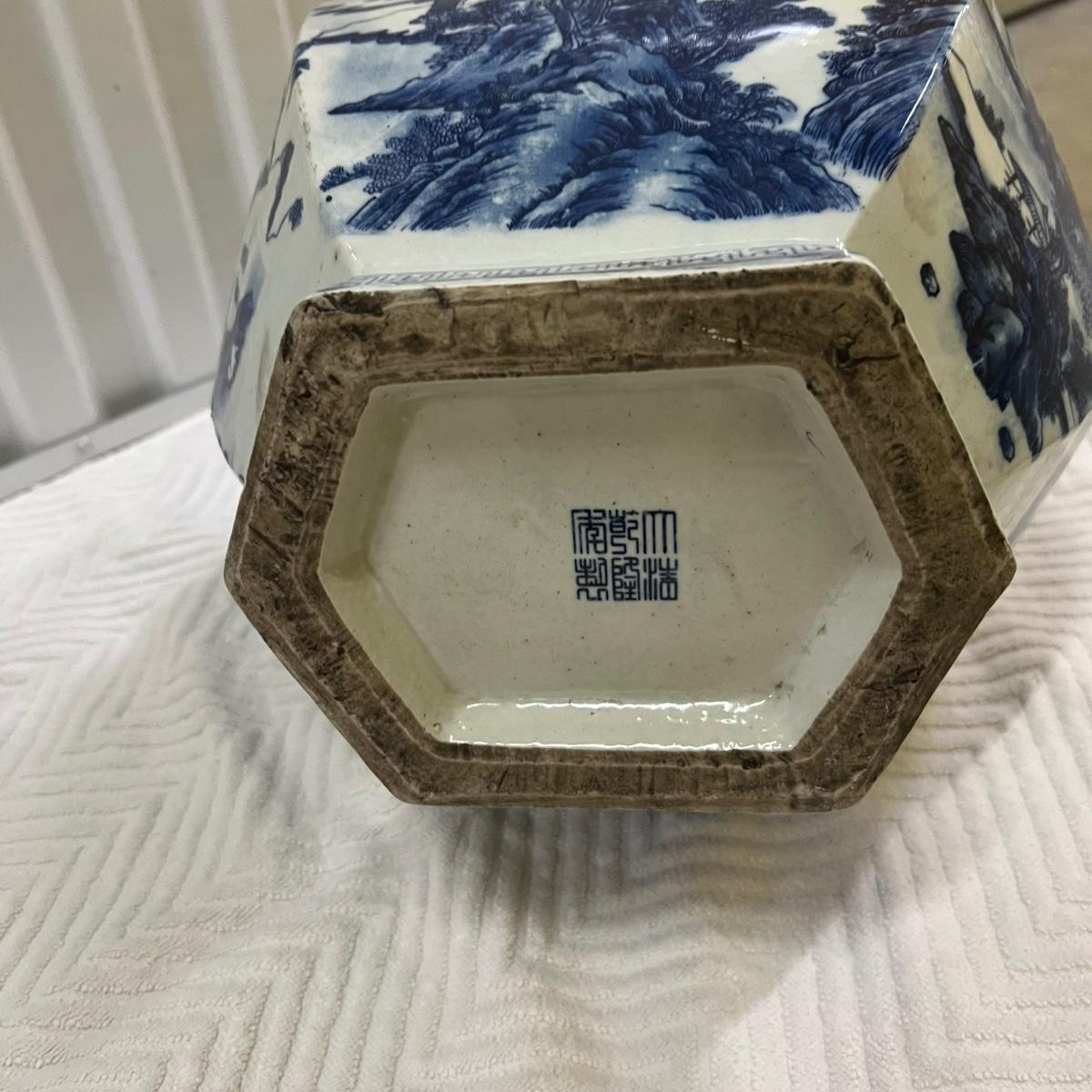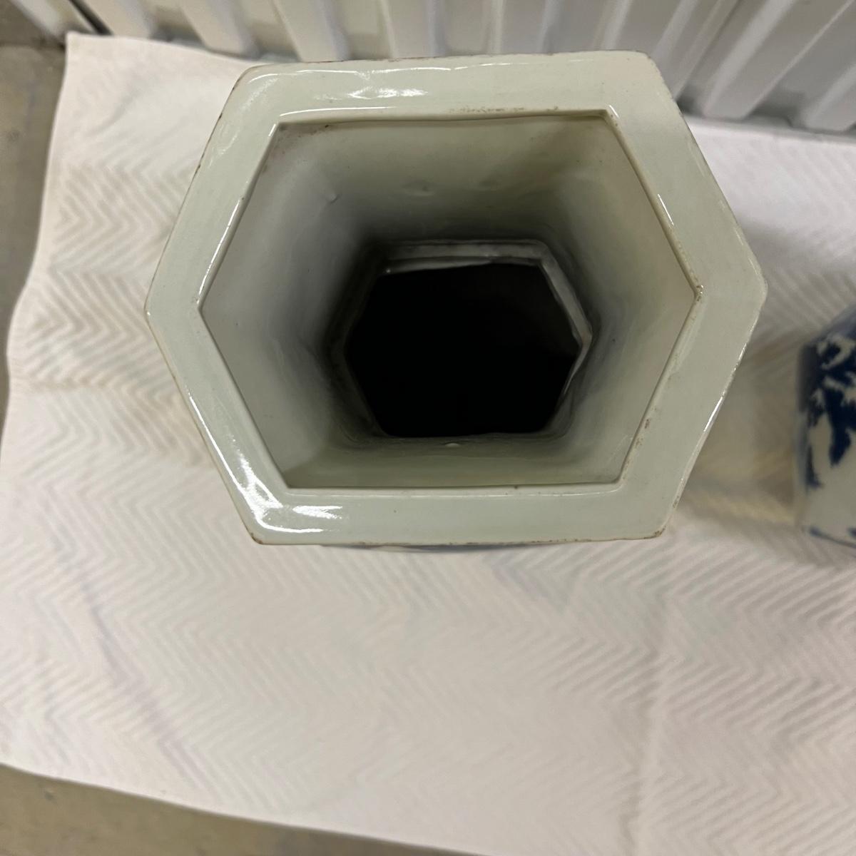Two beautiful vases are China or possibly porcelain China with a Blue design. There is a dark colored blemish on one which is shown in an image.