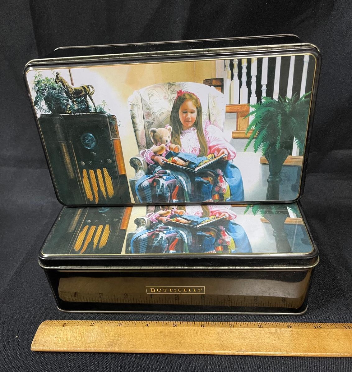 Pair of Matching Botticelli Collector Tins Girl with Bear Reading in Chair