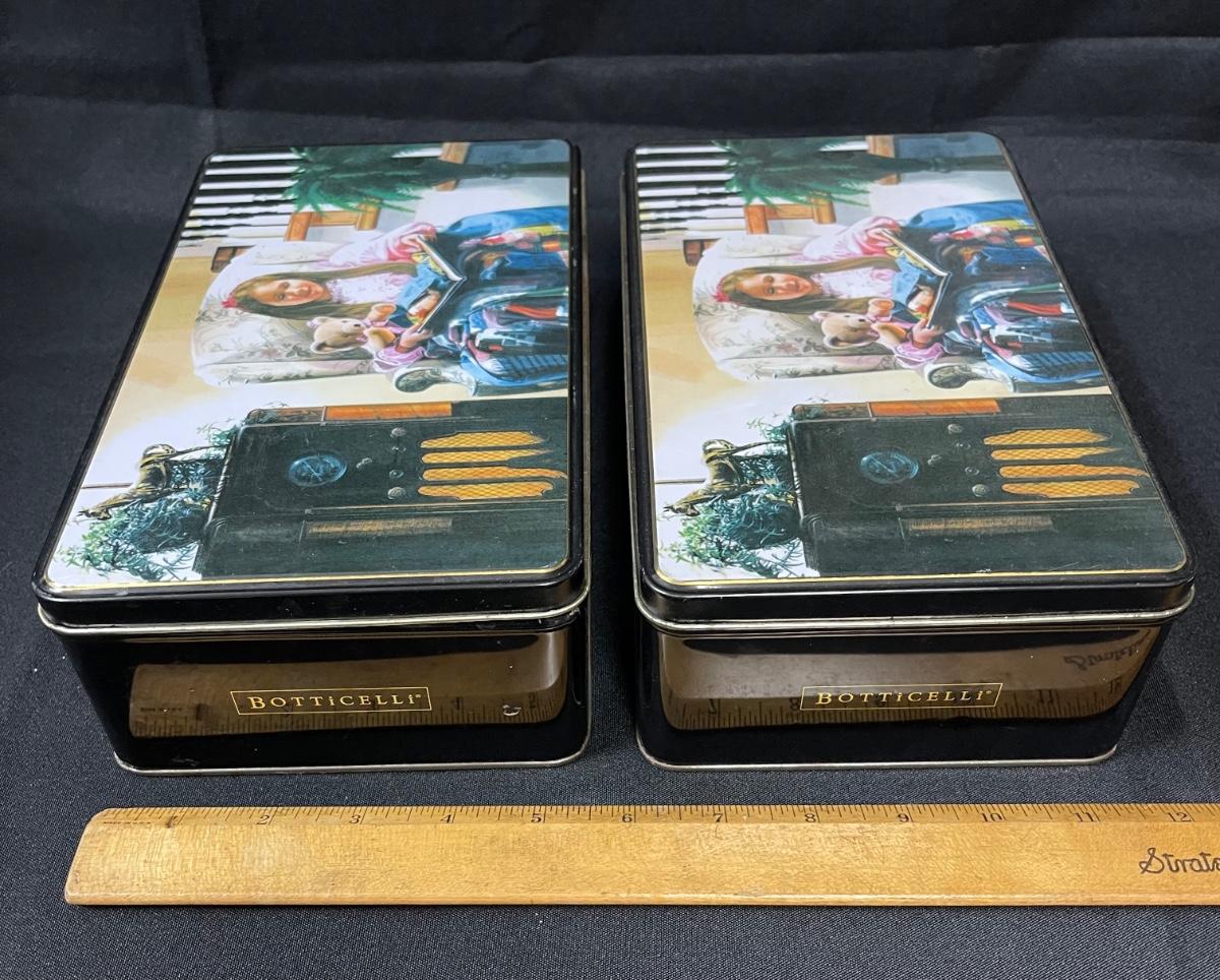 Pair of Matching Botticelli Collector Tins Girl with Bear Reading in Chair. In fair condition. About 10" length.