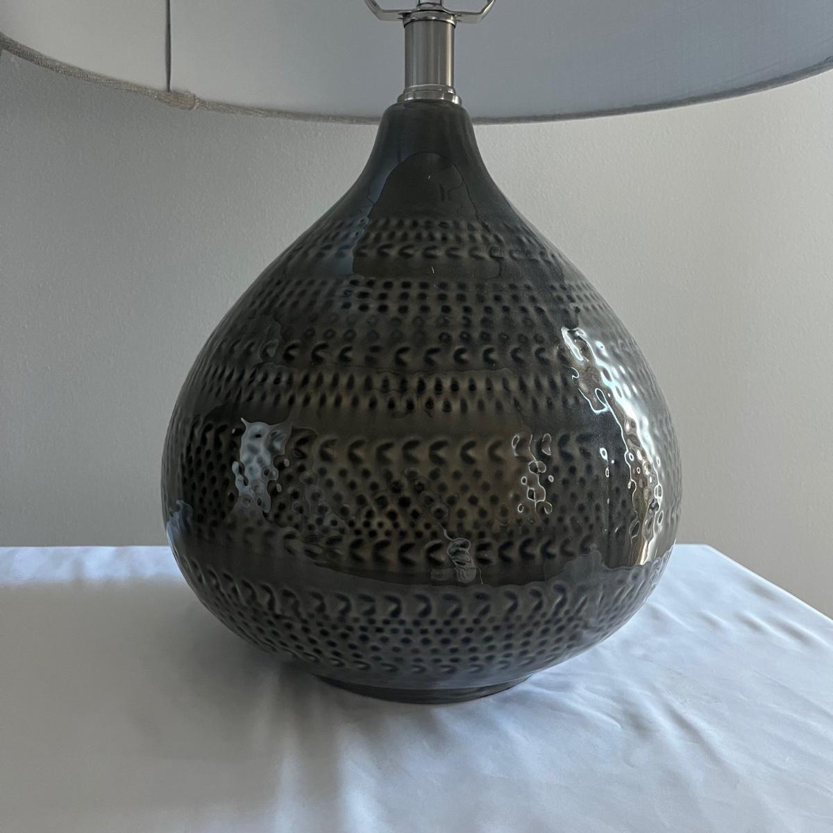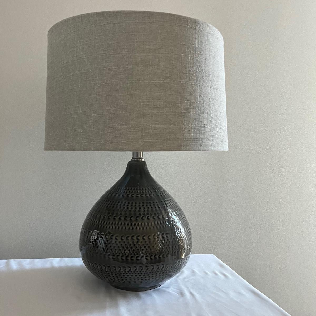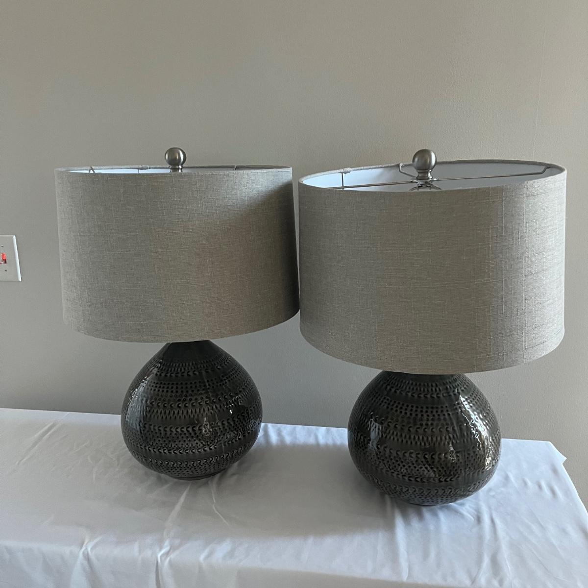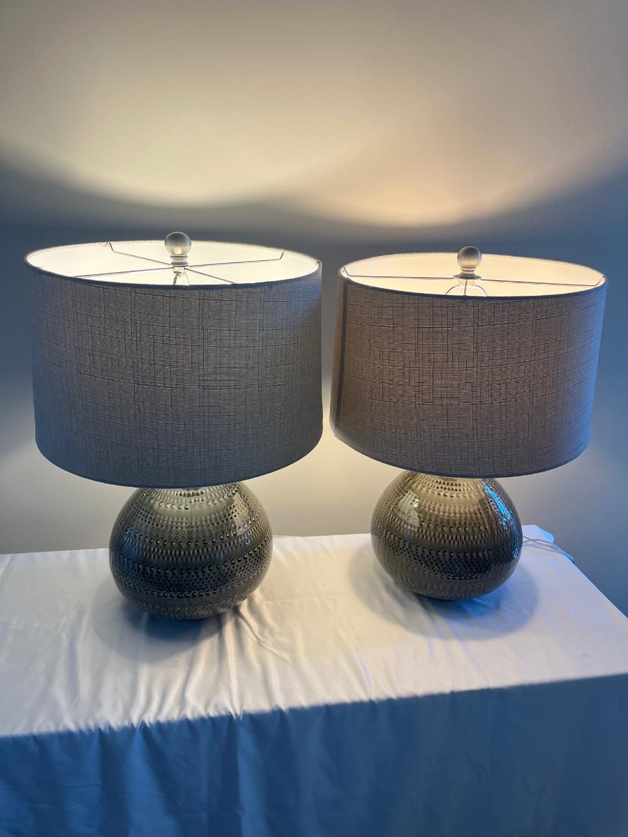 Lot includes a pair of matching ceramic table lamps with matching shades. Base of lamps are gray and shades are gray with a square pattern. Lamps measure 10”D x 23” tall without shade. Both lamps worked when tested.