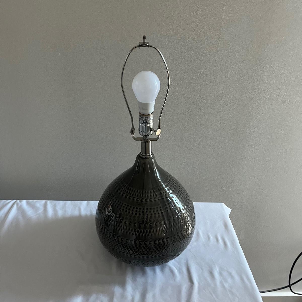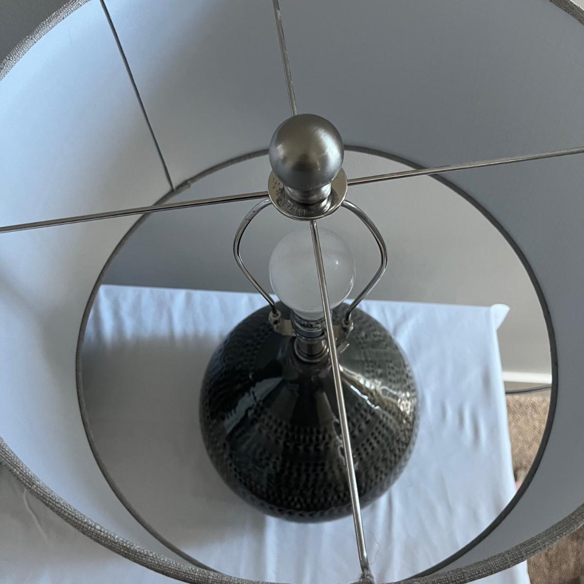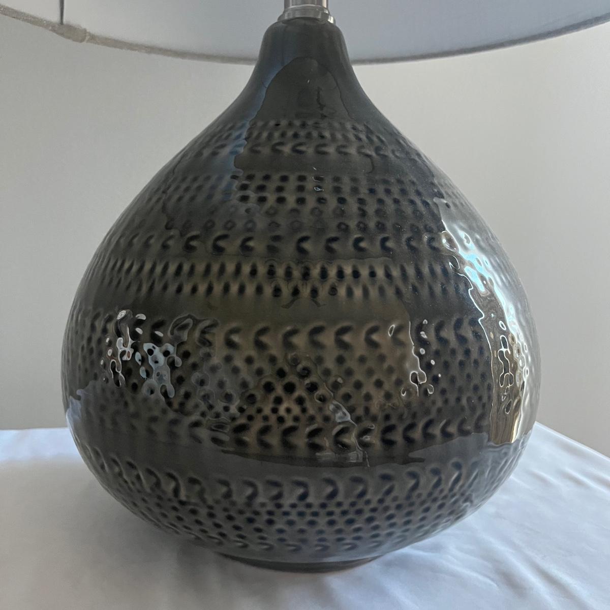 Lot includes a pair of matching ceramic table lamps with matching shades. Base of lamps are gray and shades are gray with a square pattern. Lamps measure 10”D x 23” tall without shade. Both lamps worked when tested.