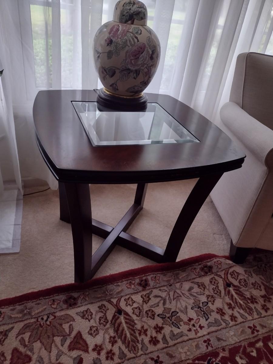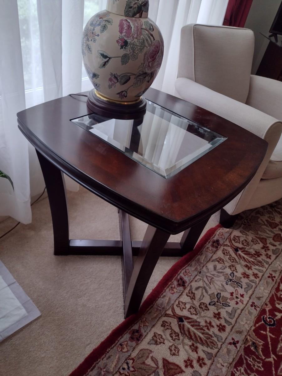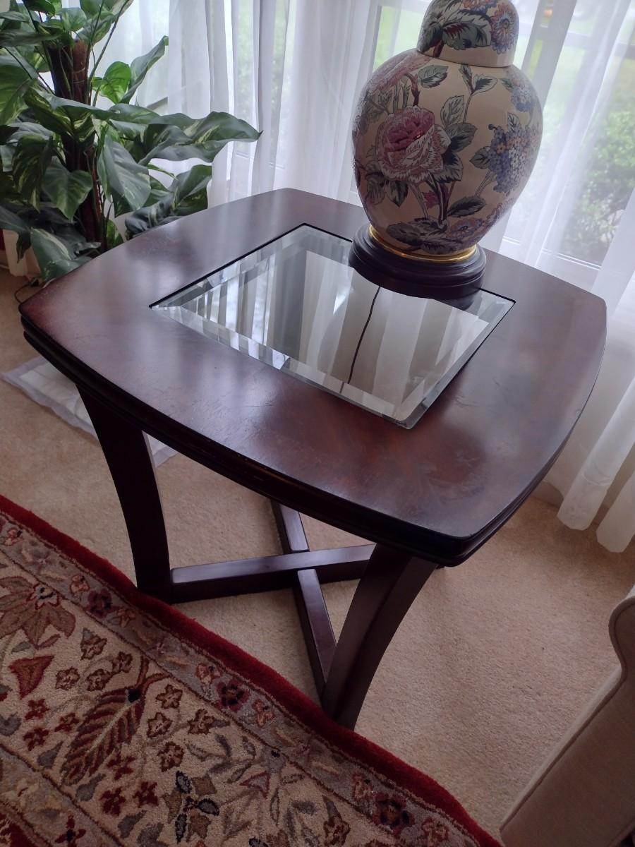 Pair of Matching Espresso Wood Finish Side Tables. One table has some scuffing on the edge as shown.