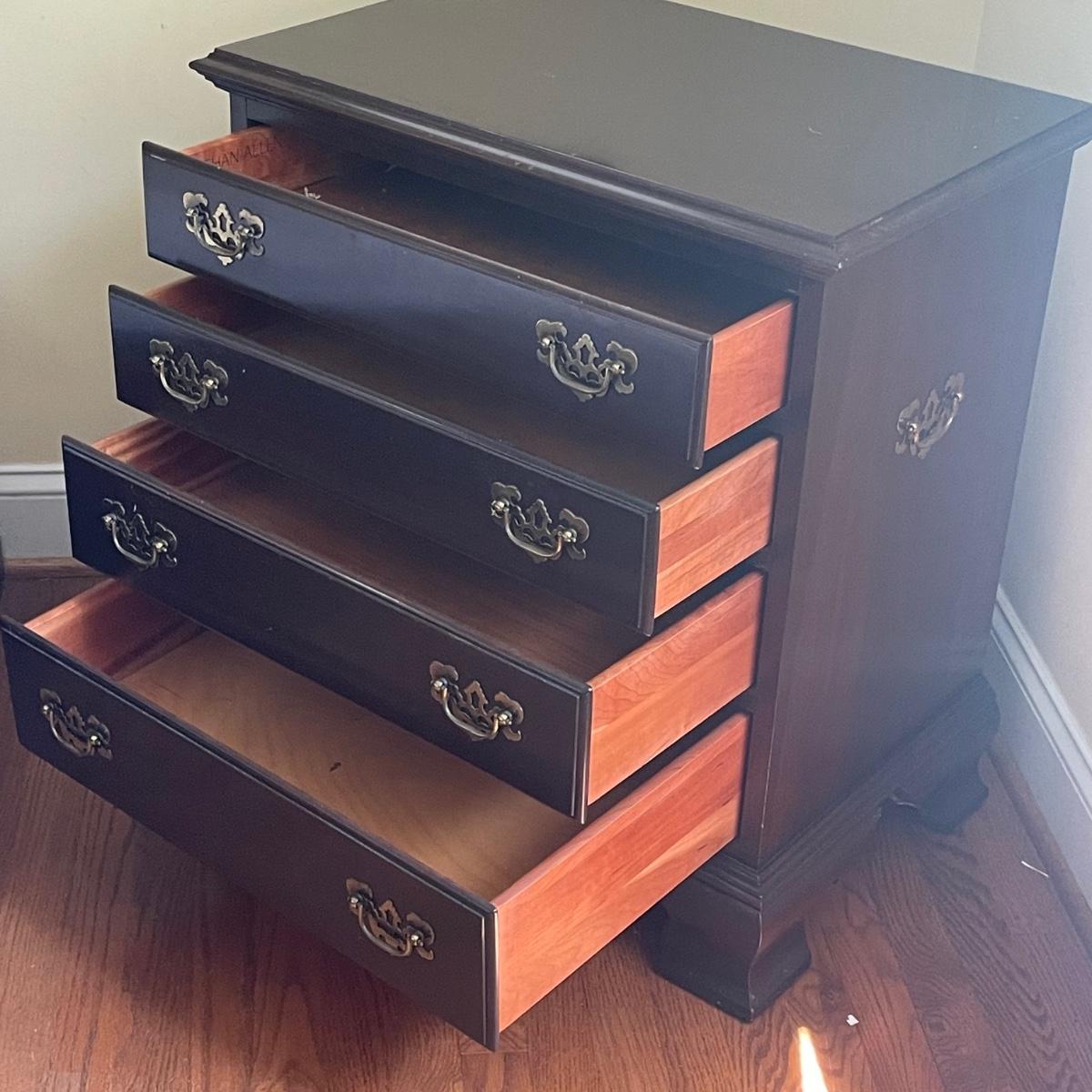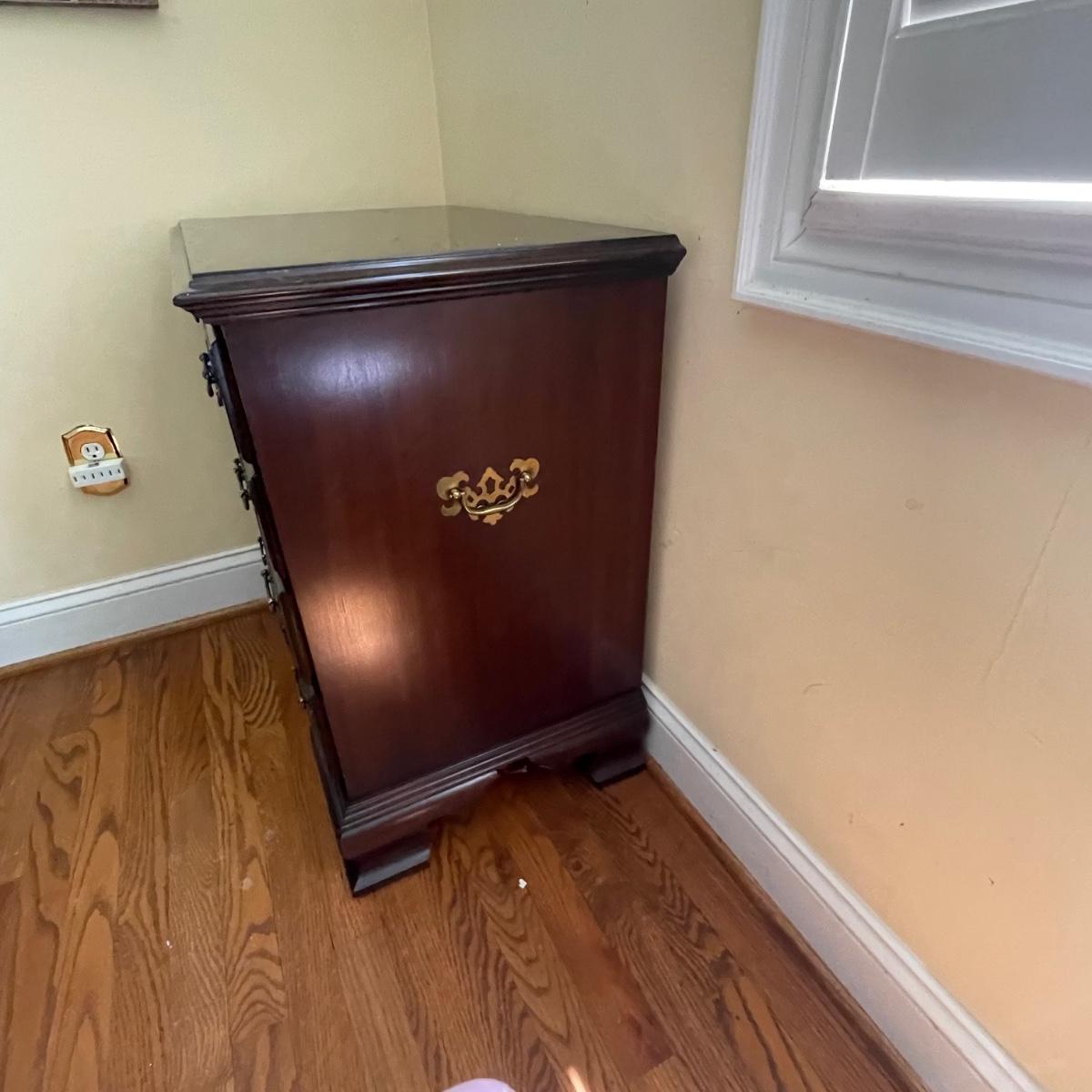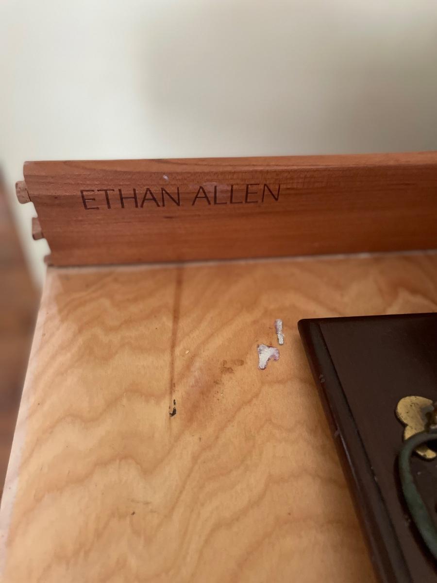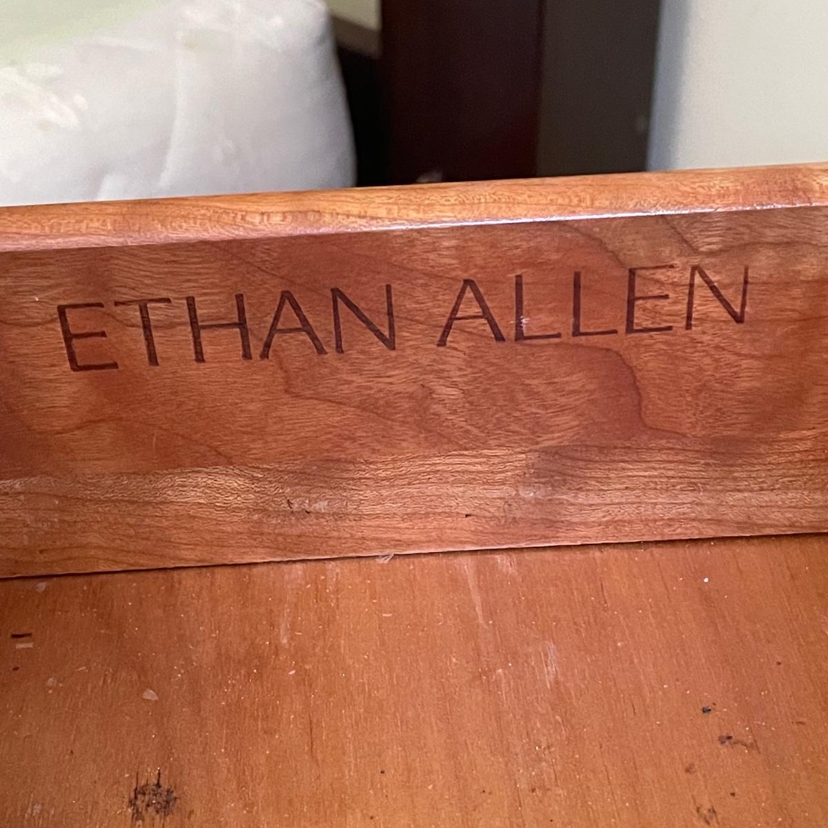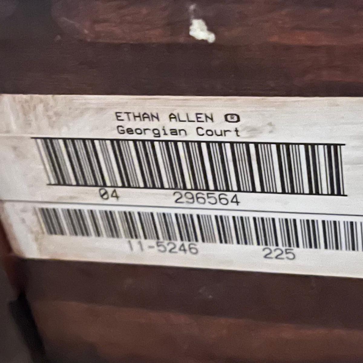 This matching pair of Ethan Allen end tables are solid cherry wood with brass hardware and from the Georgian Court collection and match a four poster bed and a dresser in other lots. Drawers are dovetailed. The front of one drawer has come off but should be an easy fix. They are in good condition otherwise, with just a few minor scratches.
