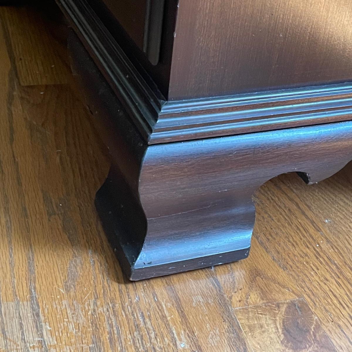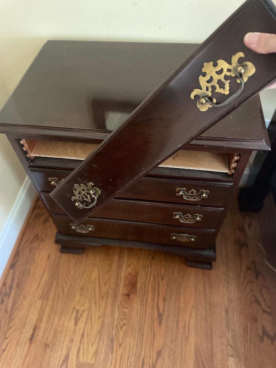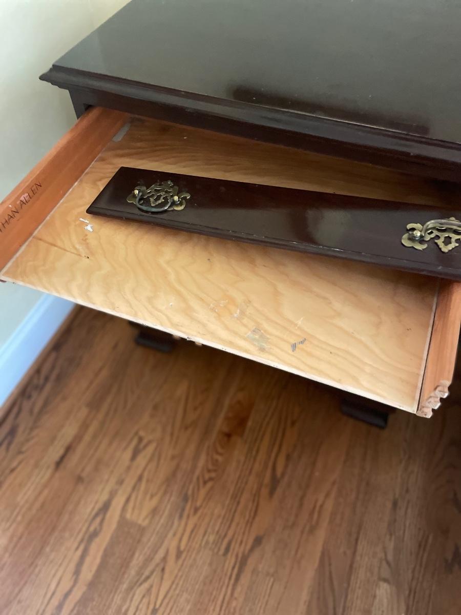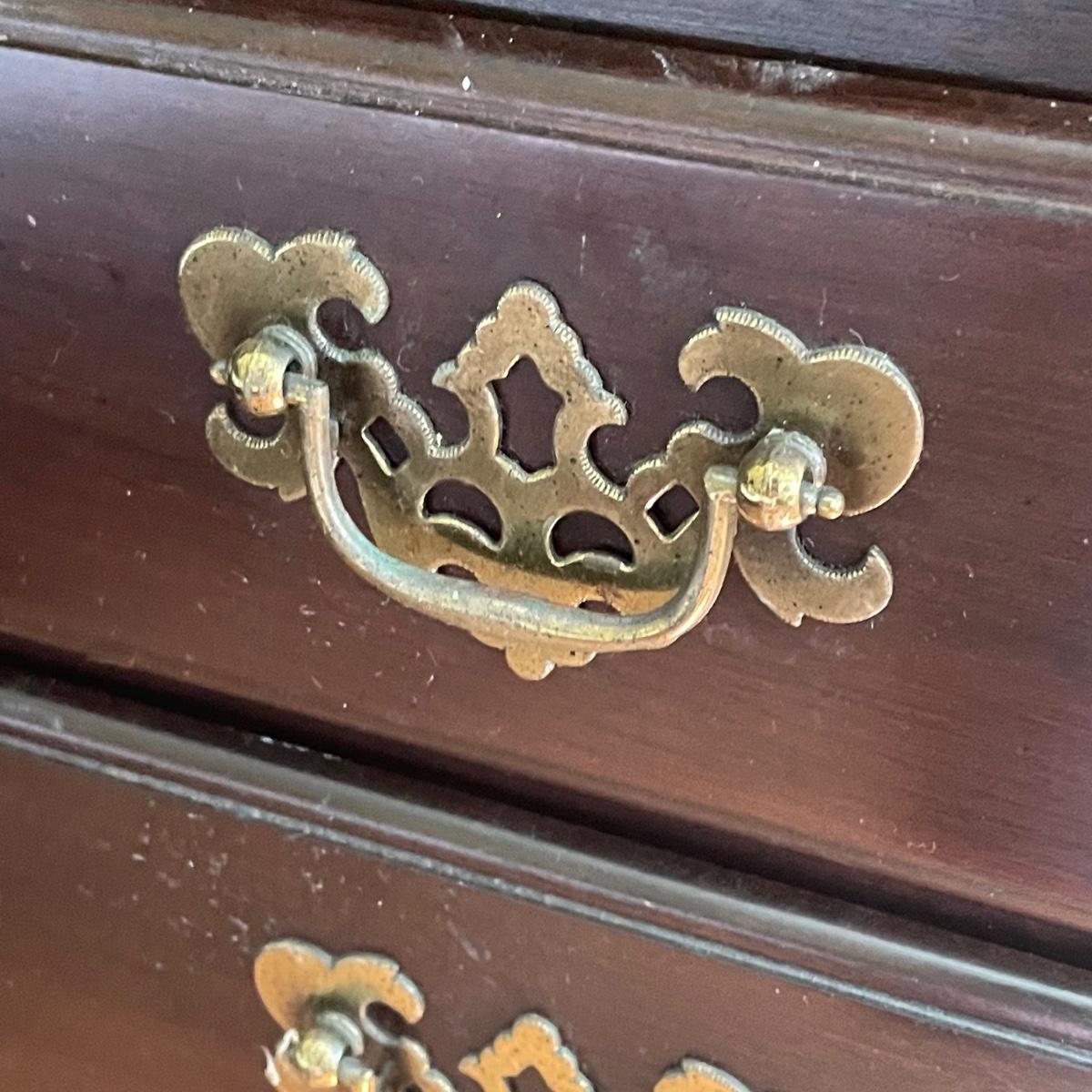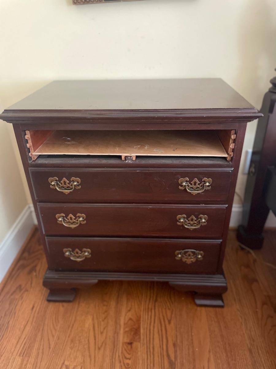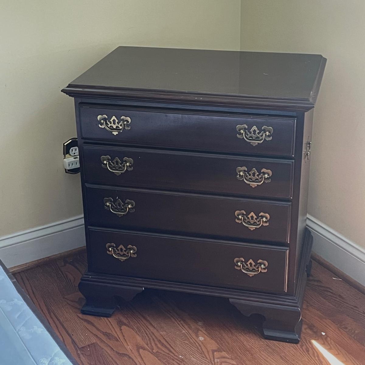 This matching pair of Ethan Allen end tables are solid cherry wood with brass hardware and from the Georgian Court collection and match a four poster bed and a dresser in other lots. Drawers are dovetailed. The front of one drawer has come off but should be an easy fix. They are in good condition otherwise, with just a few minor scratches.