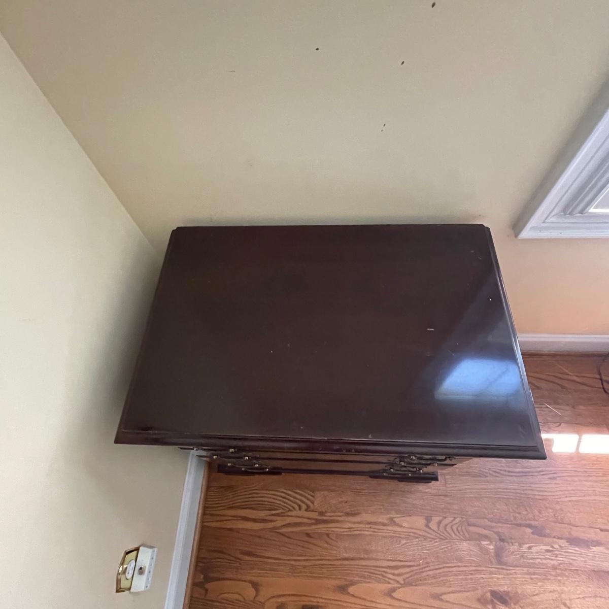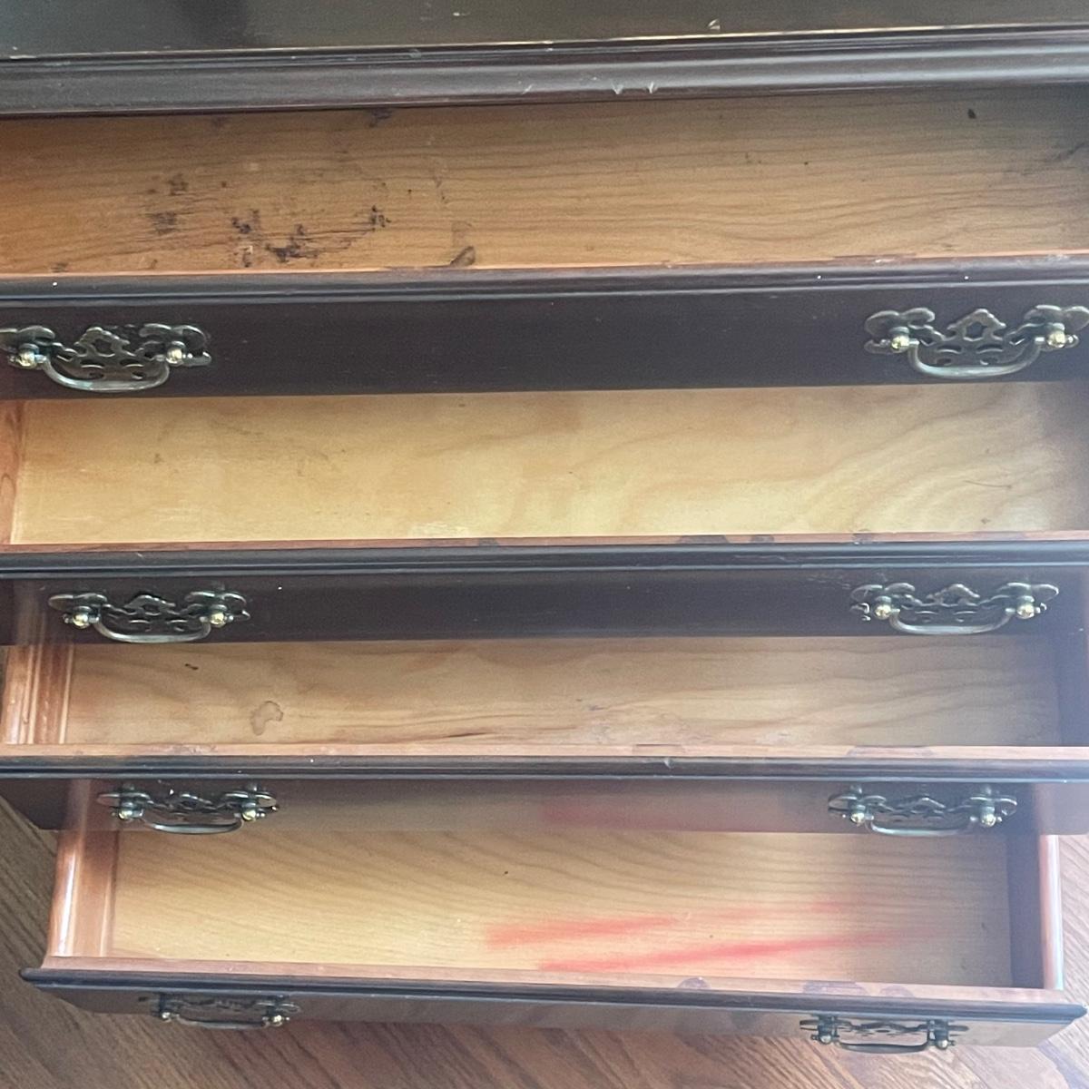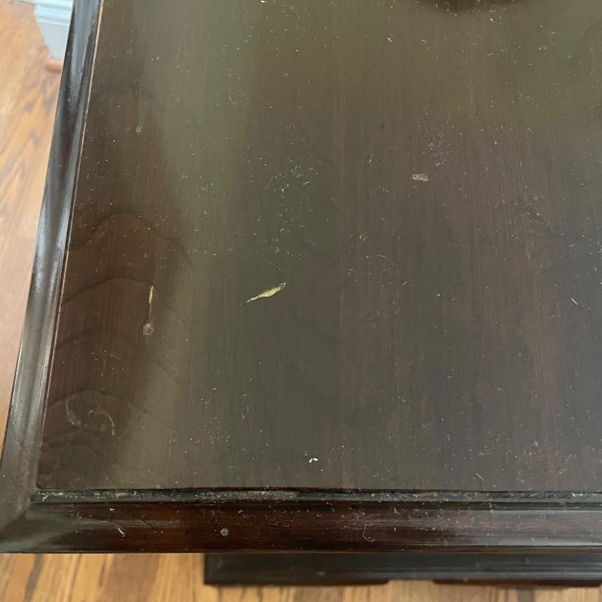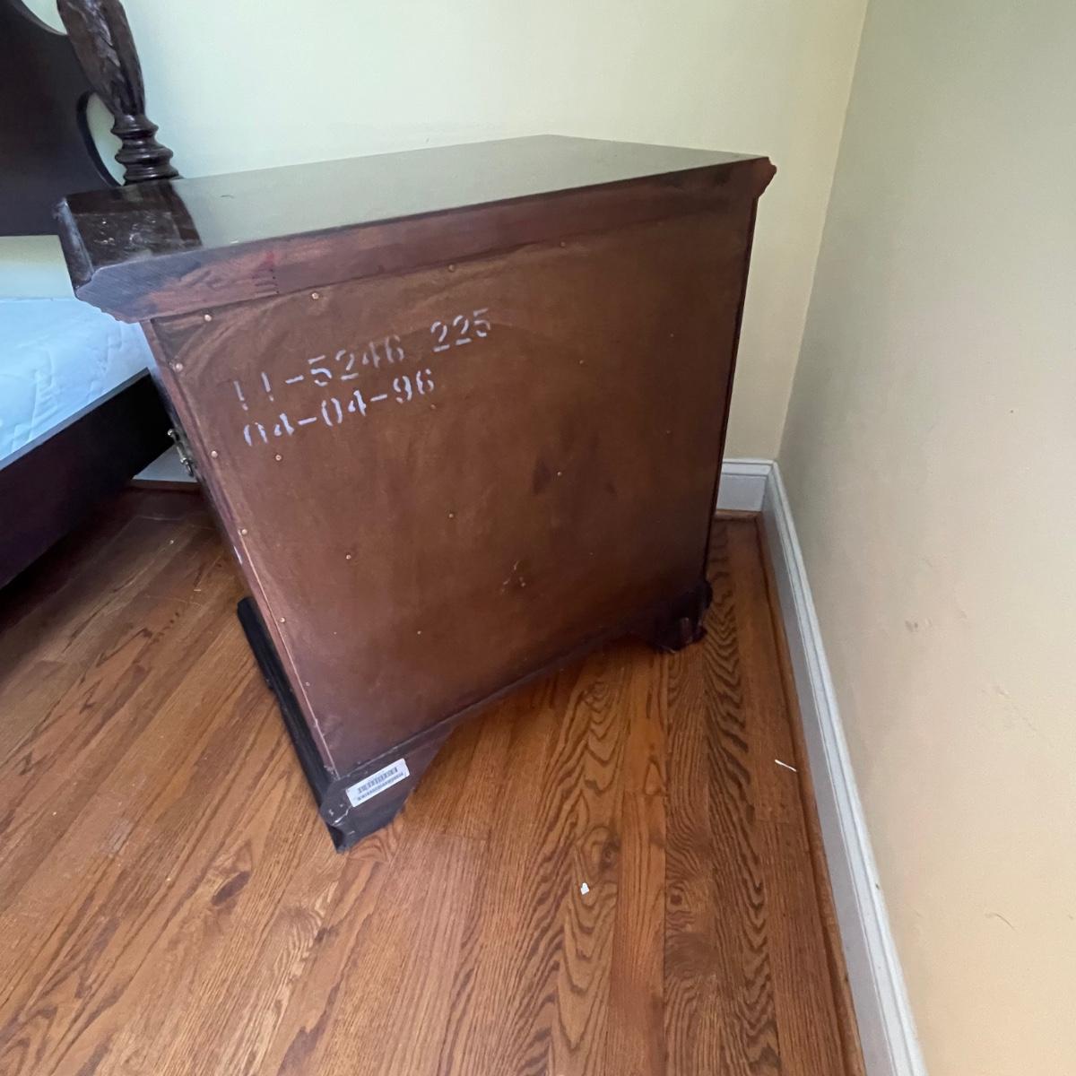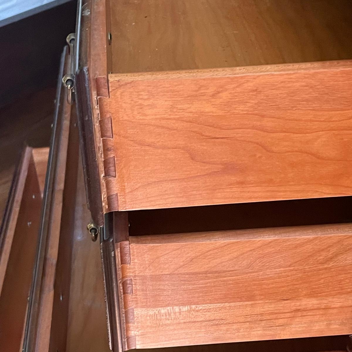 This matching pair of Ethan Allen end tables are solid cherry wood with brass hardware and from the Georgian Court collection and match a four poster bed and a dresser in other lots. Drawers are dovetailed. The front of one drawer has come off but should be an easy fix. They are in good condition otherwise, with just a few minor scratches.
