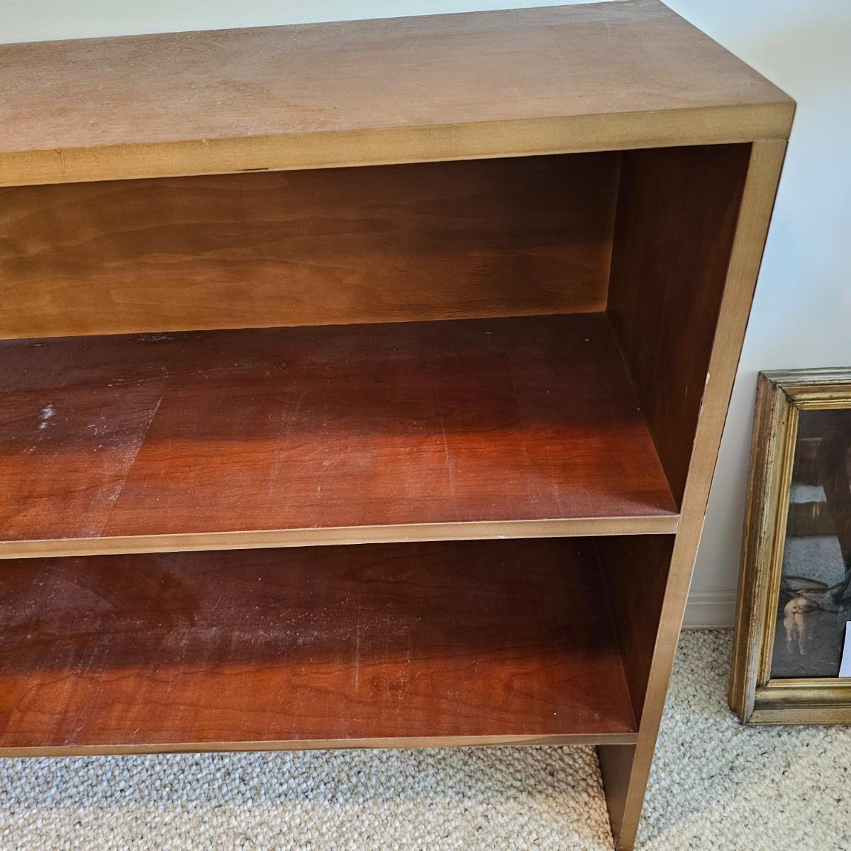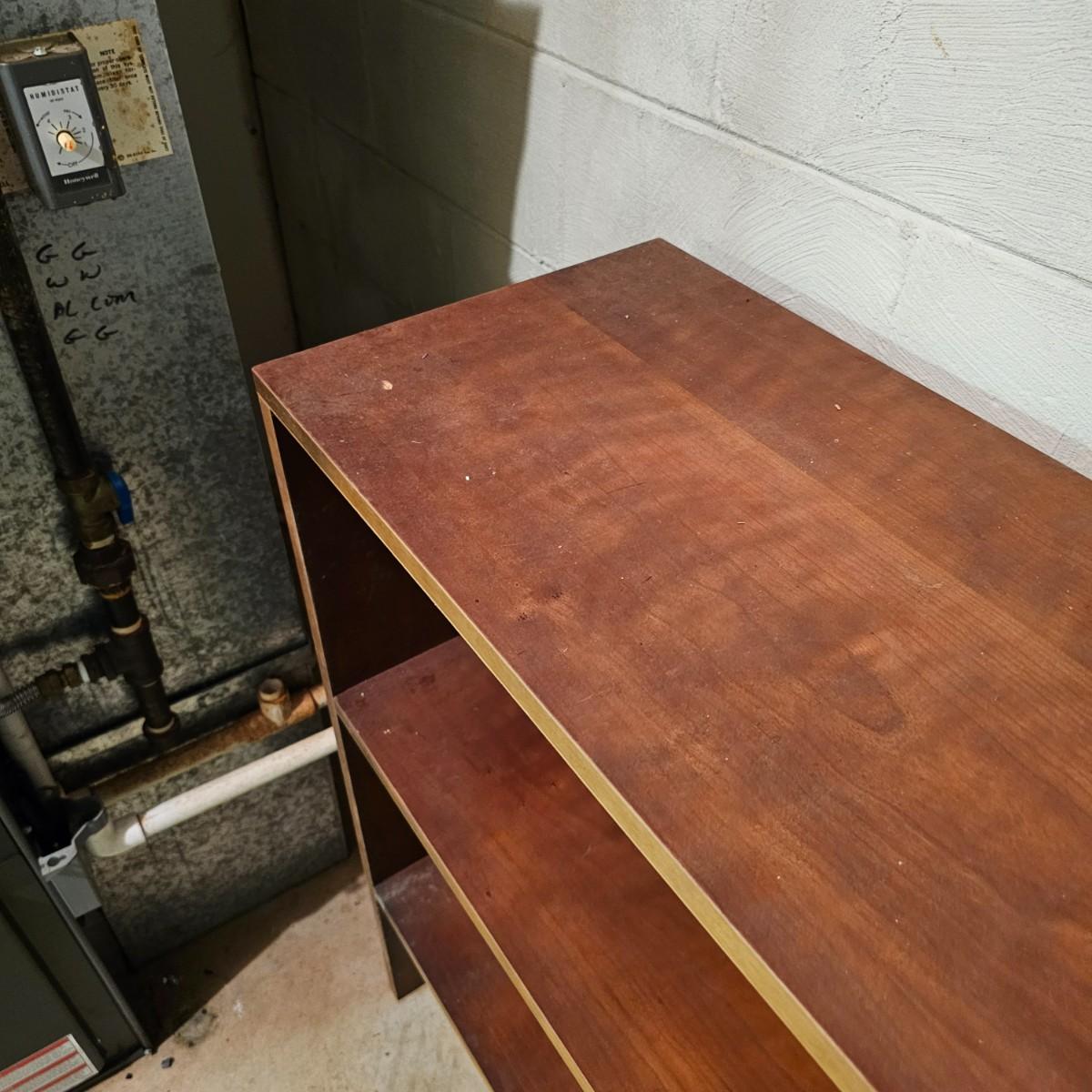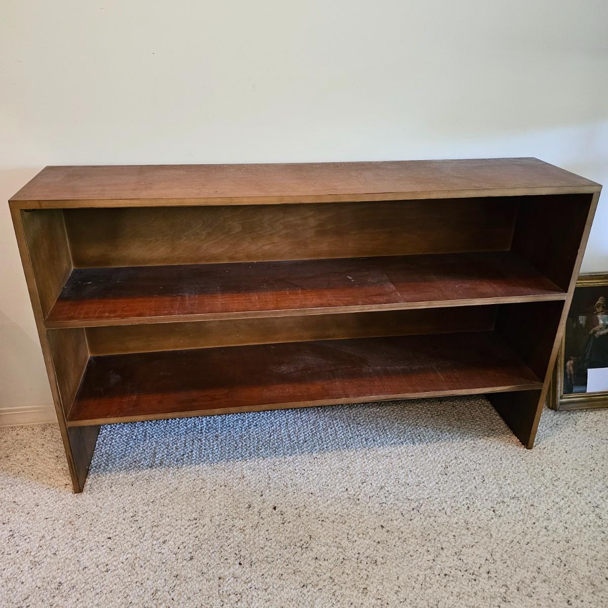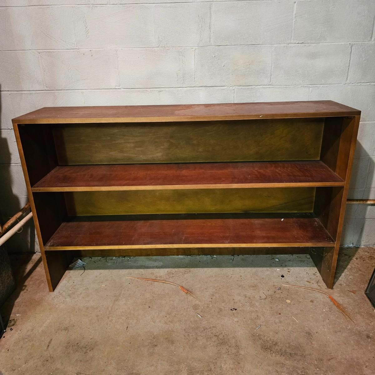 Two matching two shelf units in dark wood. Each piece measures 60" x 14' x 37"H. Units are in adjoining rooms in basement. See photos for details. Local pickup only. Winning bidder must bring assistance to help move and load this item due to its weight and/or size.