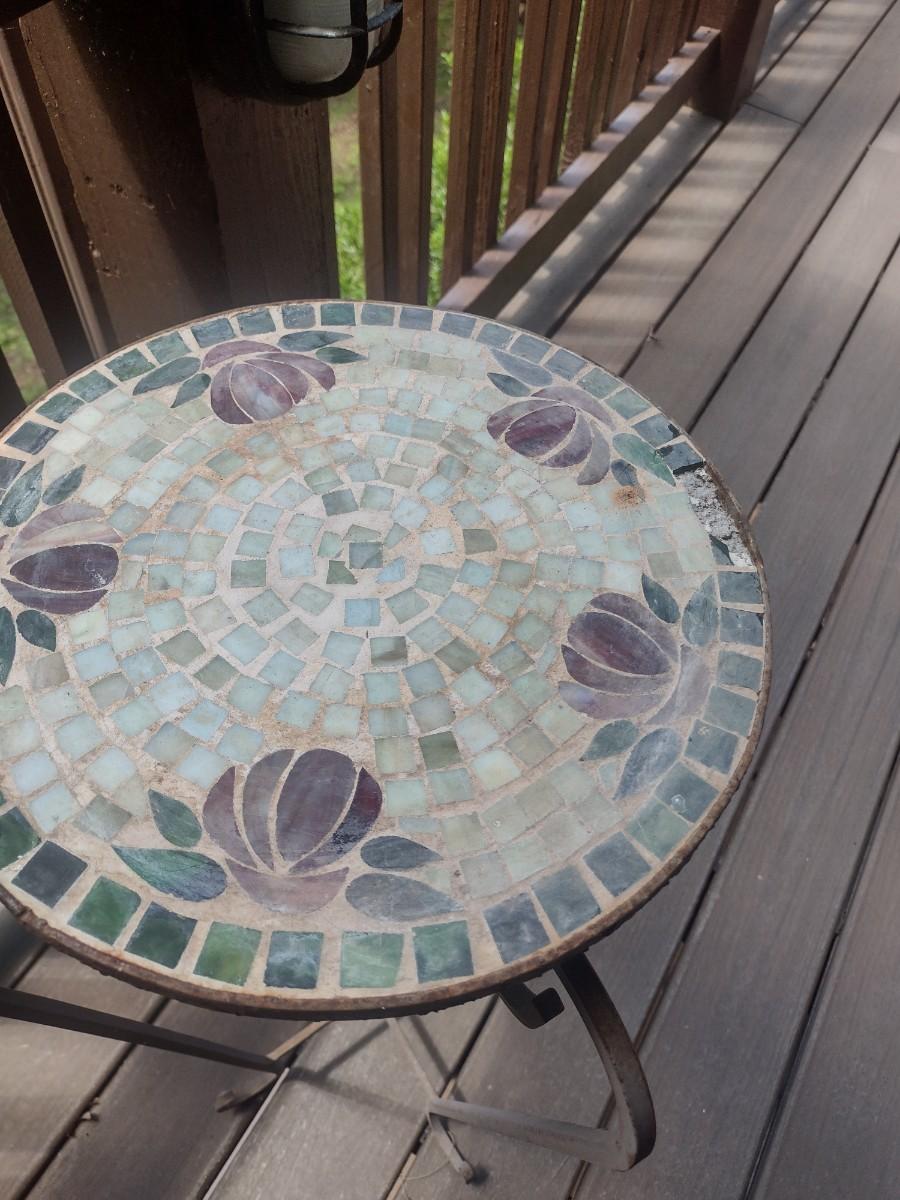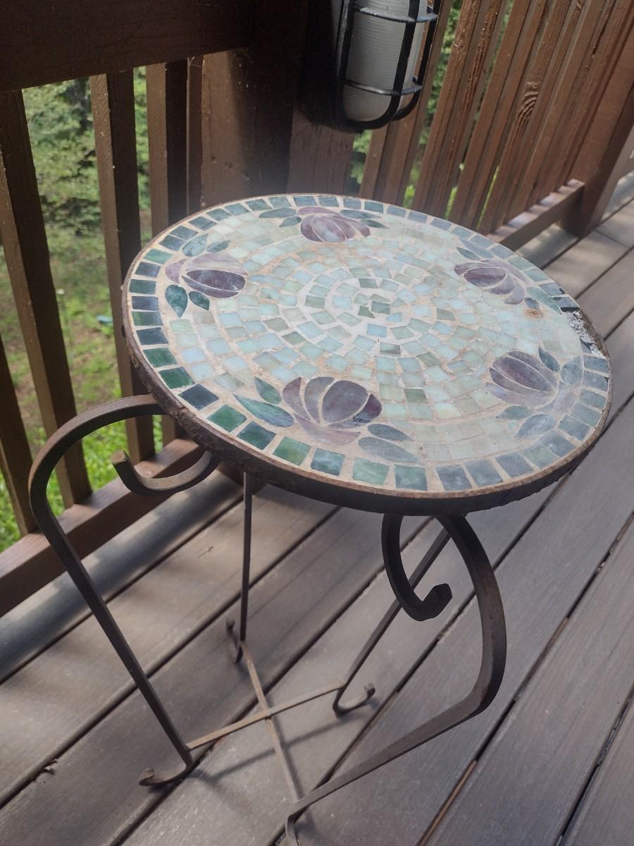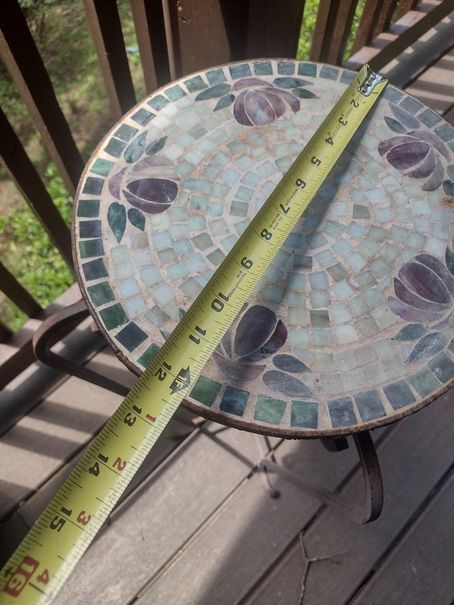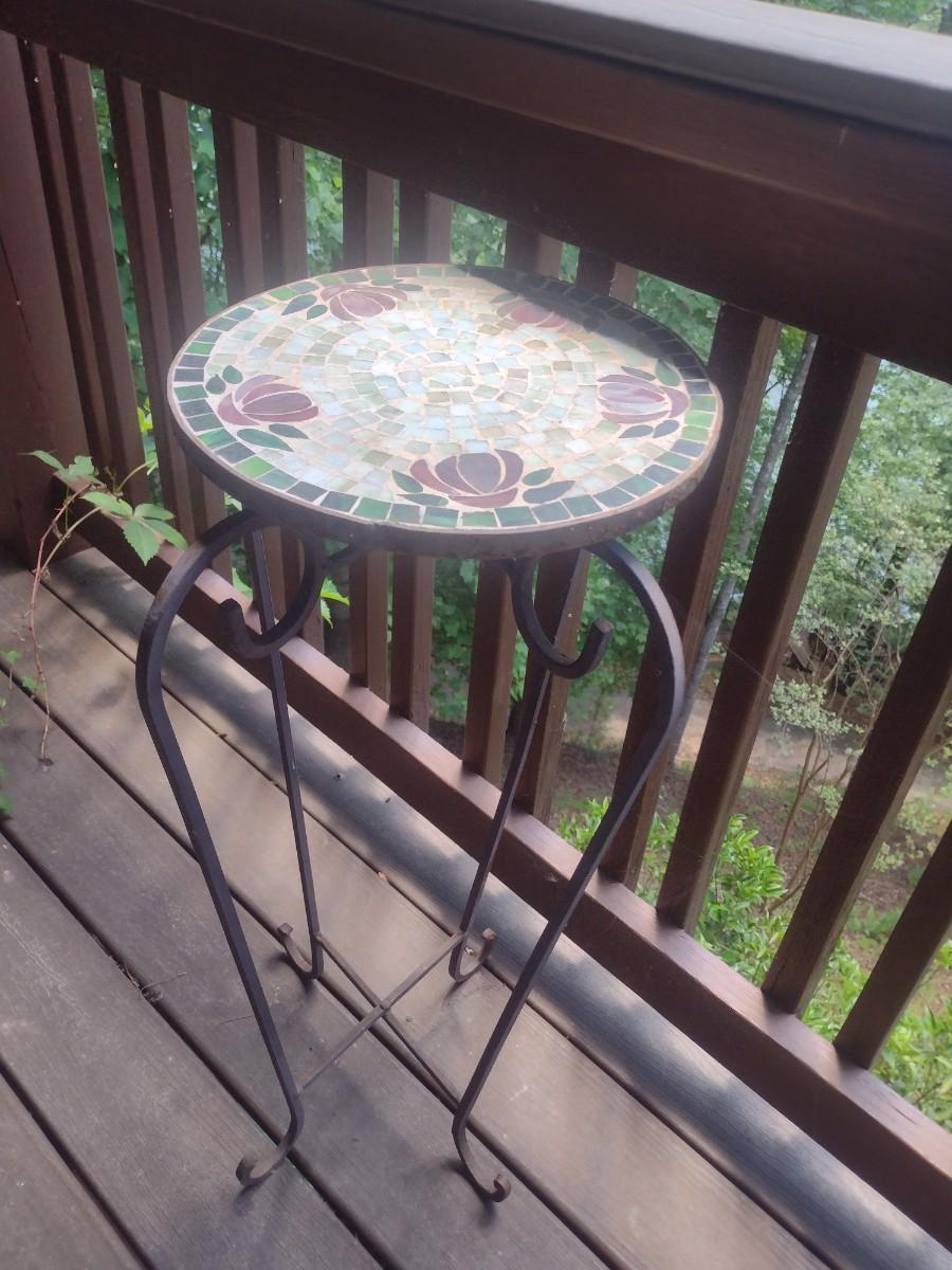 Pair of Matching Mosaic Tile Top Metal Base Plant Stands. One of the stands has tile missing as shown.