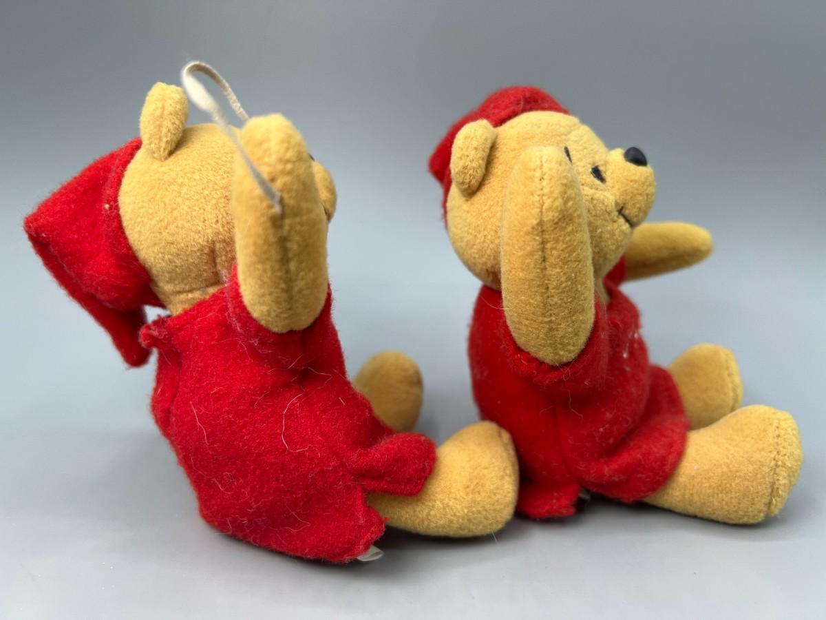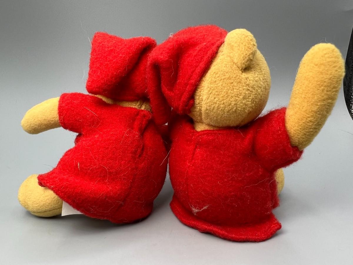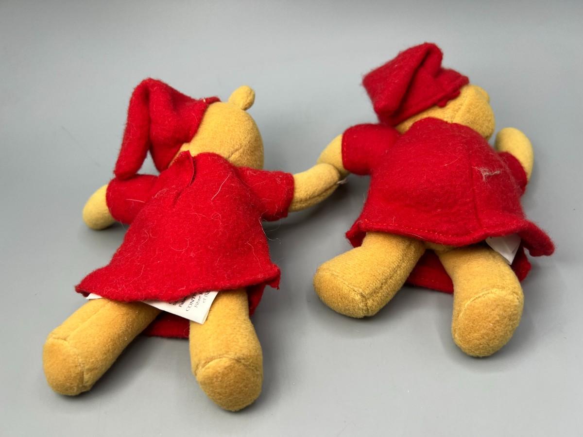 Pair of Matching PJ Wearing Winnie the Pooh Plush Stuffed Bears. Wearing red nightshirt and cap. One has a string on hand like it may have held something at one time. Both are in good, displayed condition. May be dusty from display and storage.