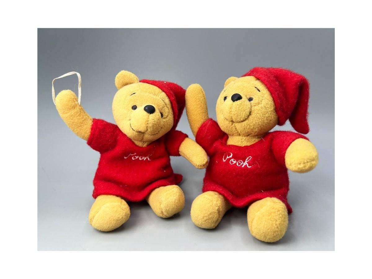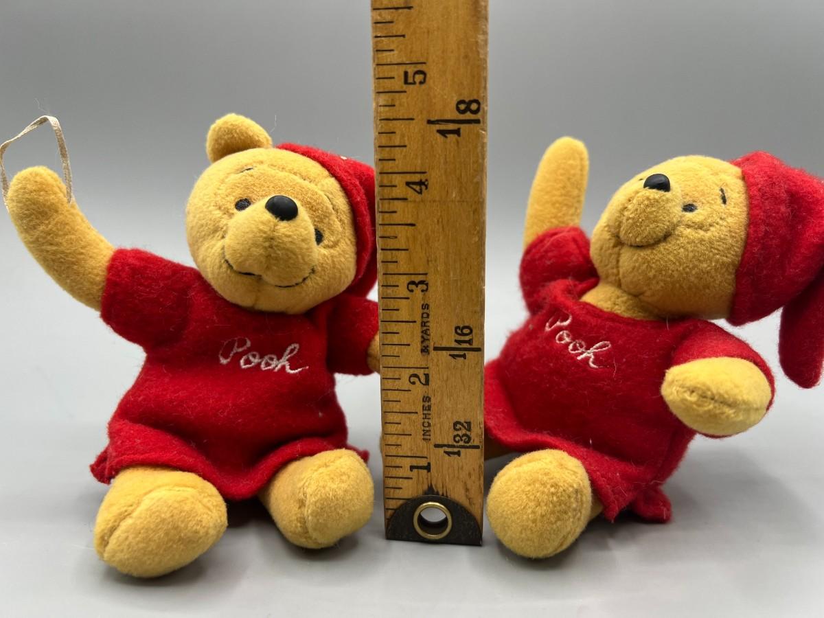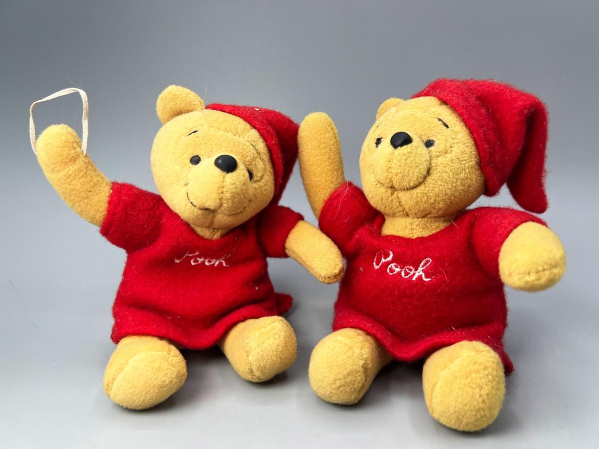 Pair of Matching PJ Wearing Winnie the Pooh Plush Stuffed Bears. Wearing red nightshirt and cap. One has a string on hand like it may have held something at one time. Both are in good, displayed condition. May be dusty from display and storage.