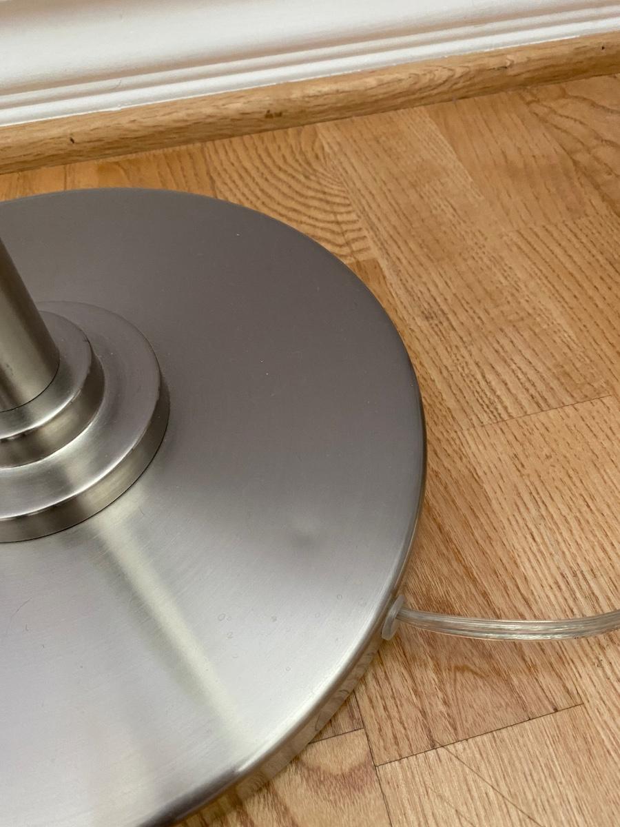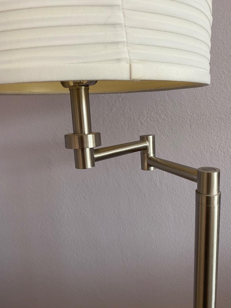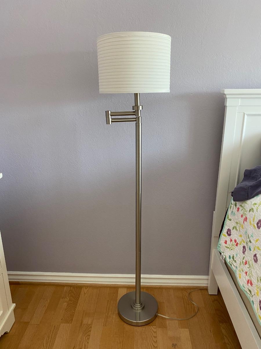 Pair of matching lighting fixtures. A floor lamp and one table lamp. Silver tone metal with white lamp shades. Lamps have a moveable arm to adjust light source. Great for reading, you can move the light closer. Good used condition. The floor lamp has a couple dings in base, nothing to bad.
