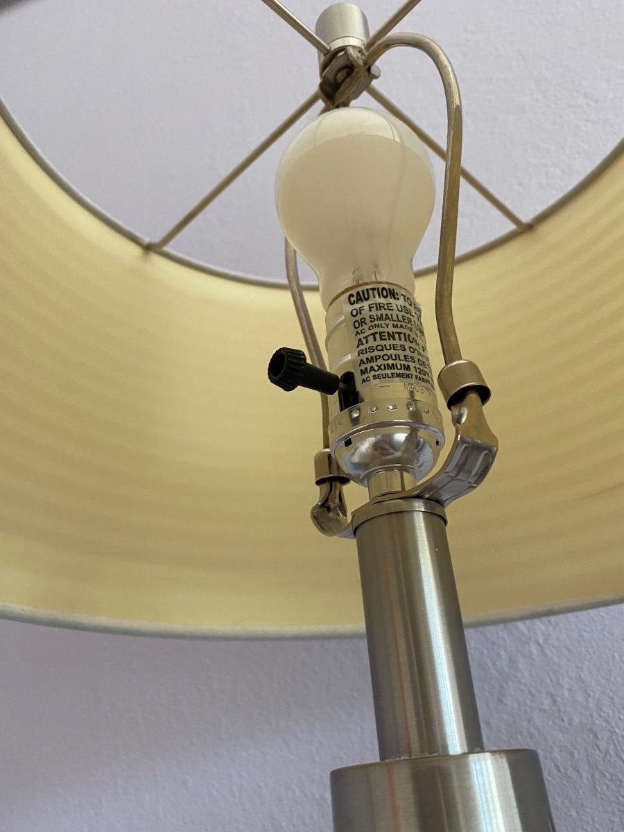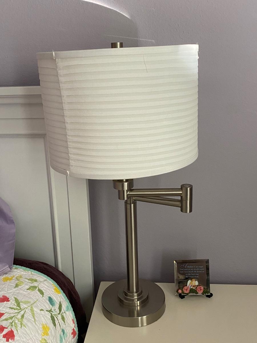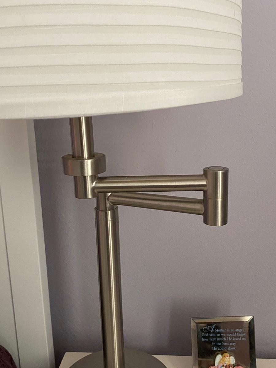 Pair of matching lighting fixtures. A floor lamp and one table lamp. Silver tone metal with white lamp shades. Lamps have a moveable arm to adjust light source. Great for reading, you can move the light closer. Good used condition. The floor lamp has a couple dings in base, nothing to bad.