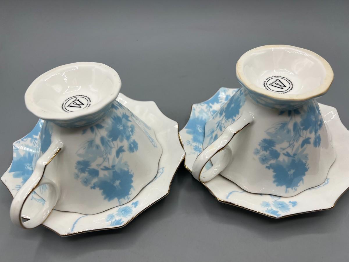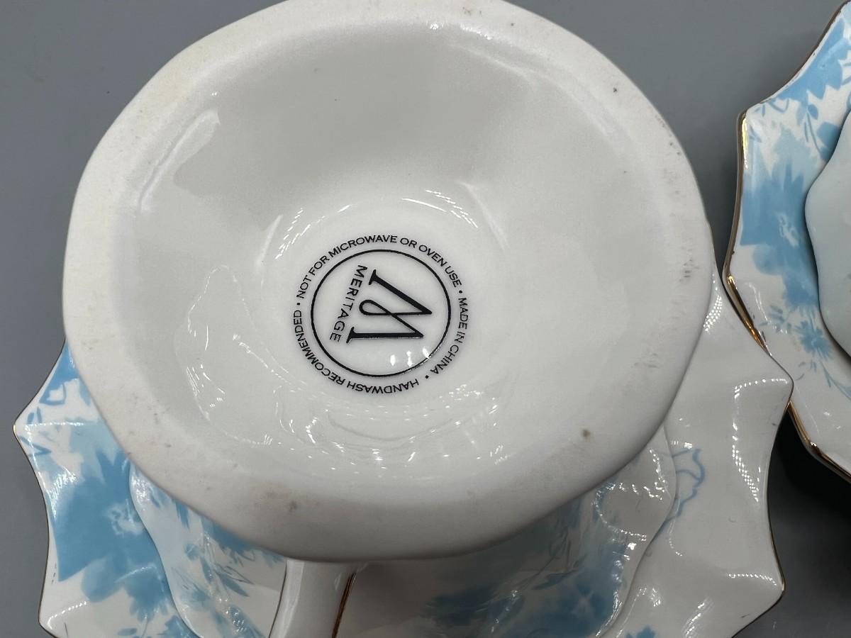 Pair of Matching White & Blue Springtime Easter Themed Teacups with Saucers. Stamped on the bottom. Made by Meritage. Good condition.