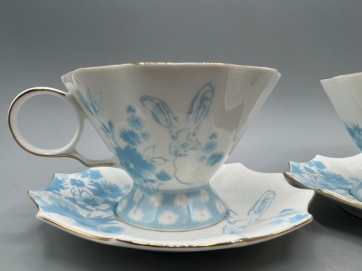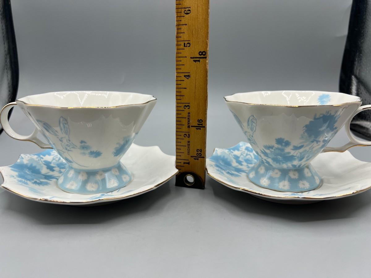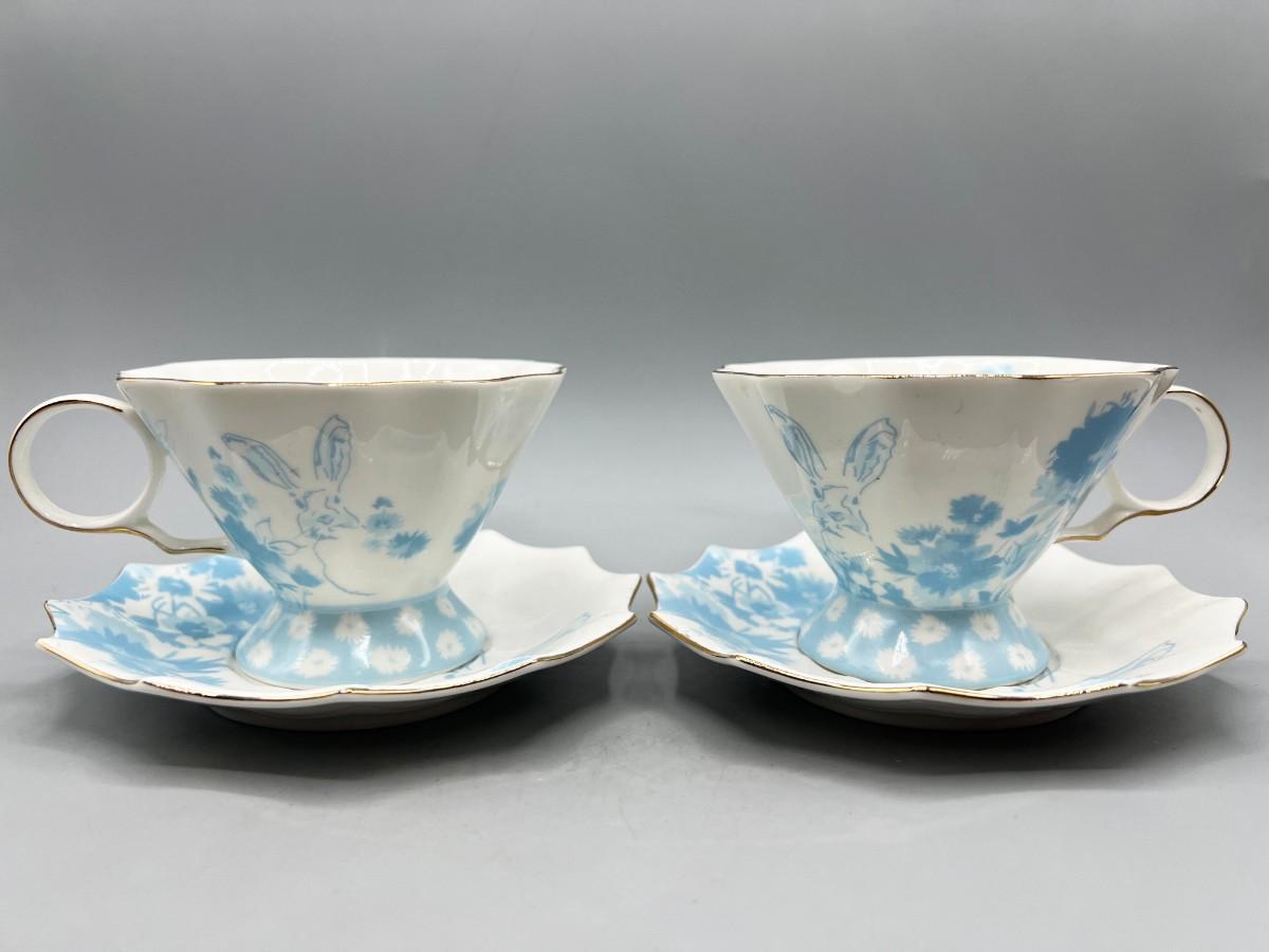 Pair of Matching White & Blue Springtime Easter Themed Teacups with Saucers