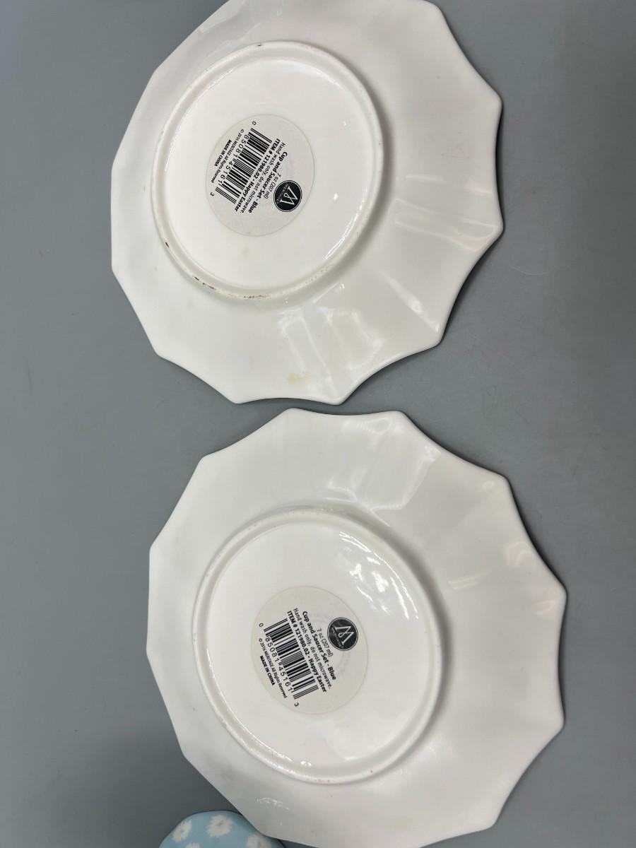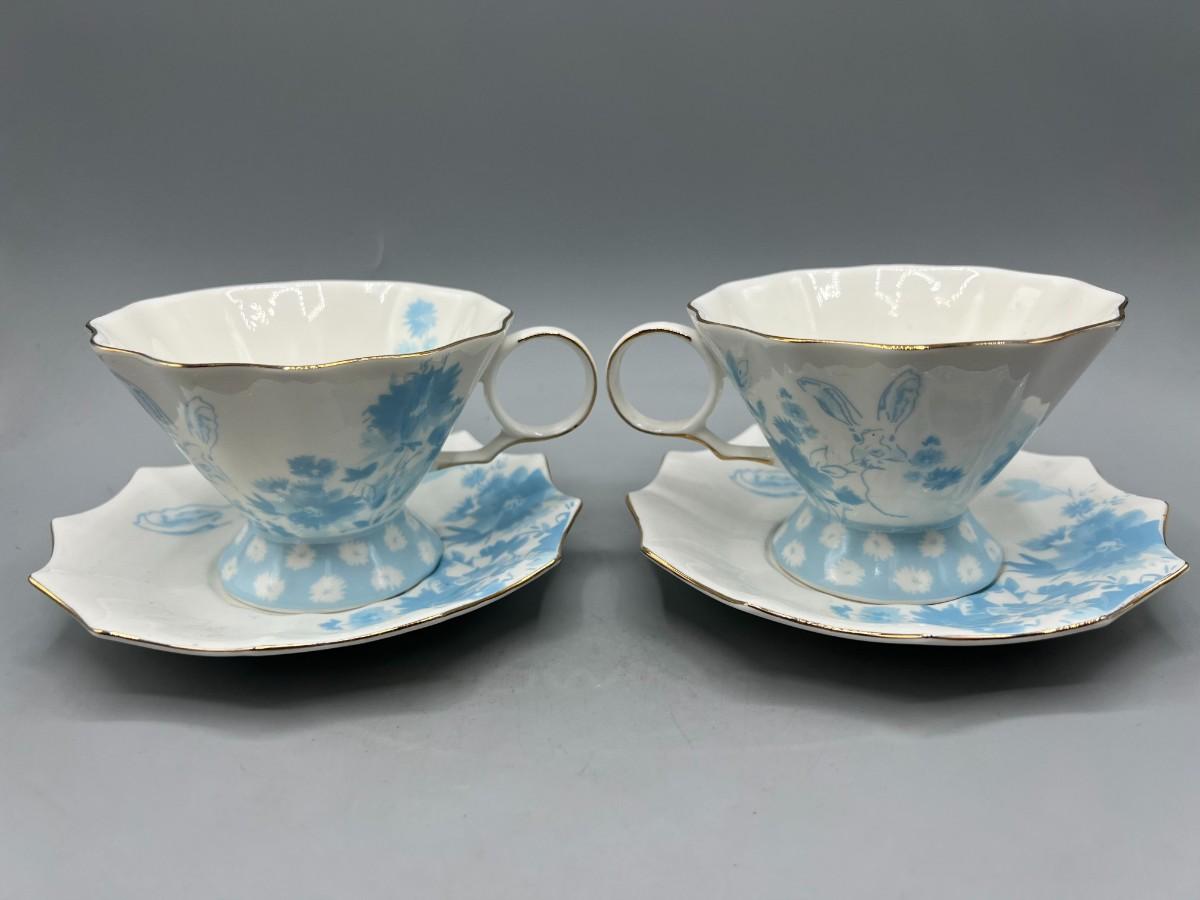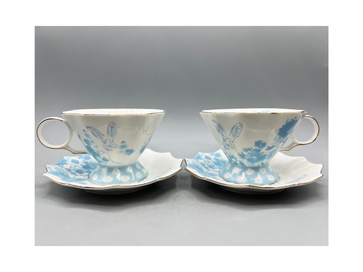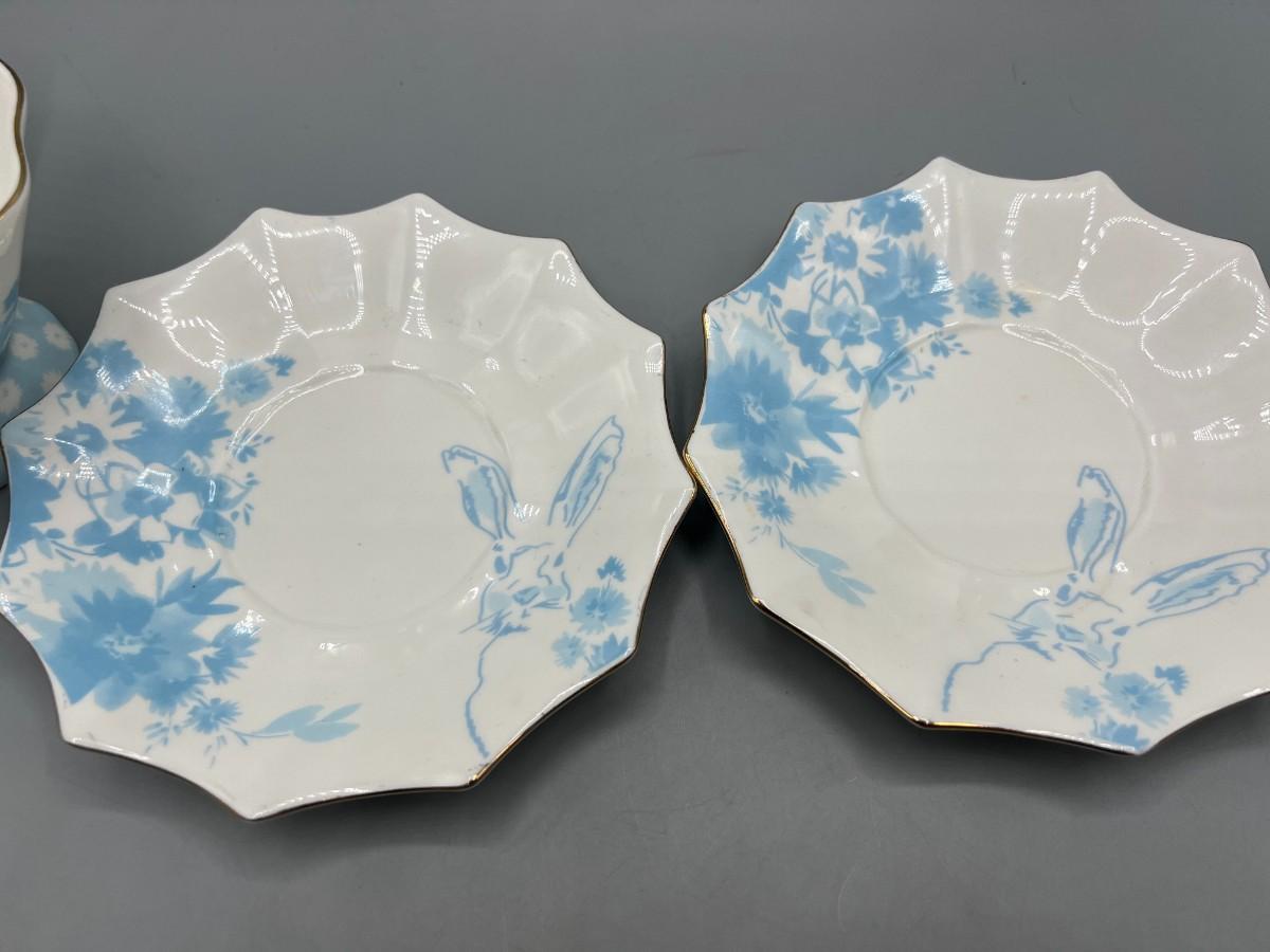 Pair of Matching White & Blue Springtime Easter Themed Teacups with Saucers