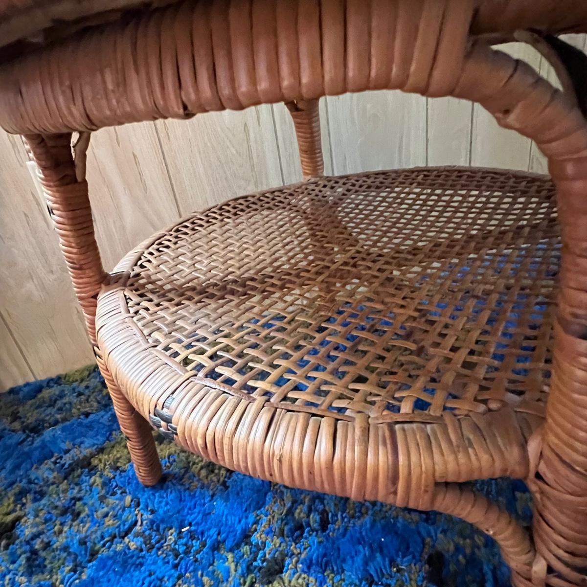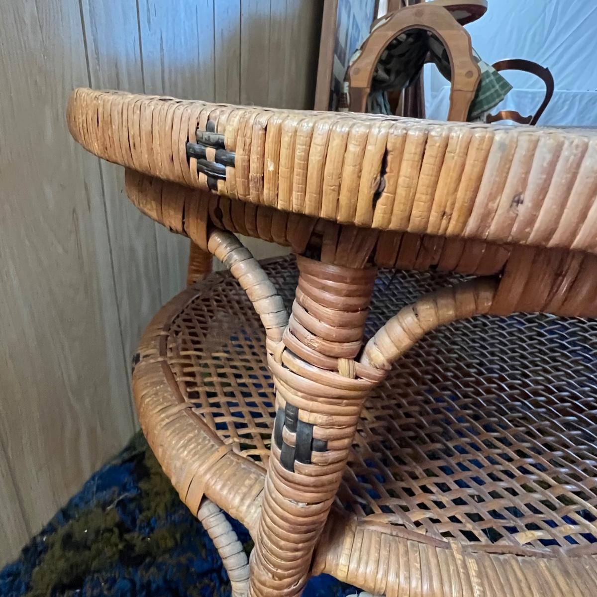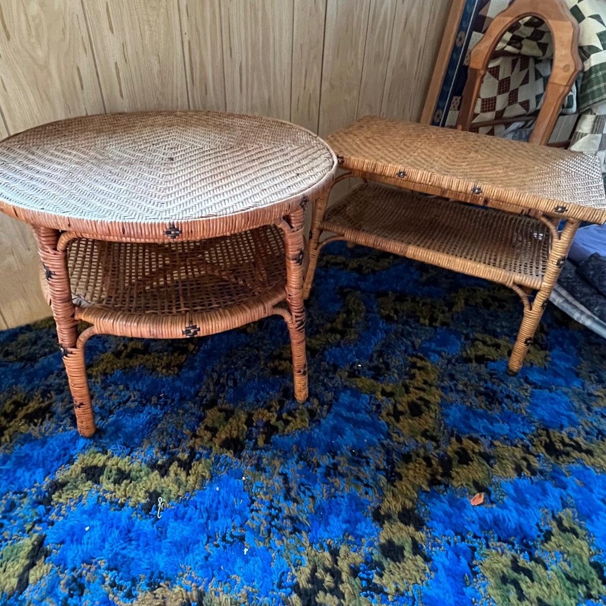 These two wicker tables feature darker brown cross shape embellishments and both have a lower shelf. The round table has two blemishes that appear to be small burn marks and there is some light fading from sun bleaching. The rectangular table has one small area that has come loose but could be glued back into place.