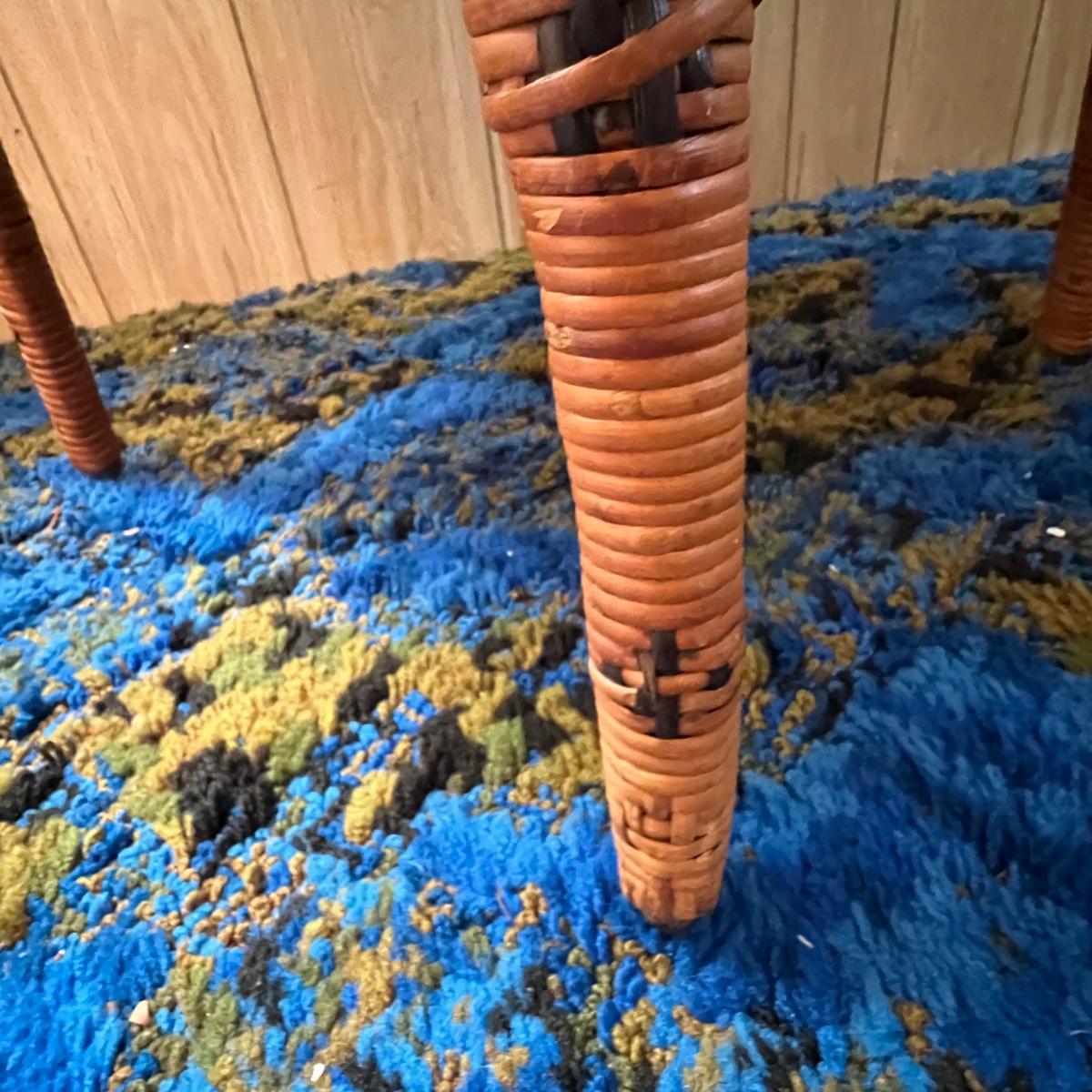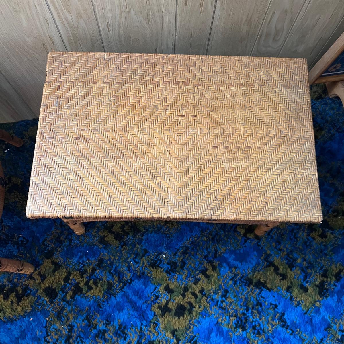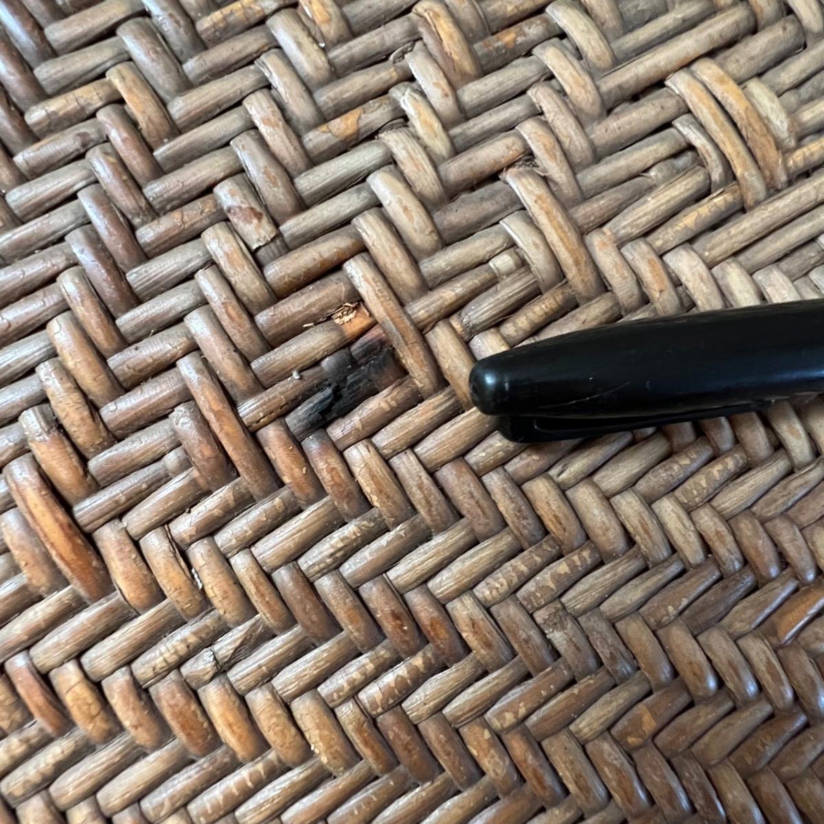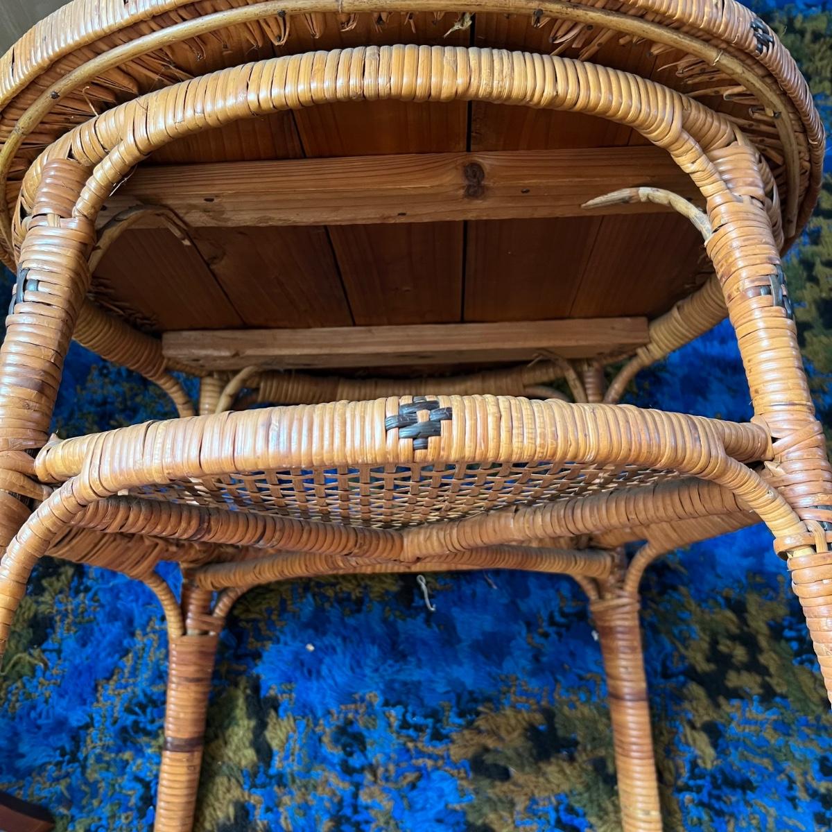 These two wicker tables feature darker brown cross shape embellishments and both have a lower shelf. The round table has two blemishes that appear to be small burn marks and there is some light fading from sun bleaching. The rectangular table has one small area that has come loose but could be glued back into place.