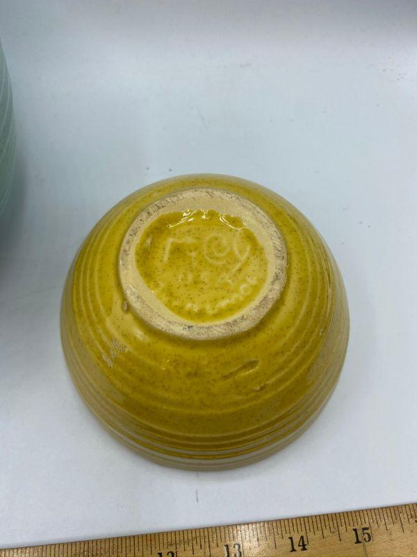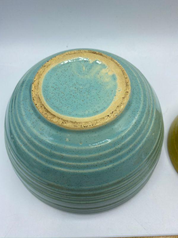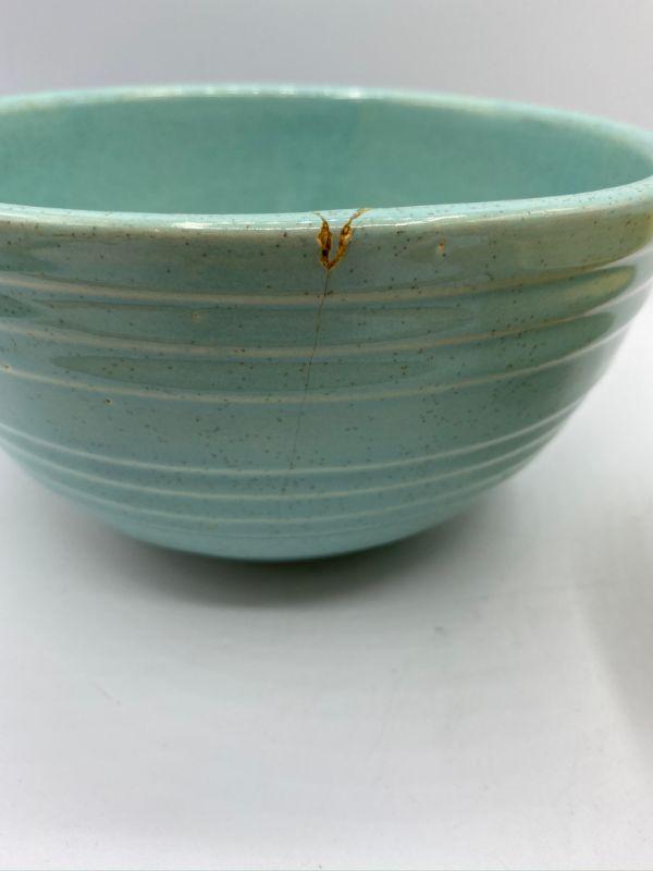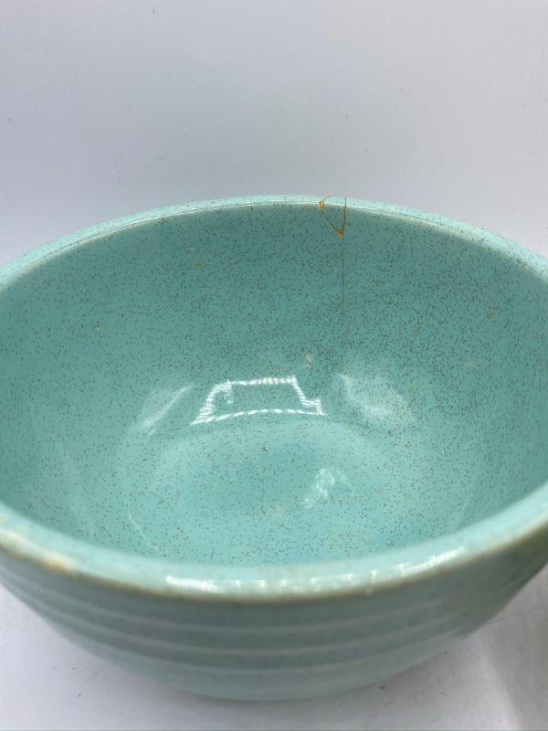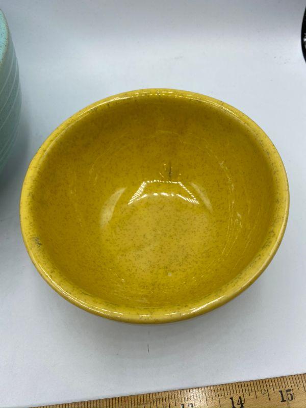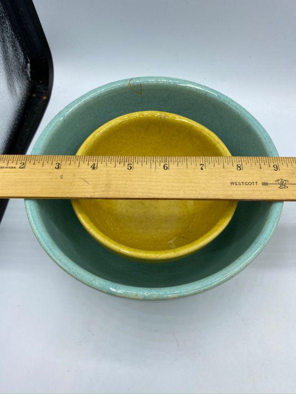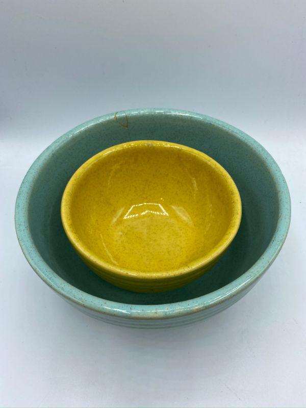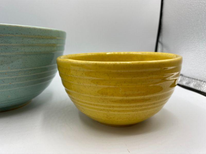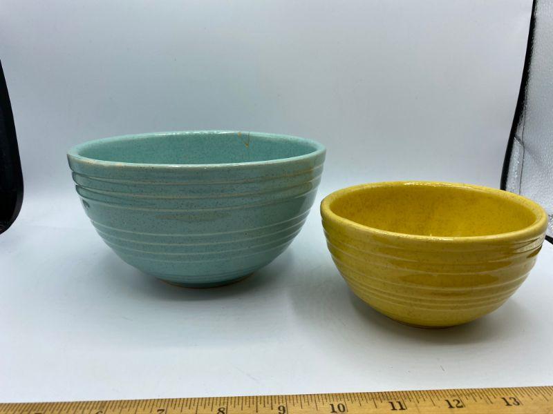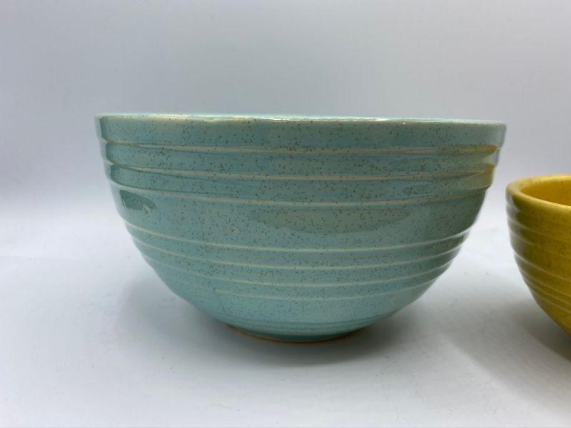 Vintage pair of McCoy speckled mixing bowls. Robins Egg blue and mustard yellow. The blue one has some damage with a crack and chip. Displays good and could probably still be used for somethings. Yellow is in good condition.