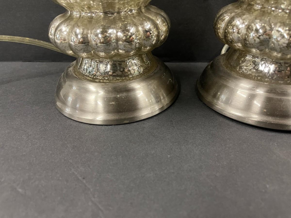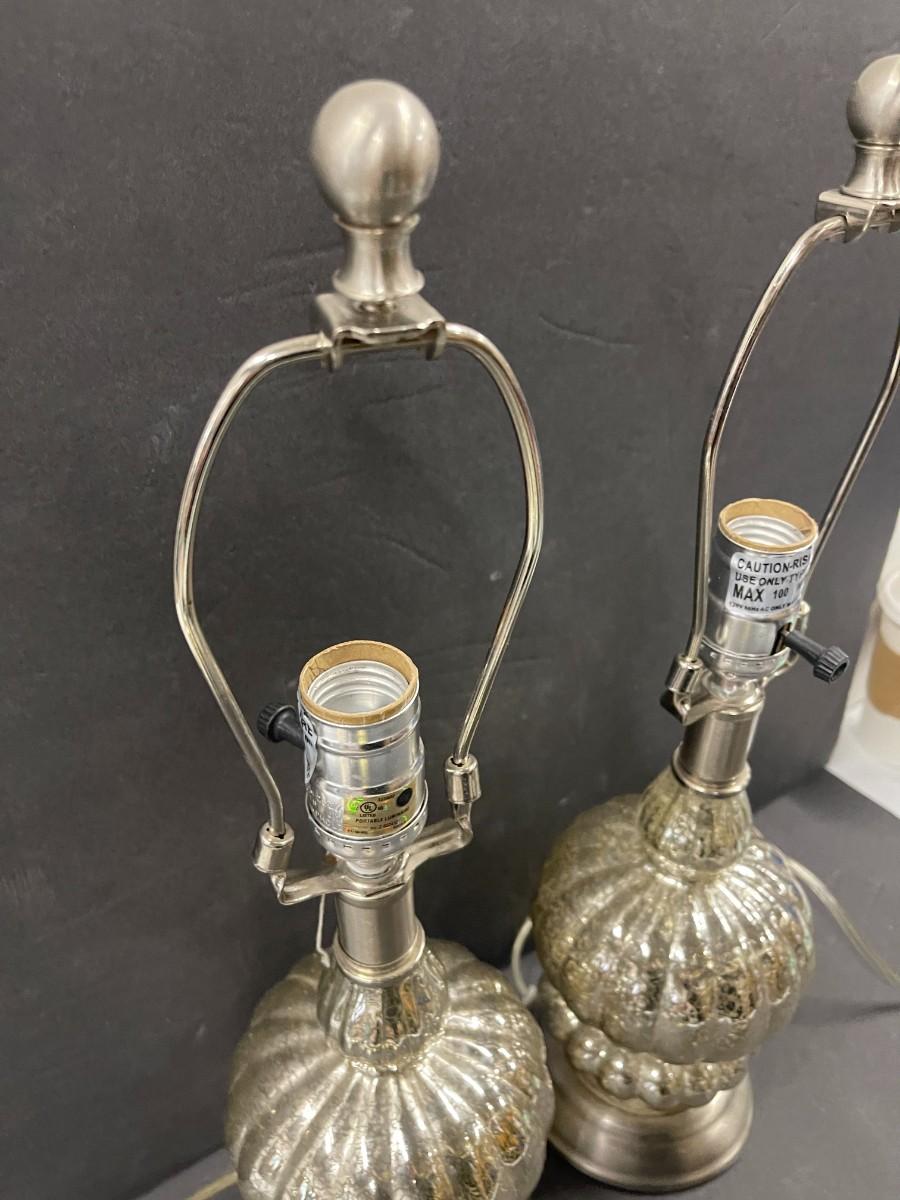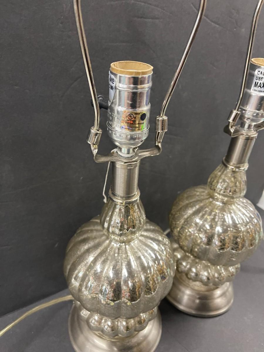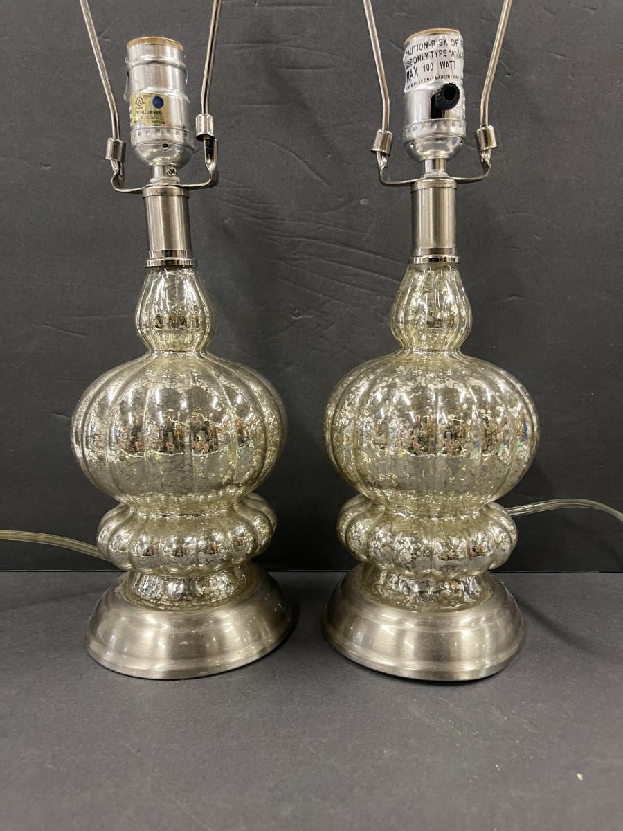 Pair of mercury glass lamps, excellent condition. They do not come with shades. 19" to top of finial x 5" at the widest point.