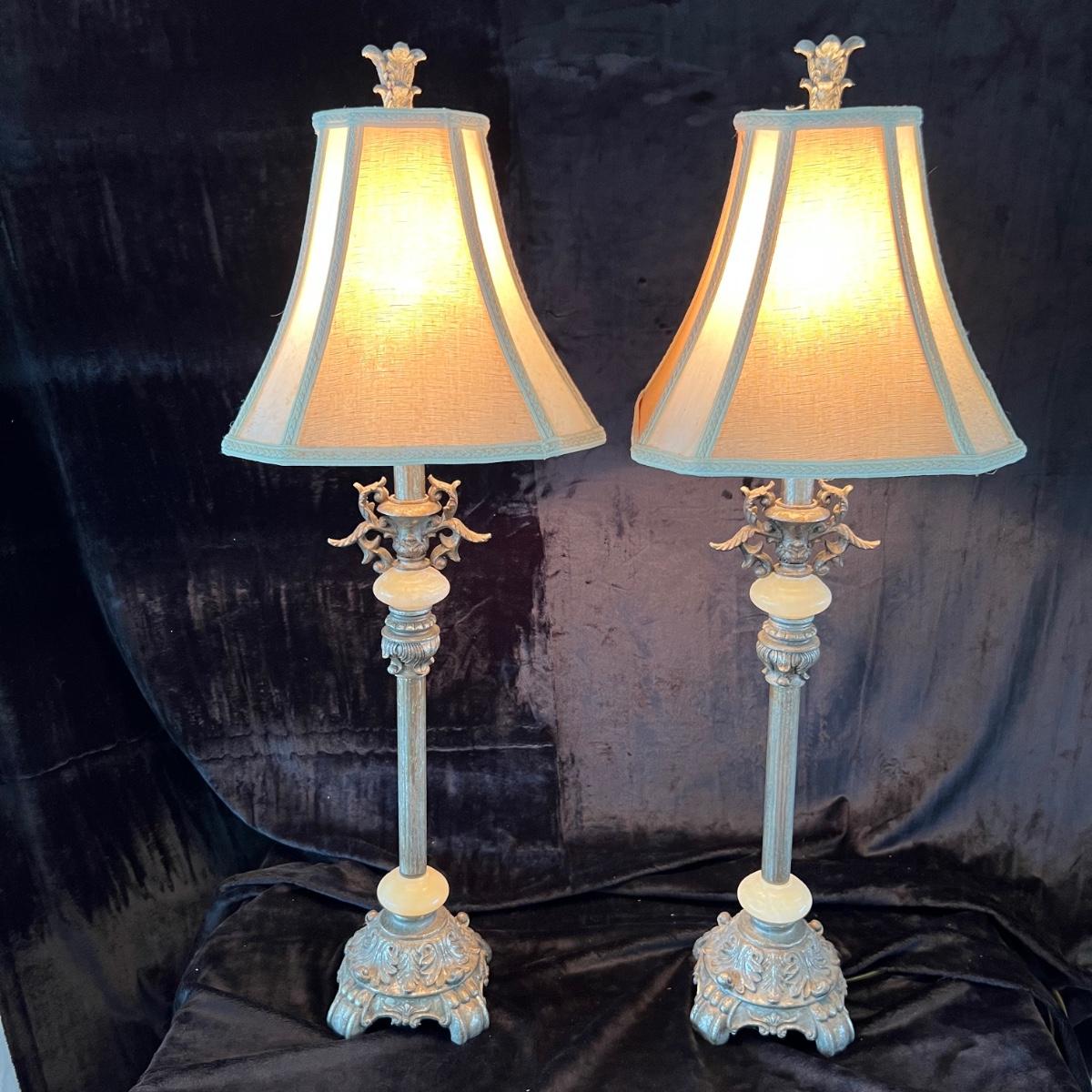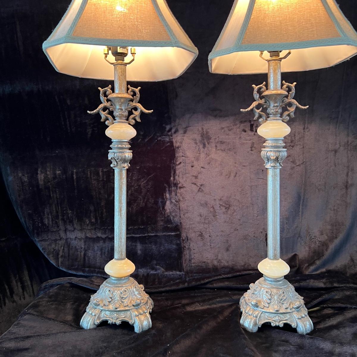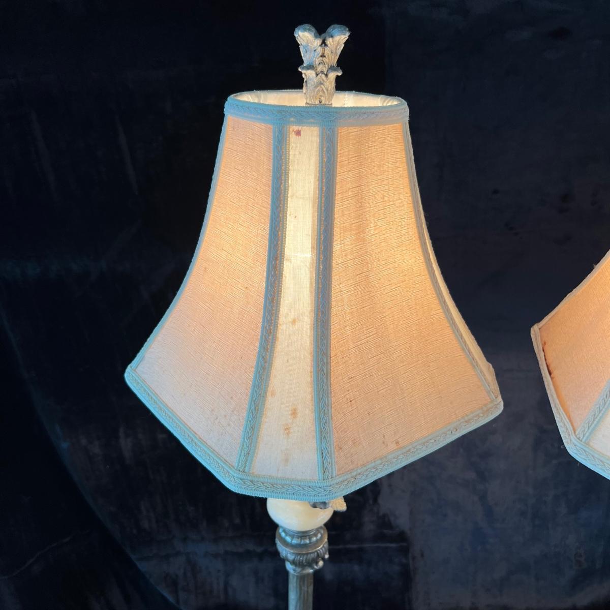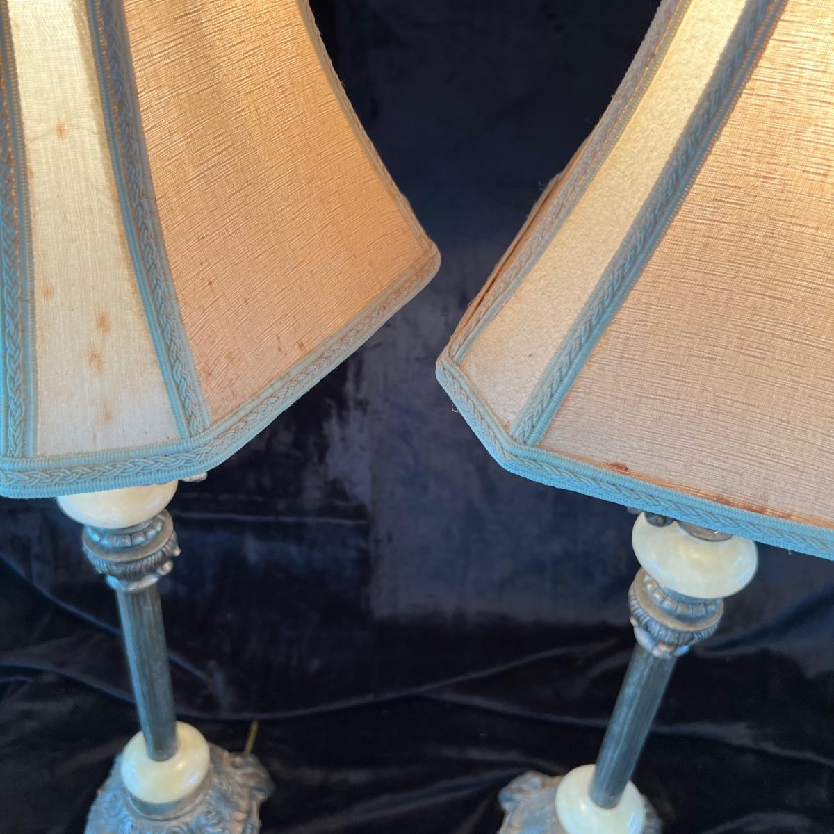 Two silver table lamps with stone accents and beige silk lampshades. Some brown spotting on shades. Decorative leaf finials and details on base. Lamps meas. 32"h and are in working condition.