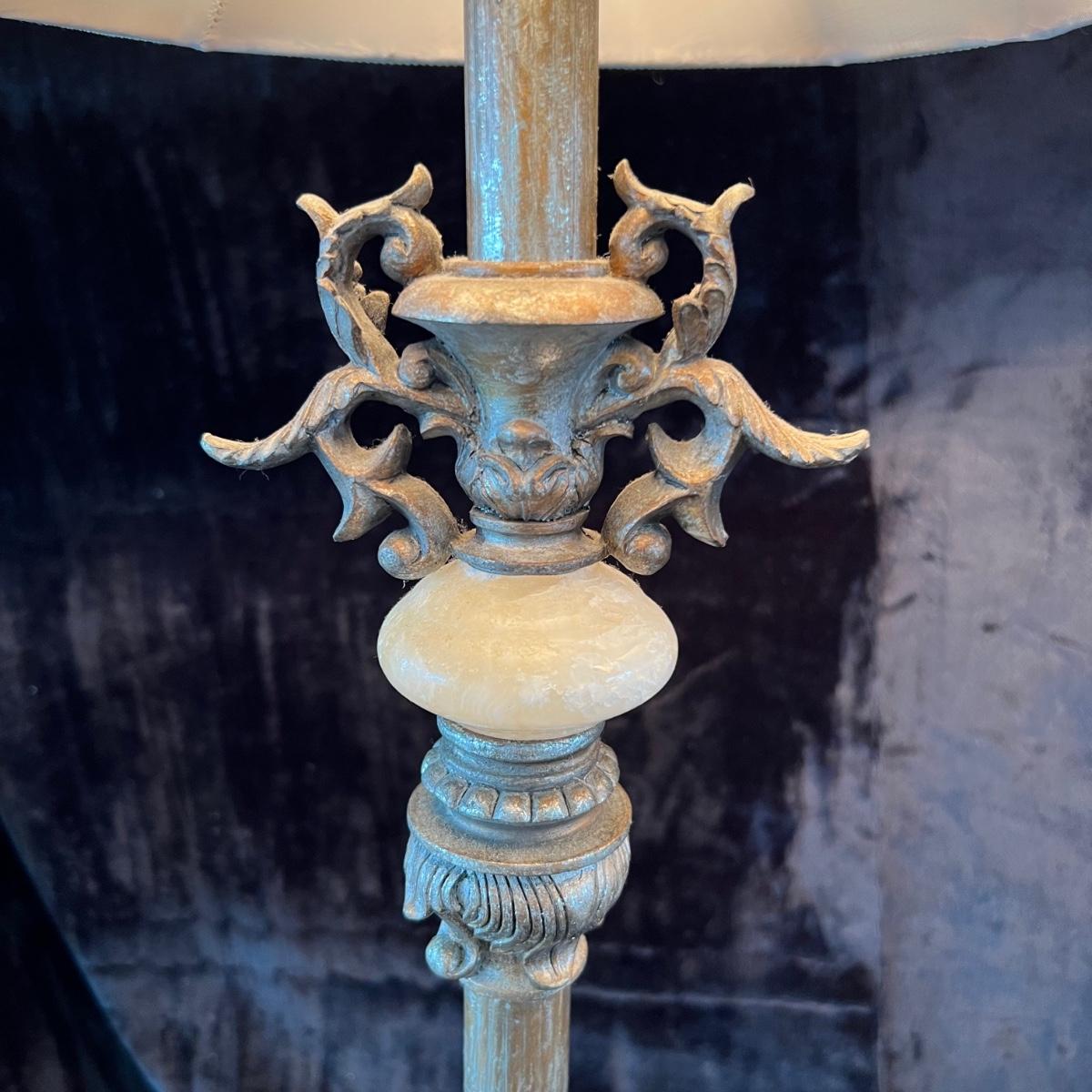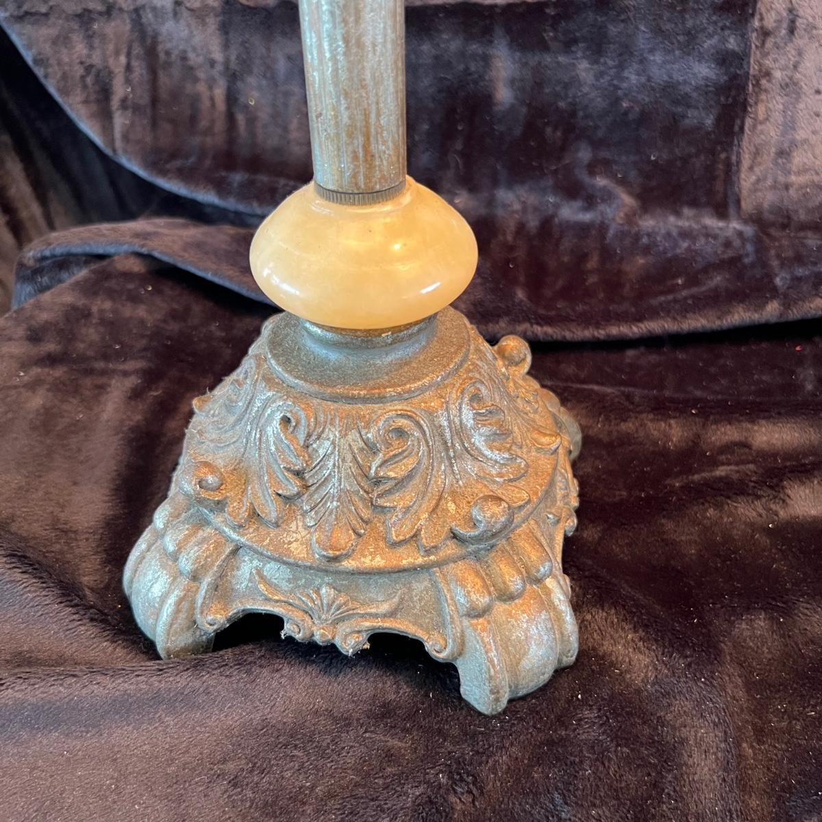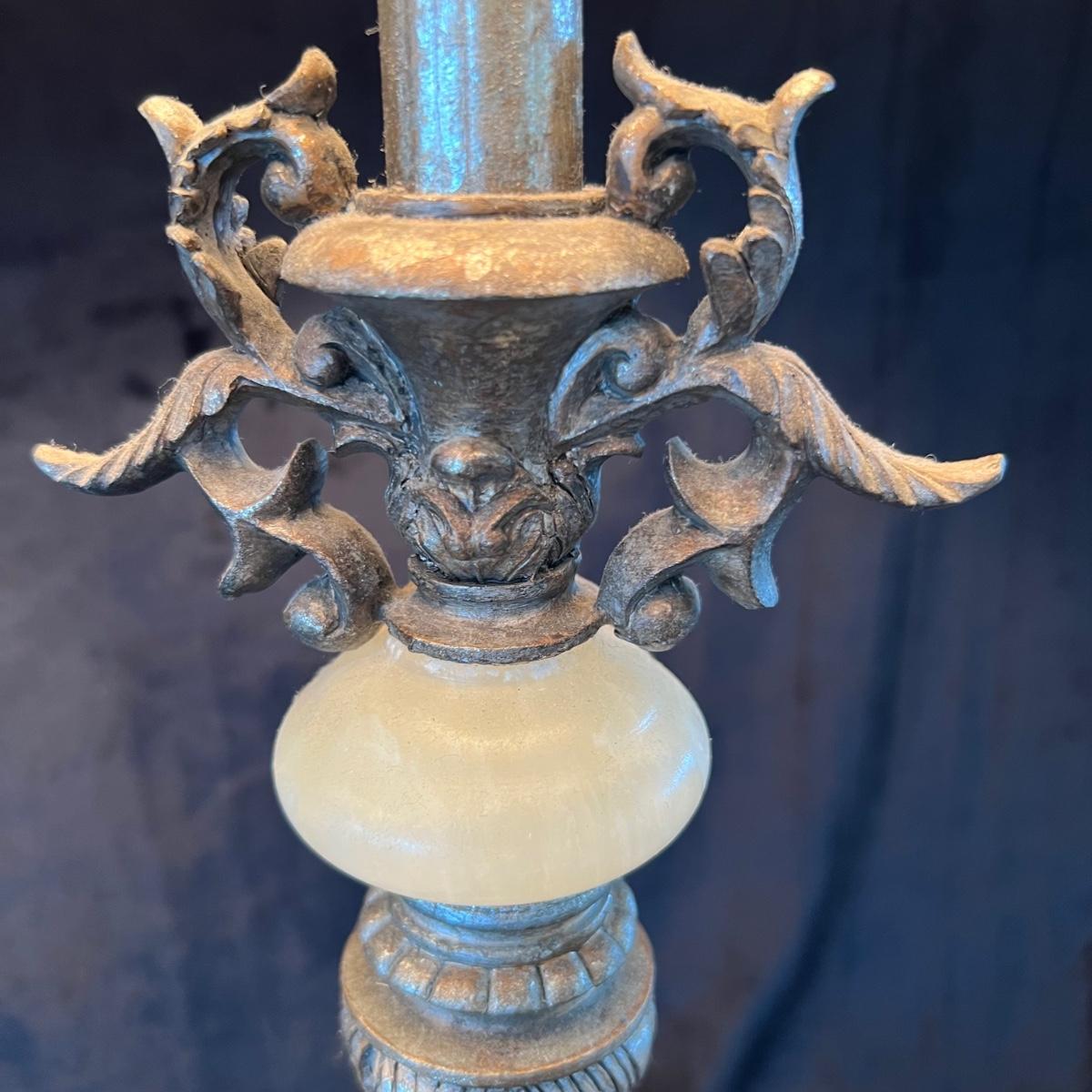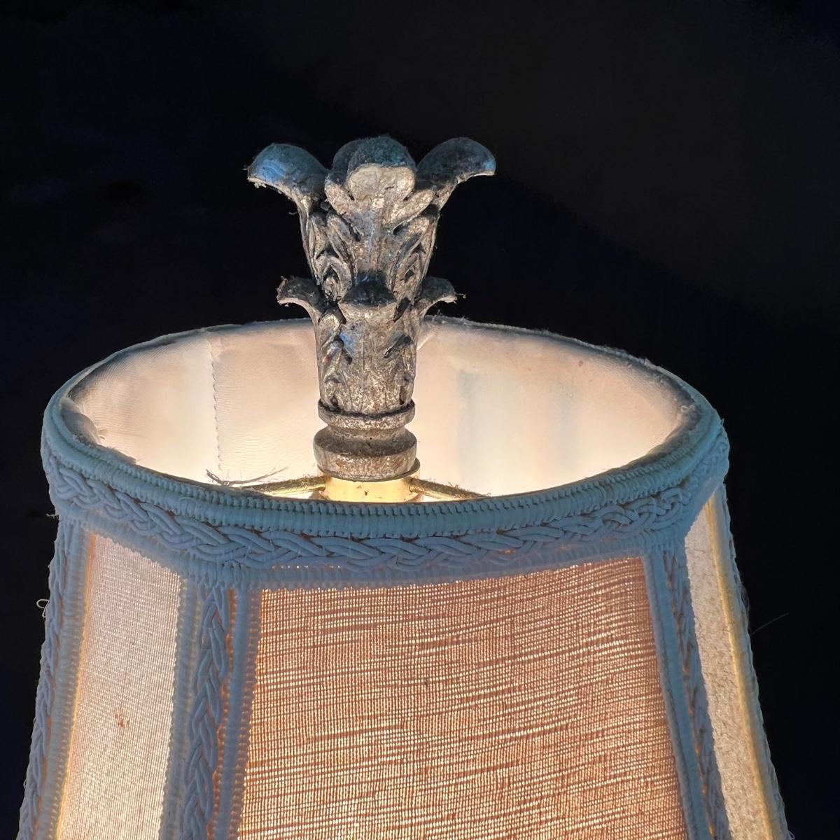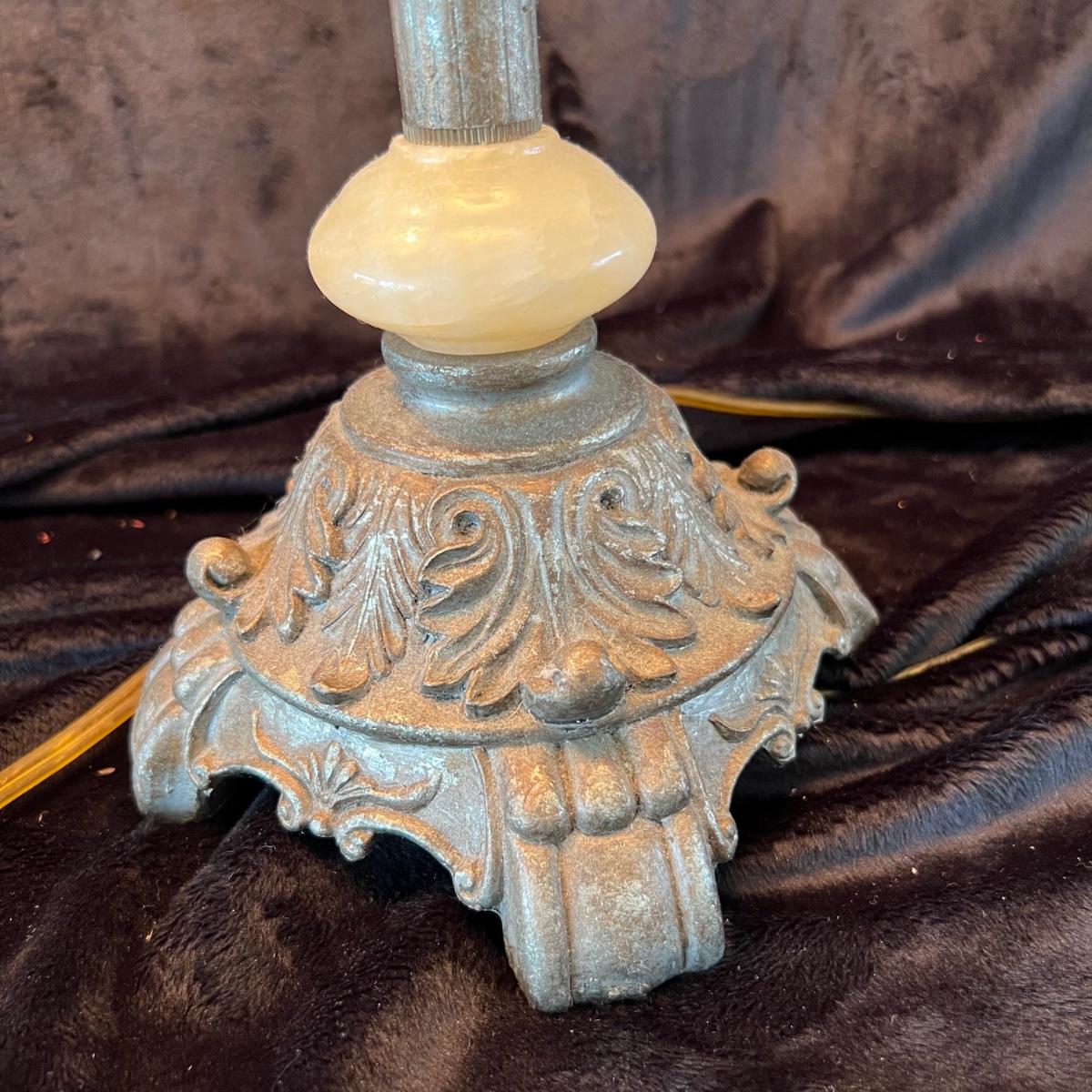 Two silver table lamps with stone accents and beige silk lampshades. Some brown spotting on shades. Decorative leaf finials and details on base. Lamps meas. 32"h and are in working condition.