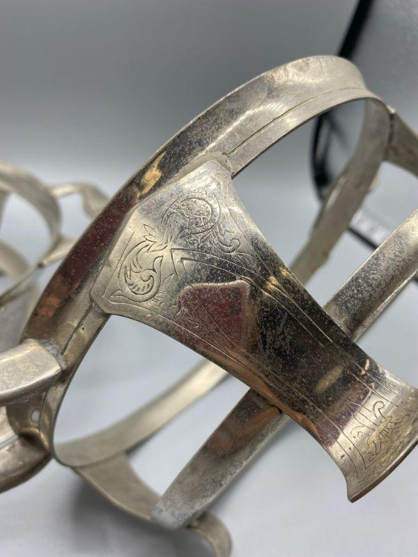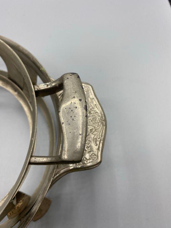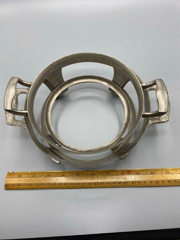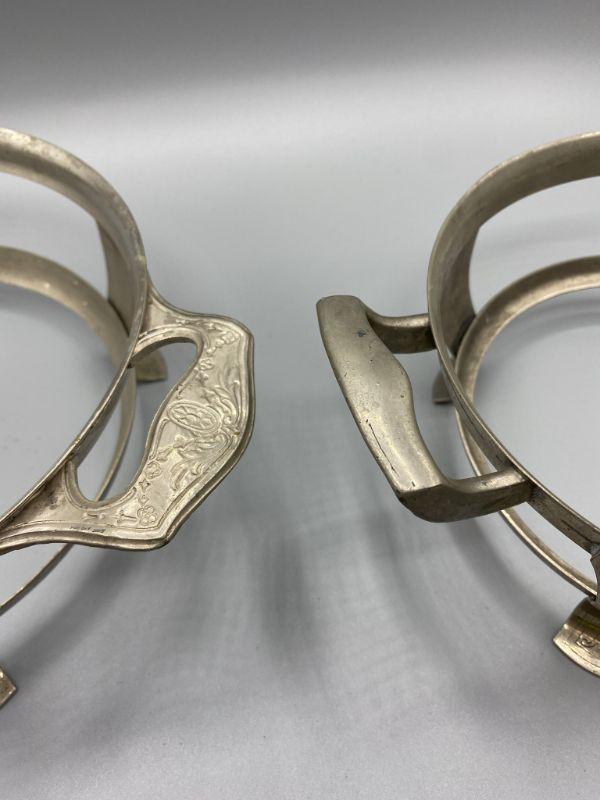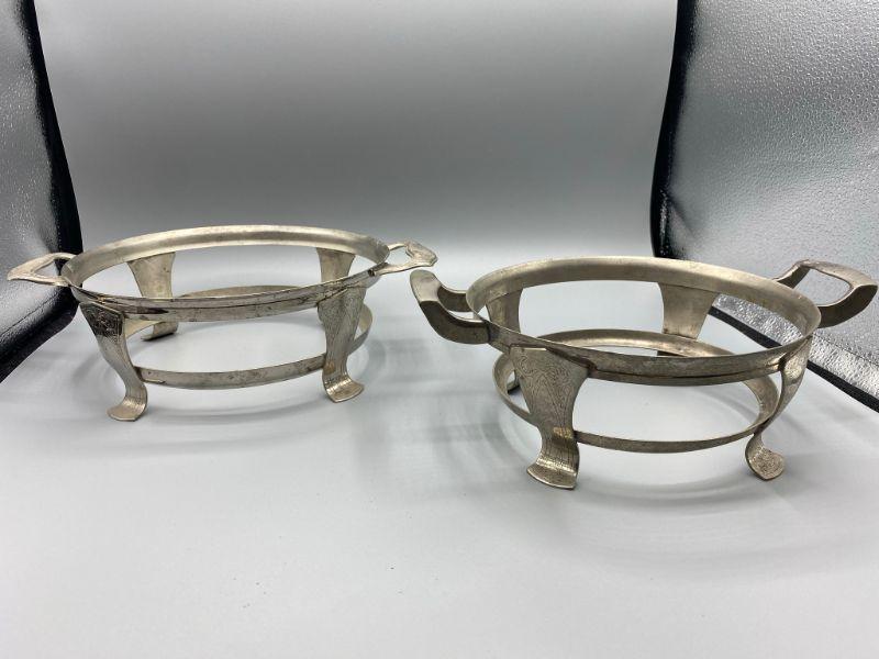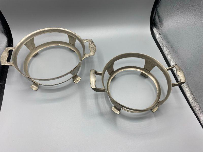 Pair of vintage metal casserole dish holders. Metal holders only, no bowls. Some signs of wear, they are not silverplate.