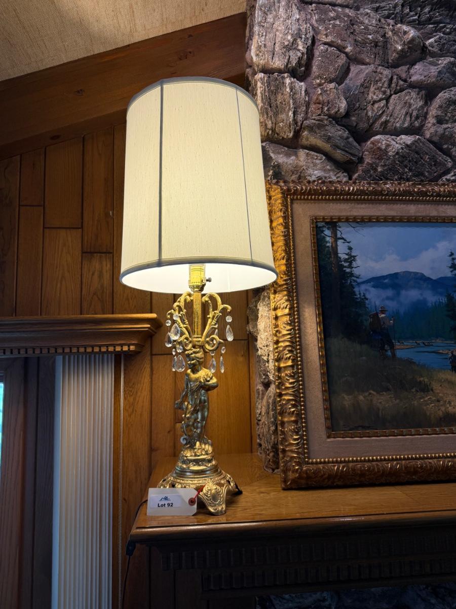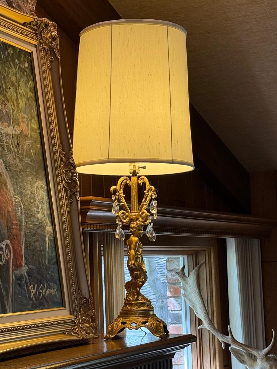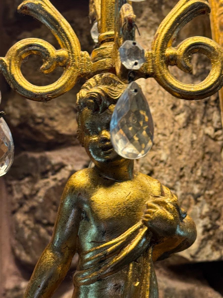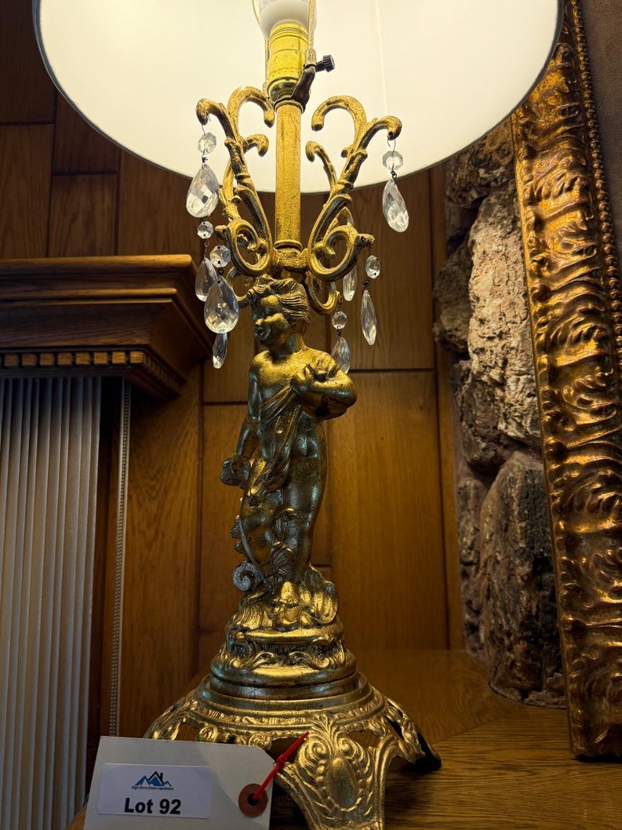 Pair of gold tone Metal Cherub Themed Lamps with Shades & crystals