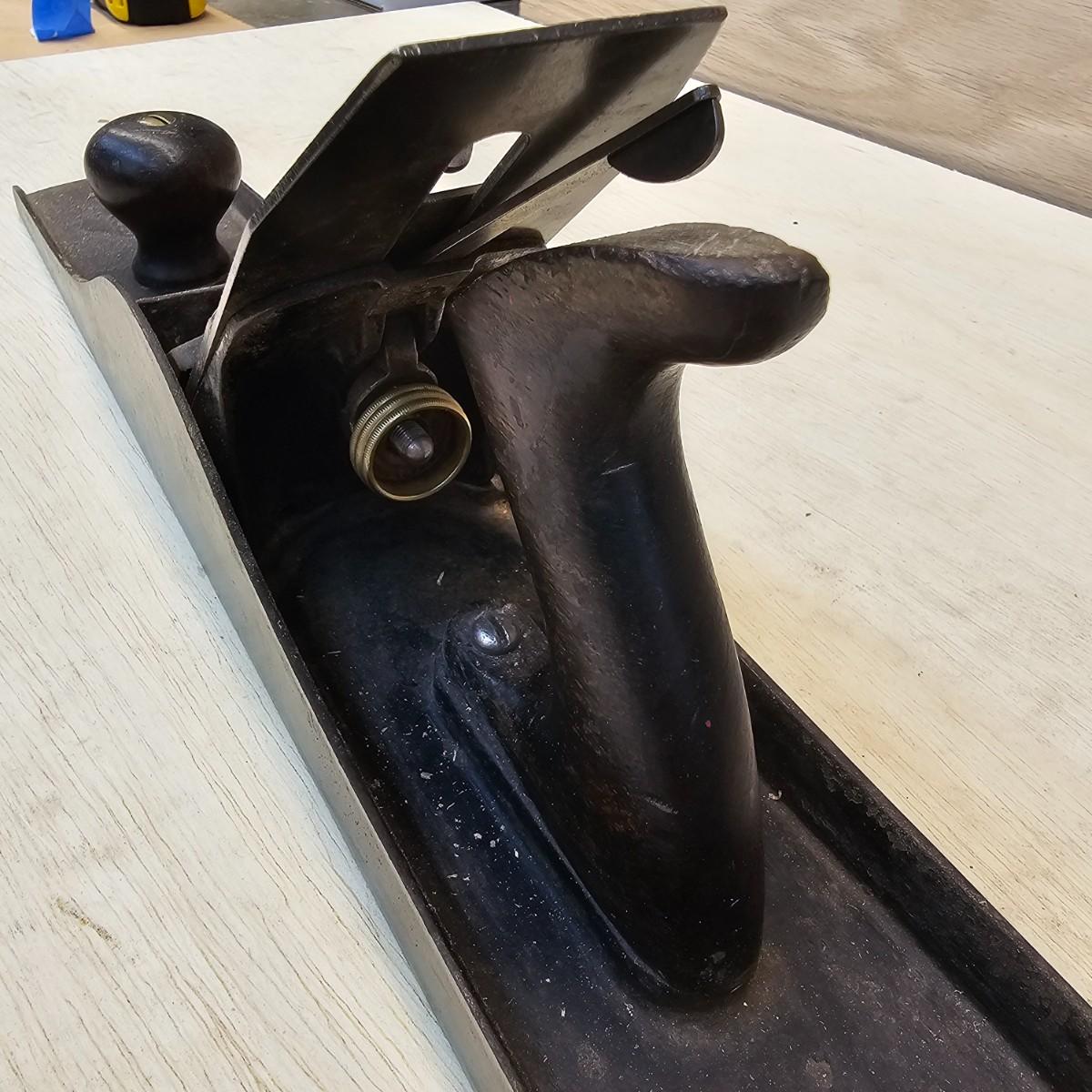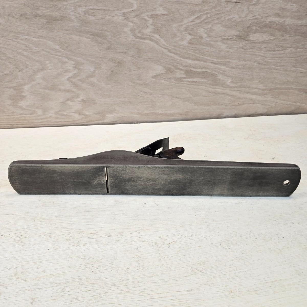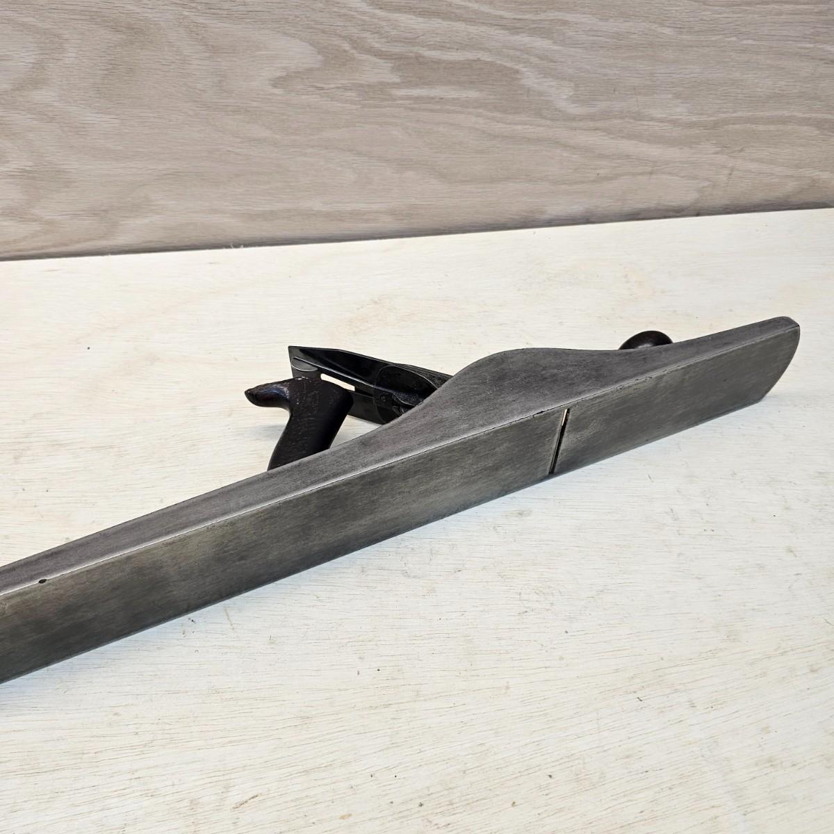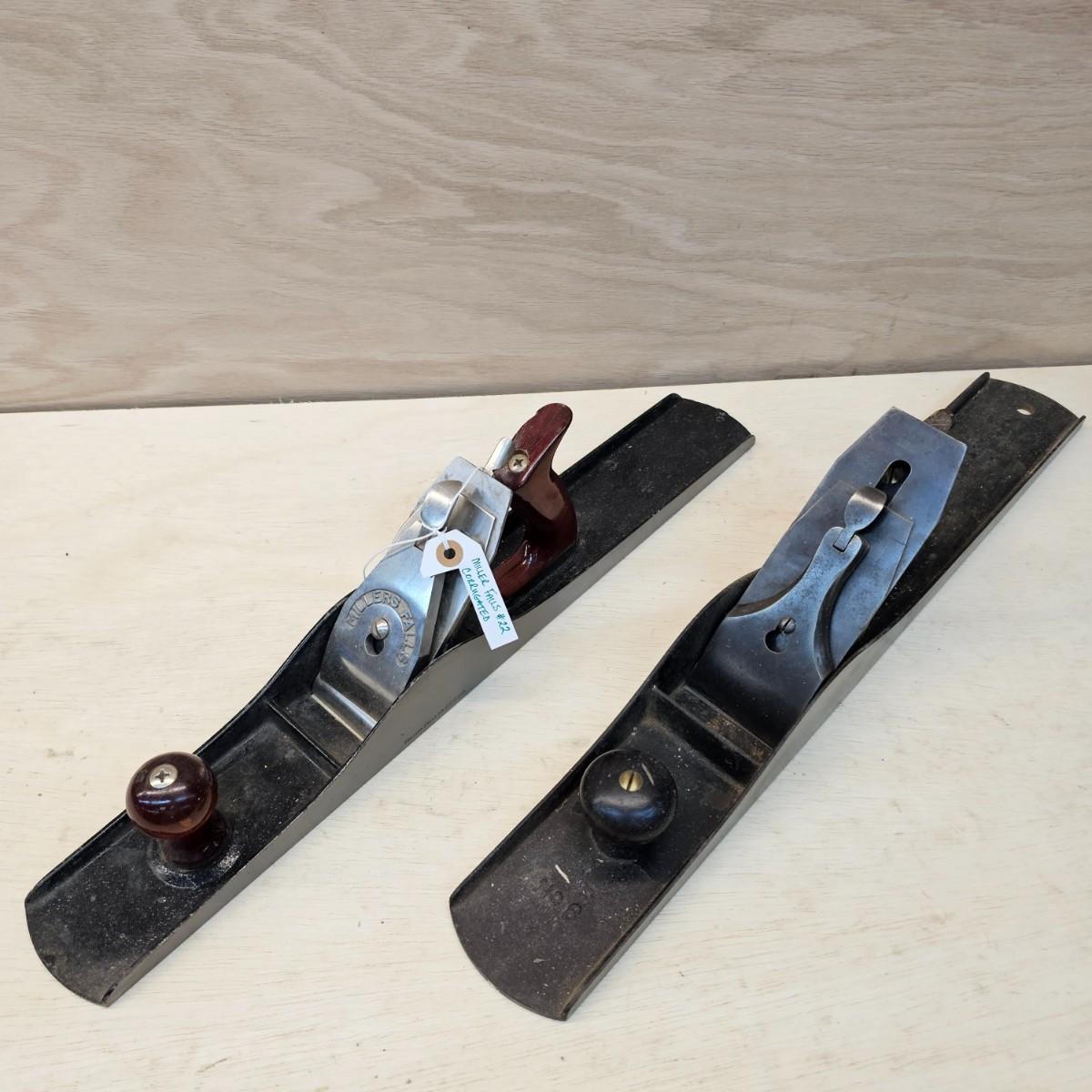 One Miller's Falls and one Stanley metal jointer plane. Miller's Falls item has corrugated bottom, measures 3" x 22" x 5"H. Stanley is smooth bottom, is 3" x 23" x 6"H and has small piece missing on back handle. See photos for details. Local pickup only.