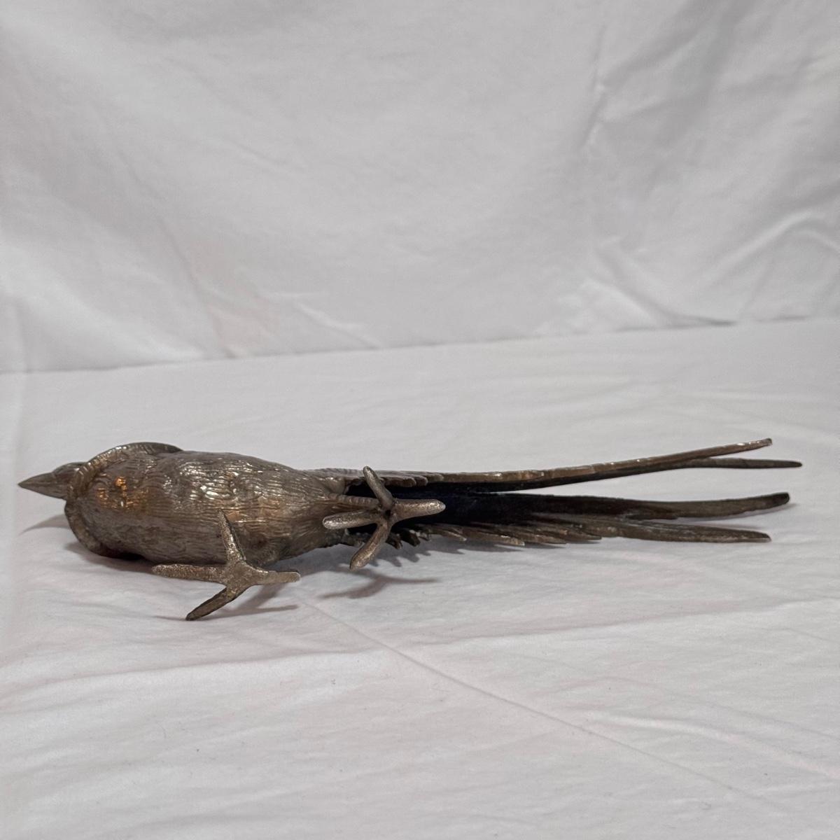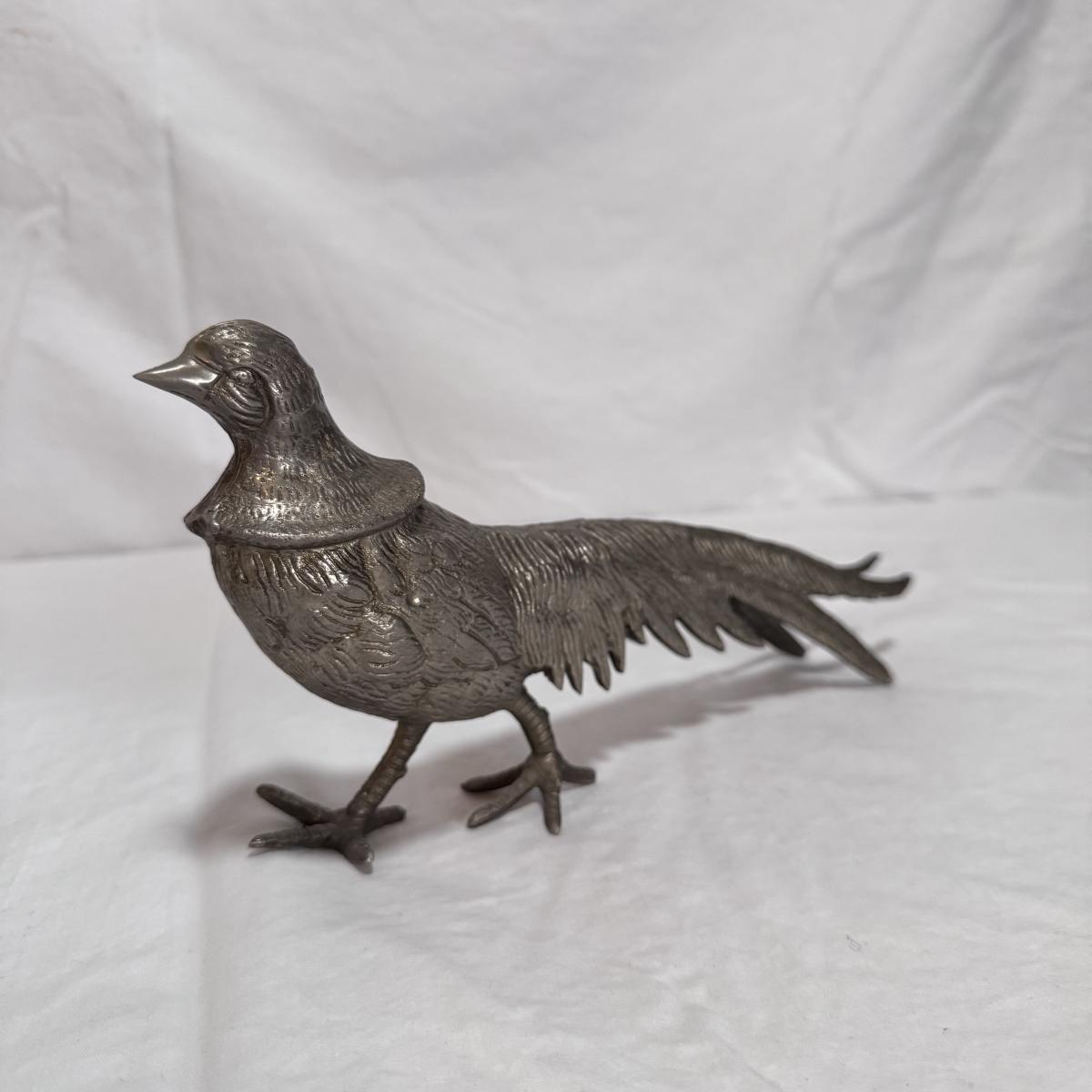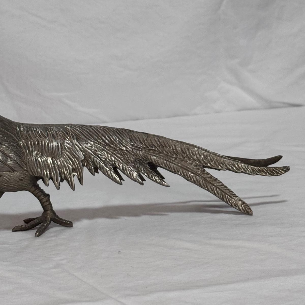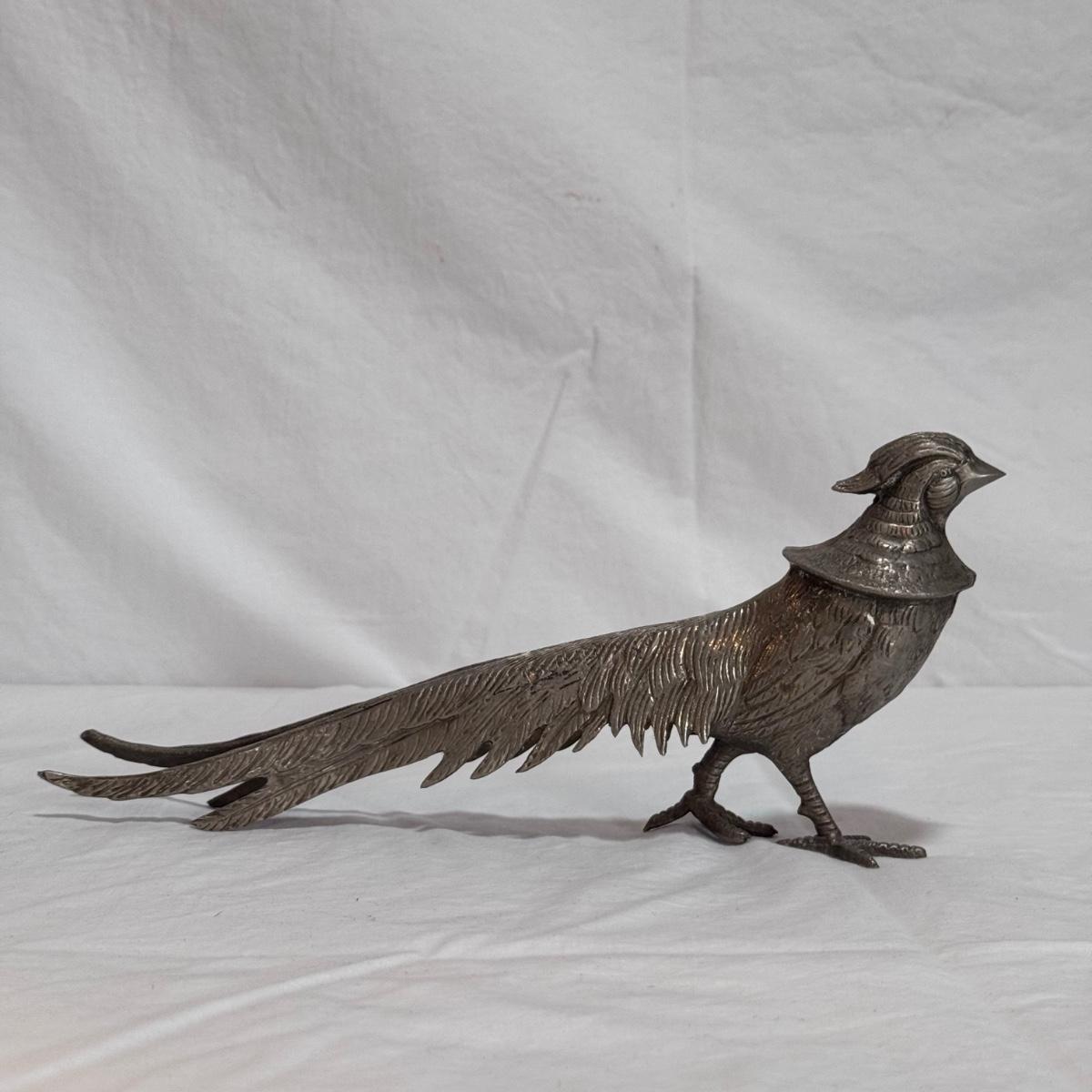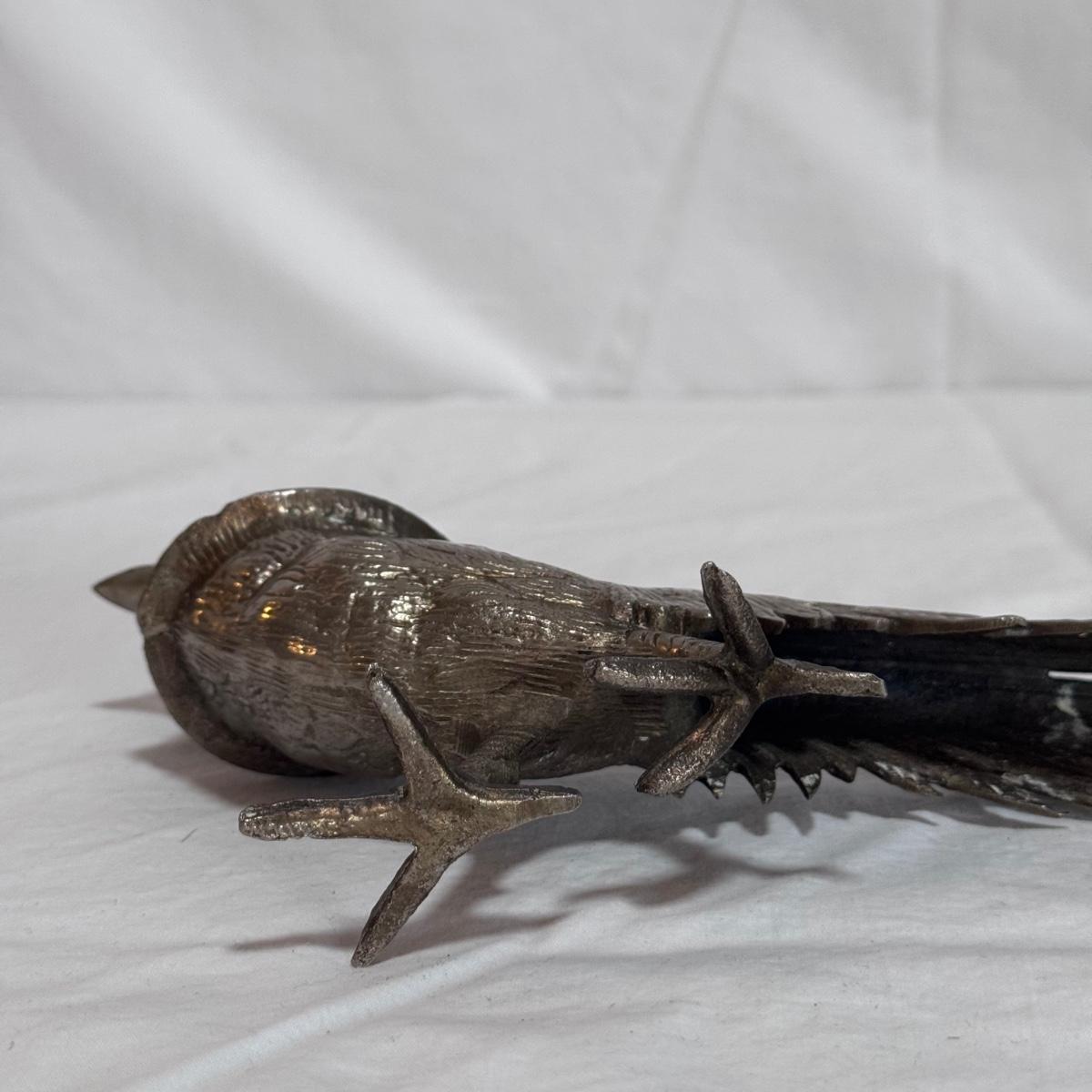 This lot includes two metal pheasants that pair nicely together. Both pheasants are slightly different from one another, with both being silver-colored and heavy. The bird with the long feathers on its head is t slightly bigger than the other - it measures 12” x 2” x 5”H. Shipping available.