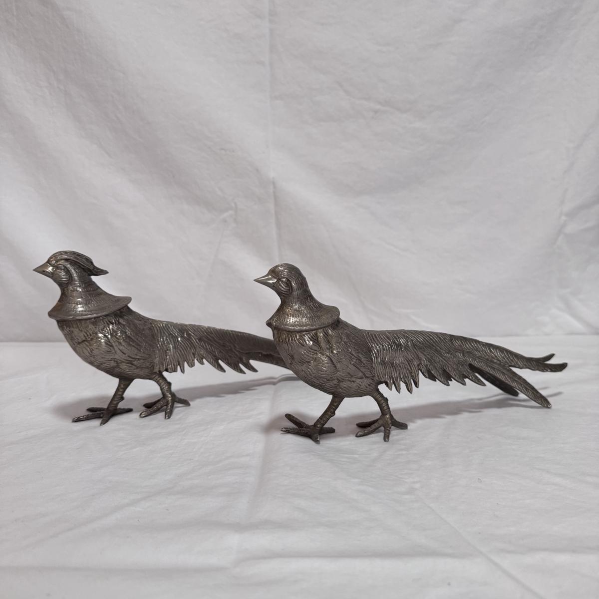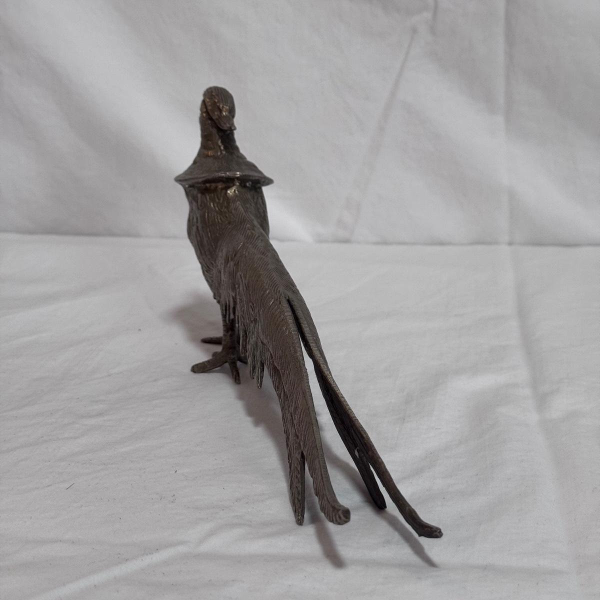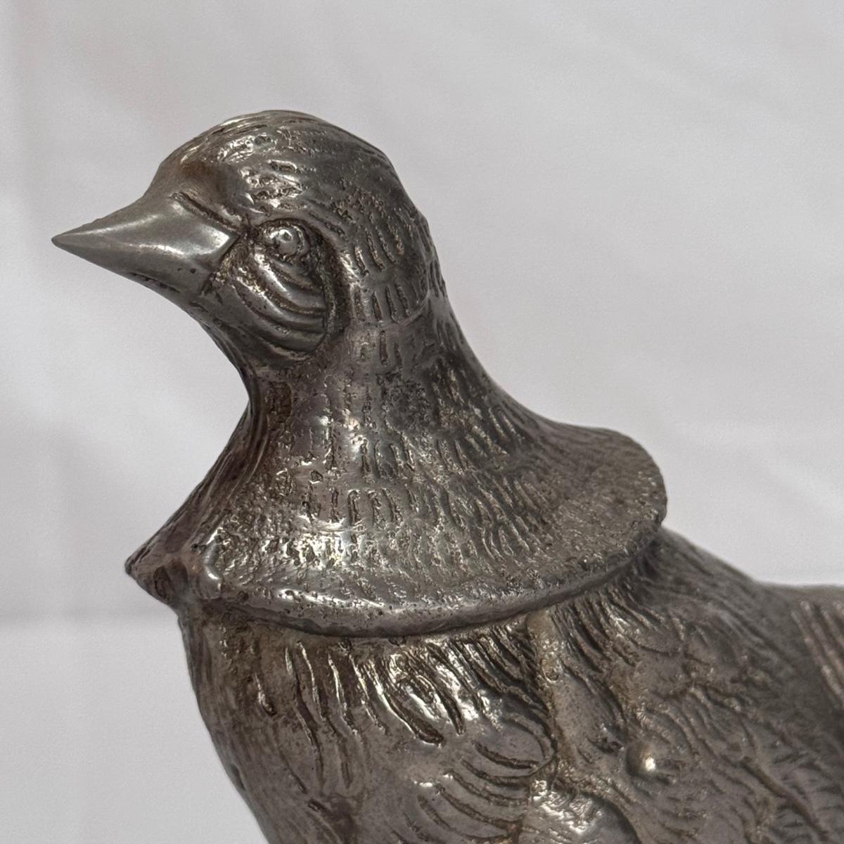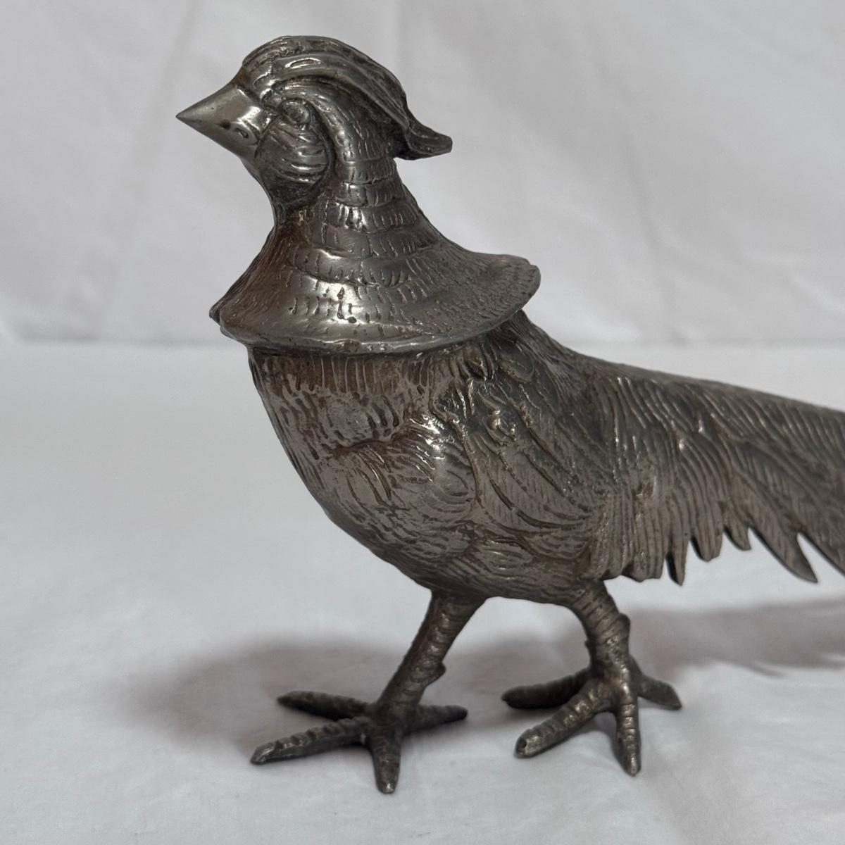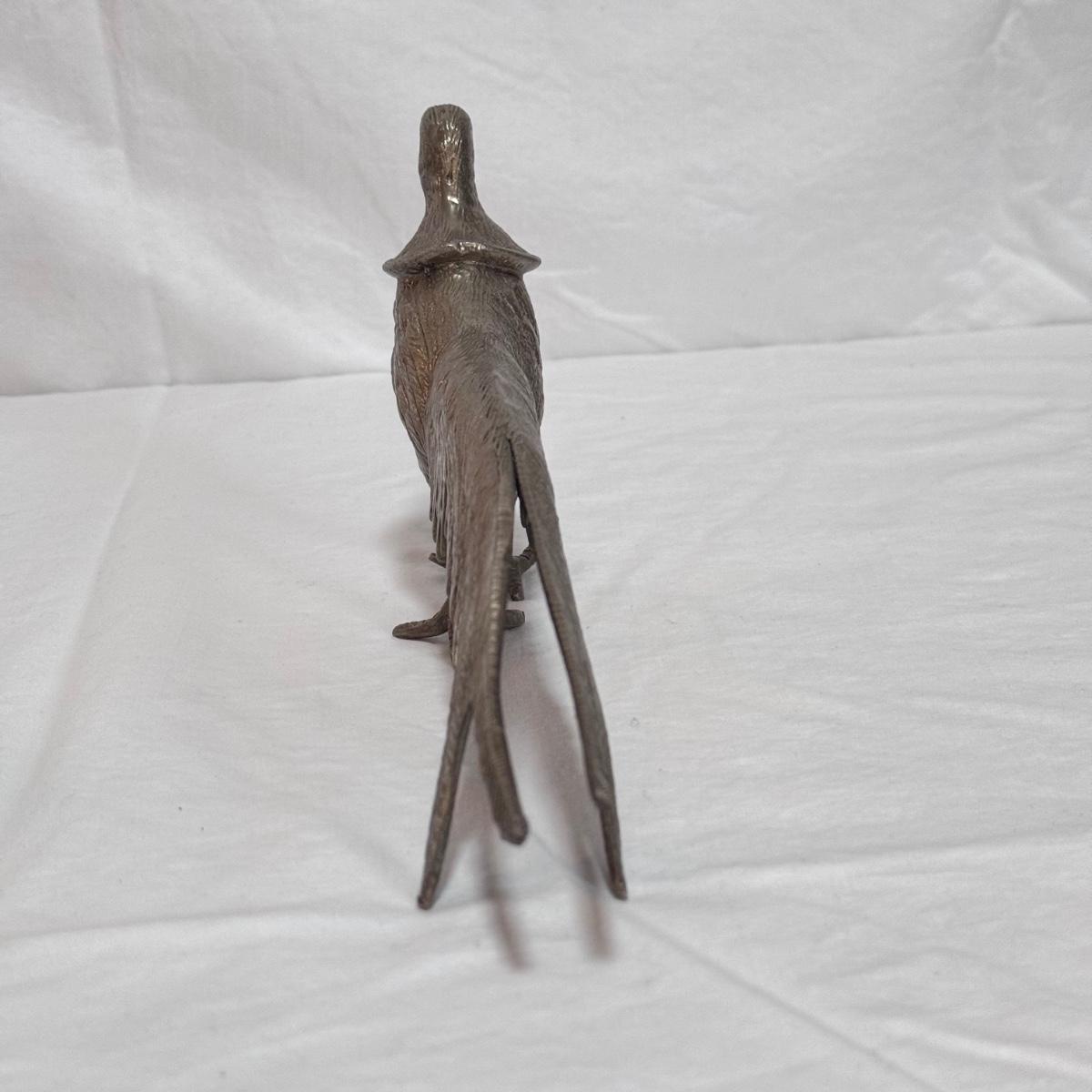 This lot includes two metal pheasants that pair nicely together. Both pheasants are slightly different from one another, with both being silver-colored and heavy. The bird with the long feathers on its head is t slightly bigger than the other - it measures 12” x 2” x 5”H. Shipping available.