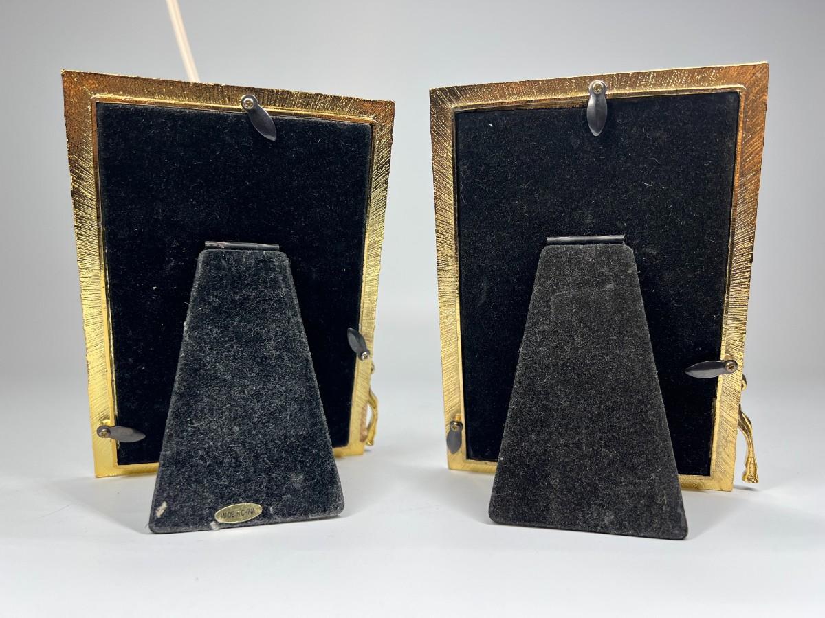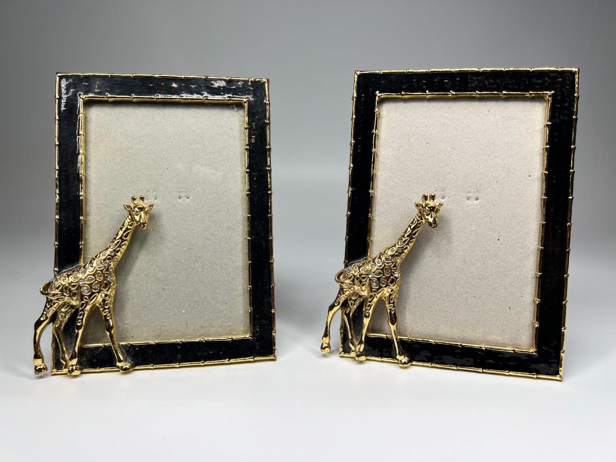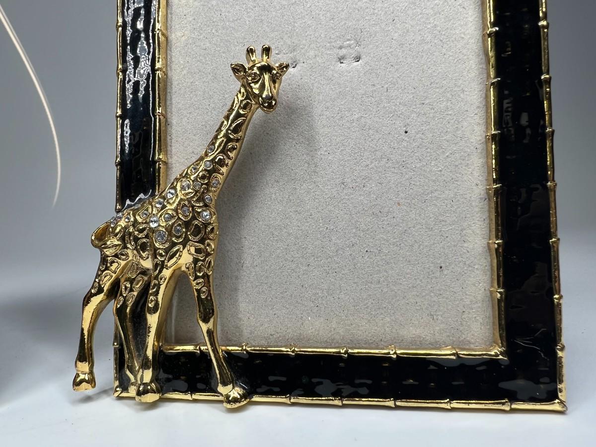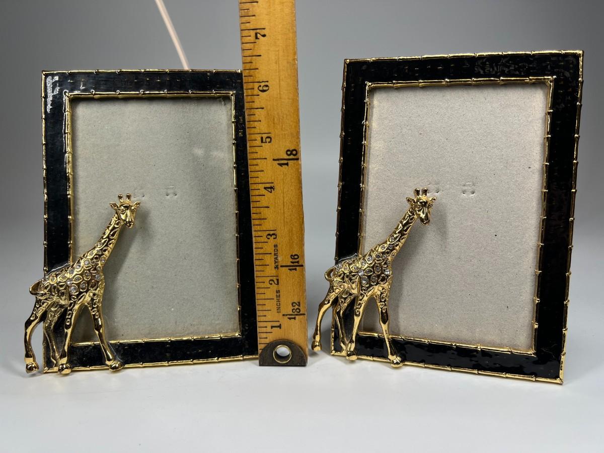 Pair of Metal Rhinestone Giraffe Displayable Home Decor Photo Frames, there is no significant damage to the frames and is in good useable condition. One of the glass panes has some residue from a photo that was kept in it, check pictures for more details and for sizing.