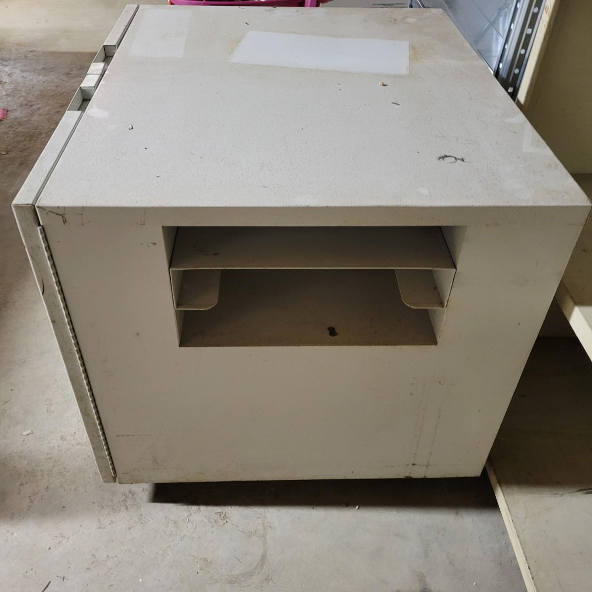 Two metal shelving units and a metal cabinet on coasters. The cabinet measures approximately 28.5" x 24.5" x 23.5"H. The taller, silver shelving unit measures approximately 30" x 12" x 58.5"H. Local pickup only
