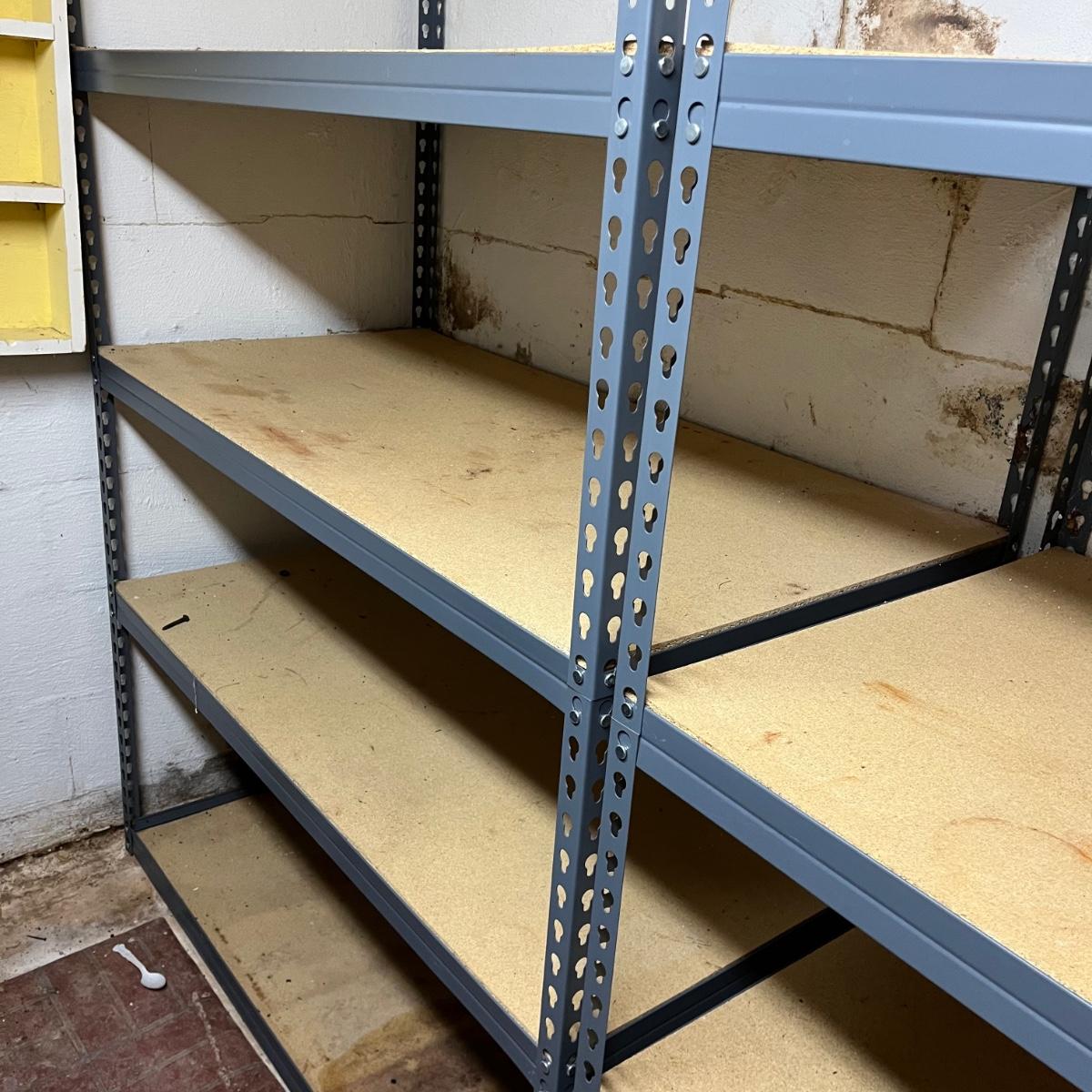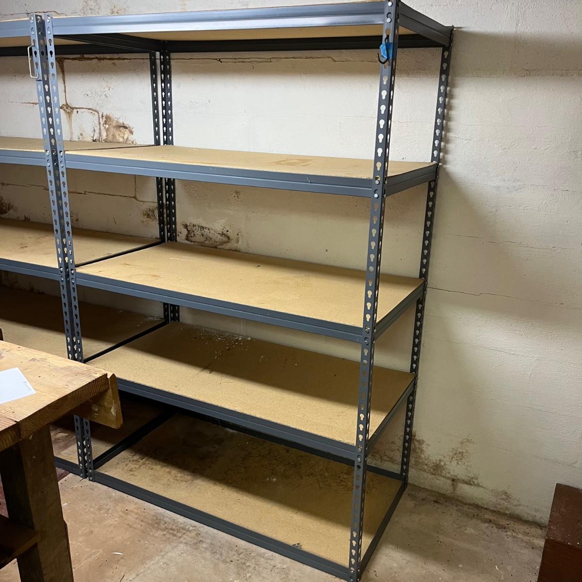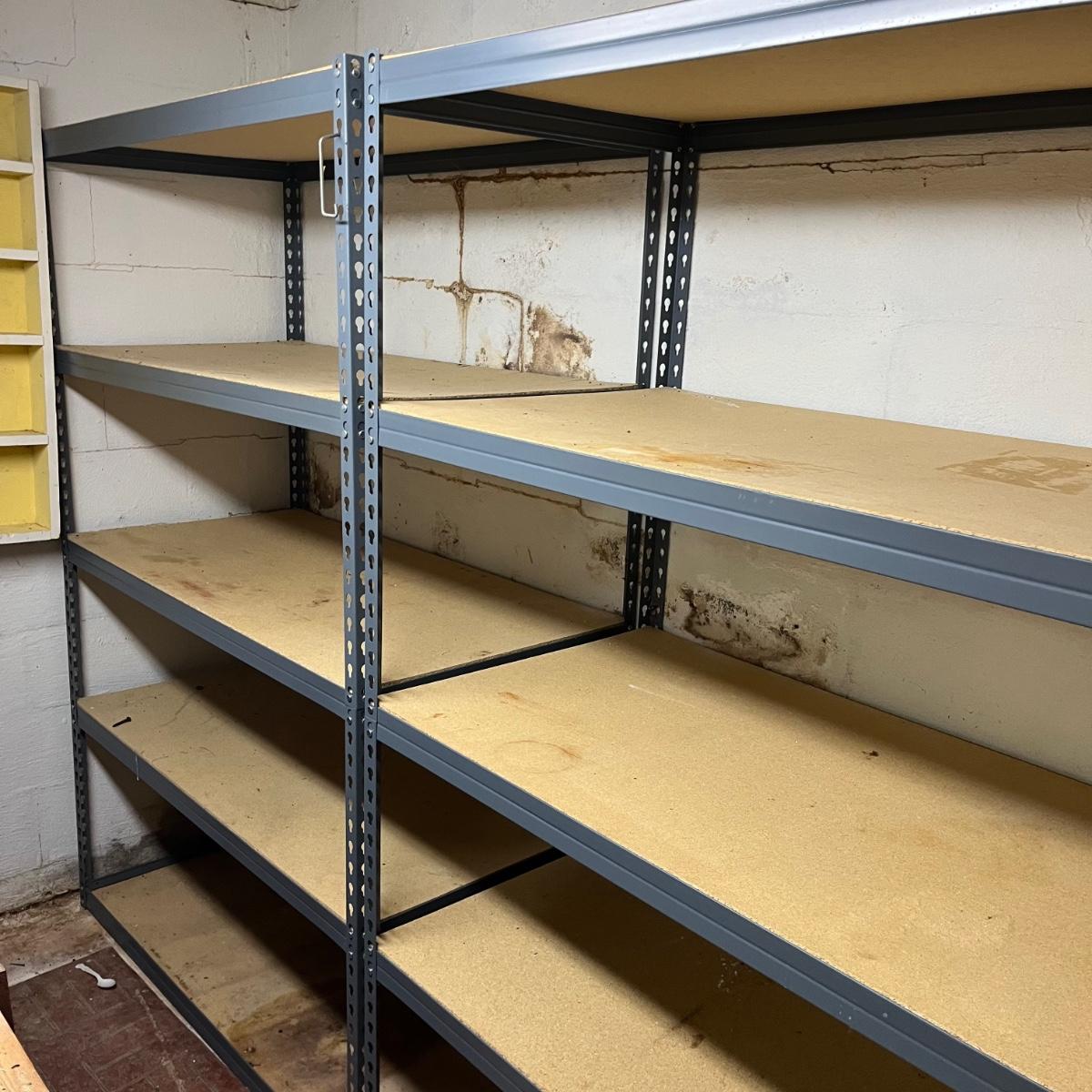 Lot includes two adjustable metal shelving units with particle board shelves. Units come apart for easier transport. Each unit measures 24” x 49” x 72”.