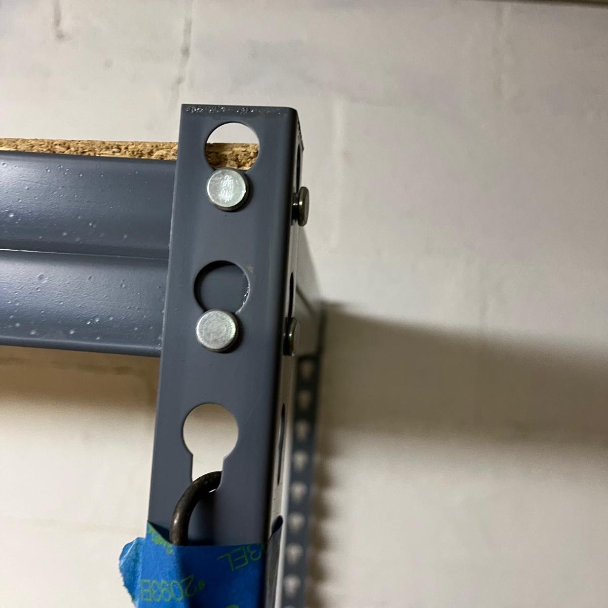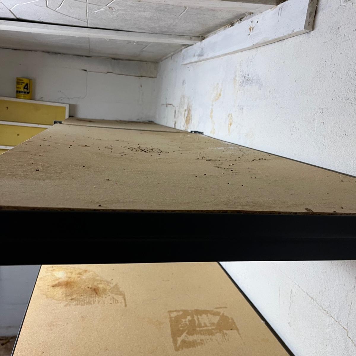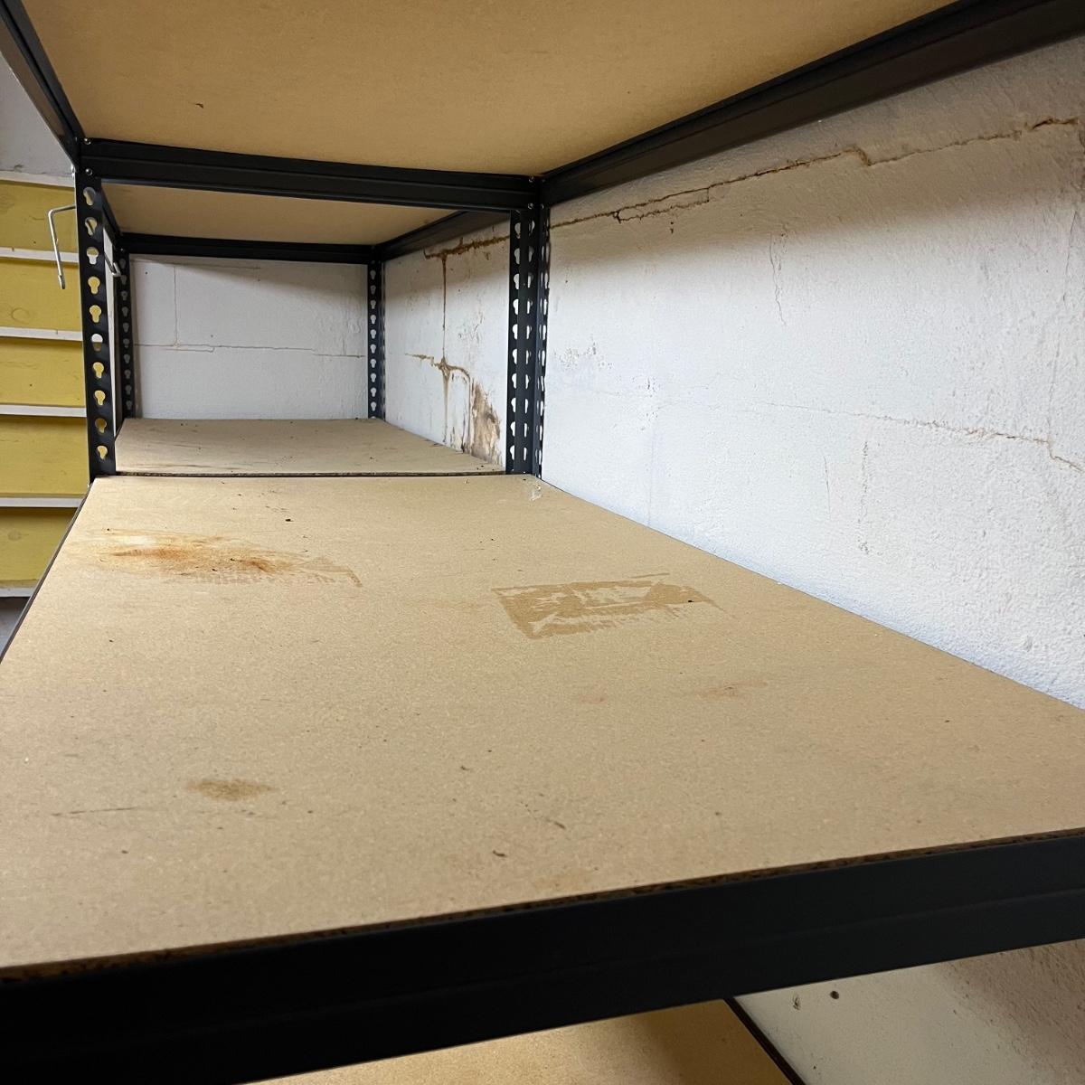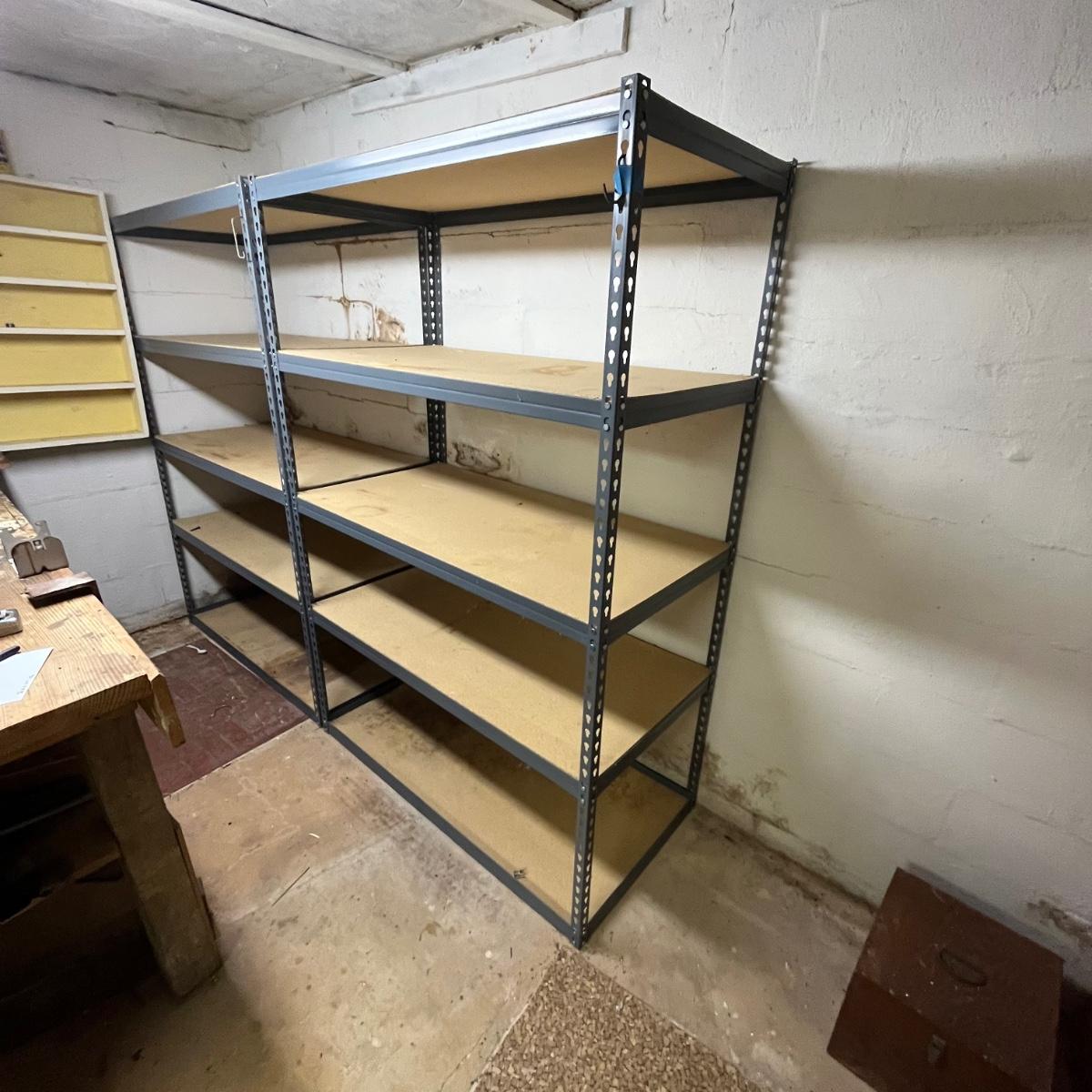 Lot includes two adjustable metal shelving units with particle board shelves. Units come apart for easier transport. Each unit measures 24” x 49” x 72”.