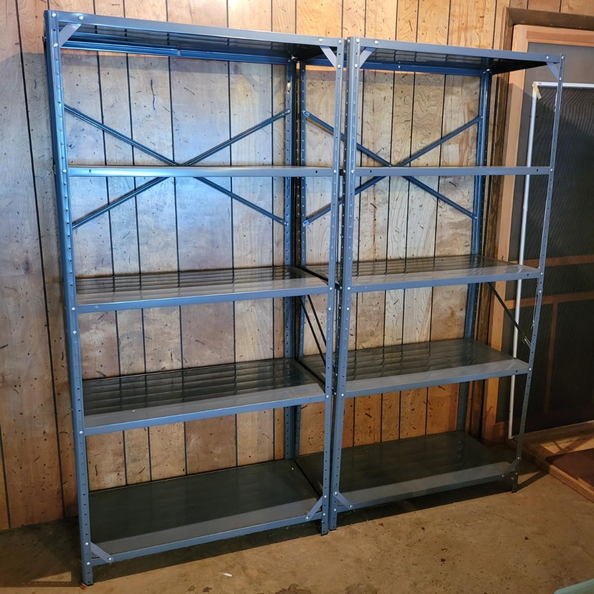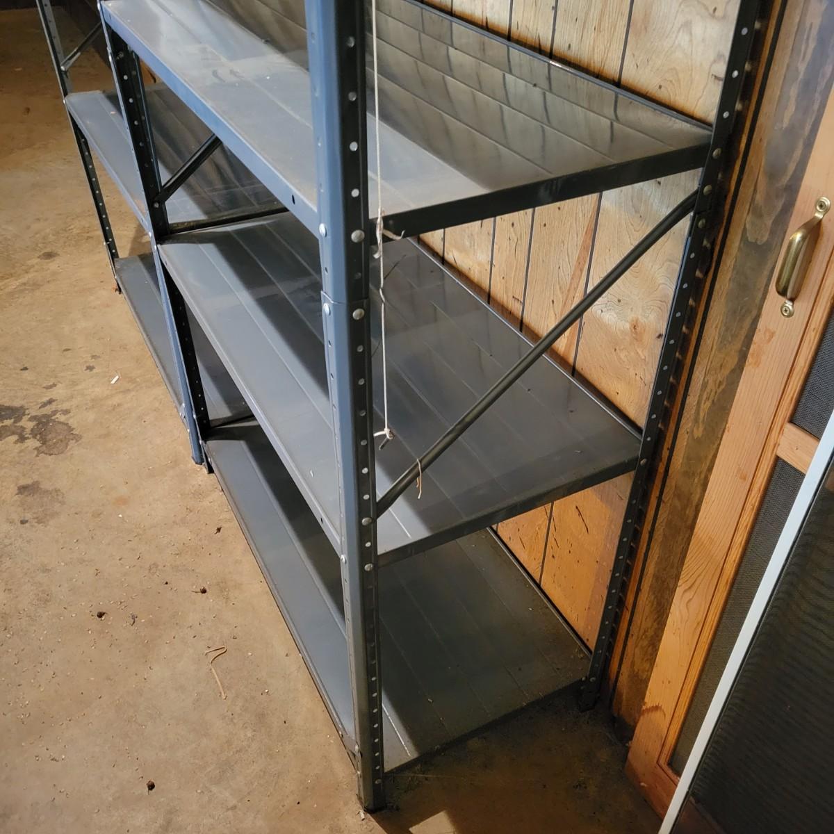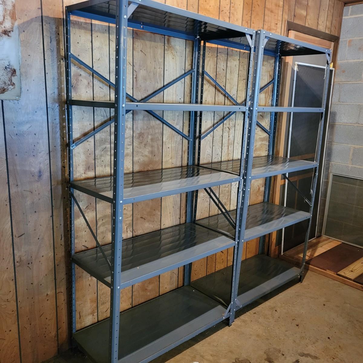 A pair of metal shelving units that have adjustable shelves. Each unit measures approximately 36.5" x 18" x 73"H. Local pickup only