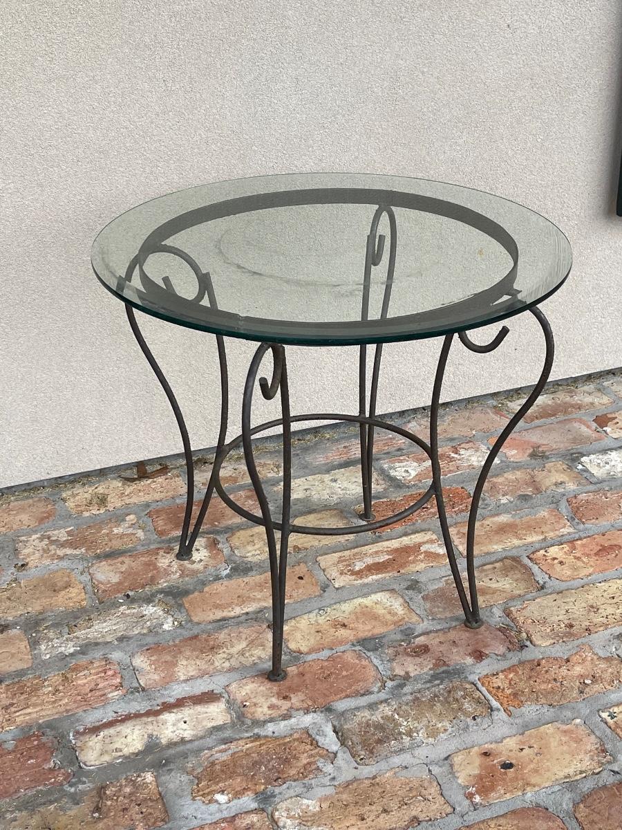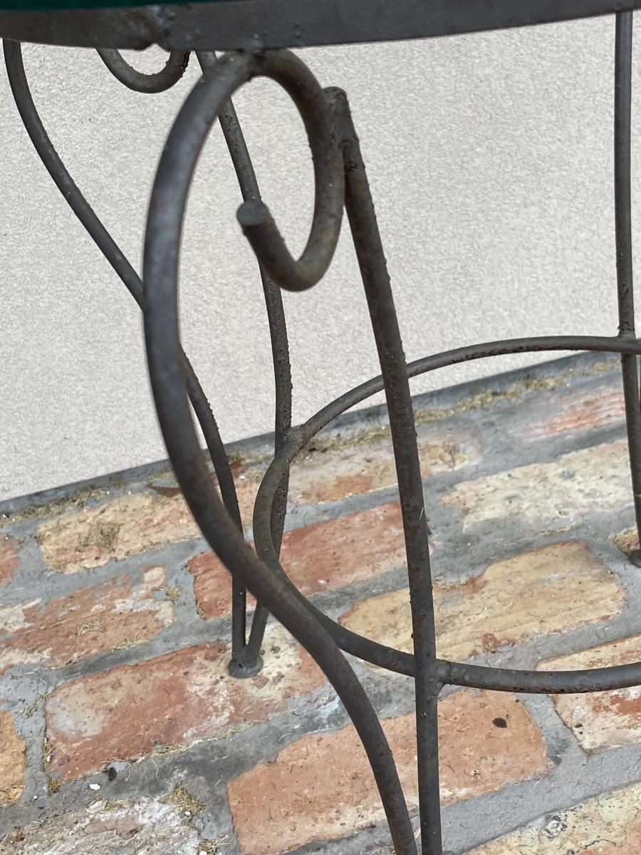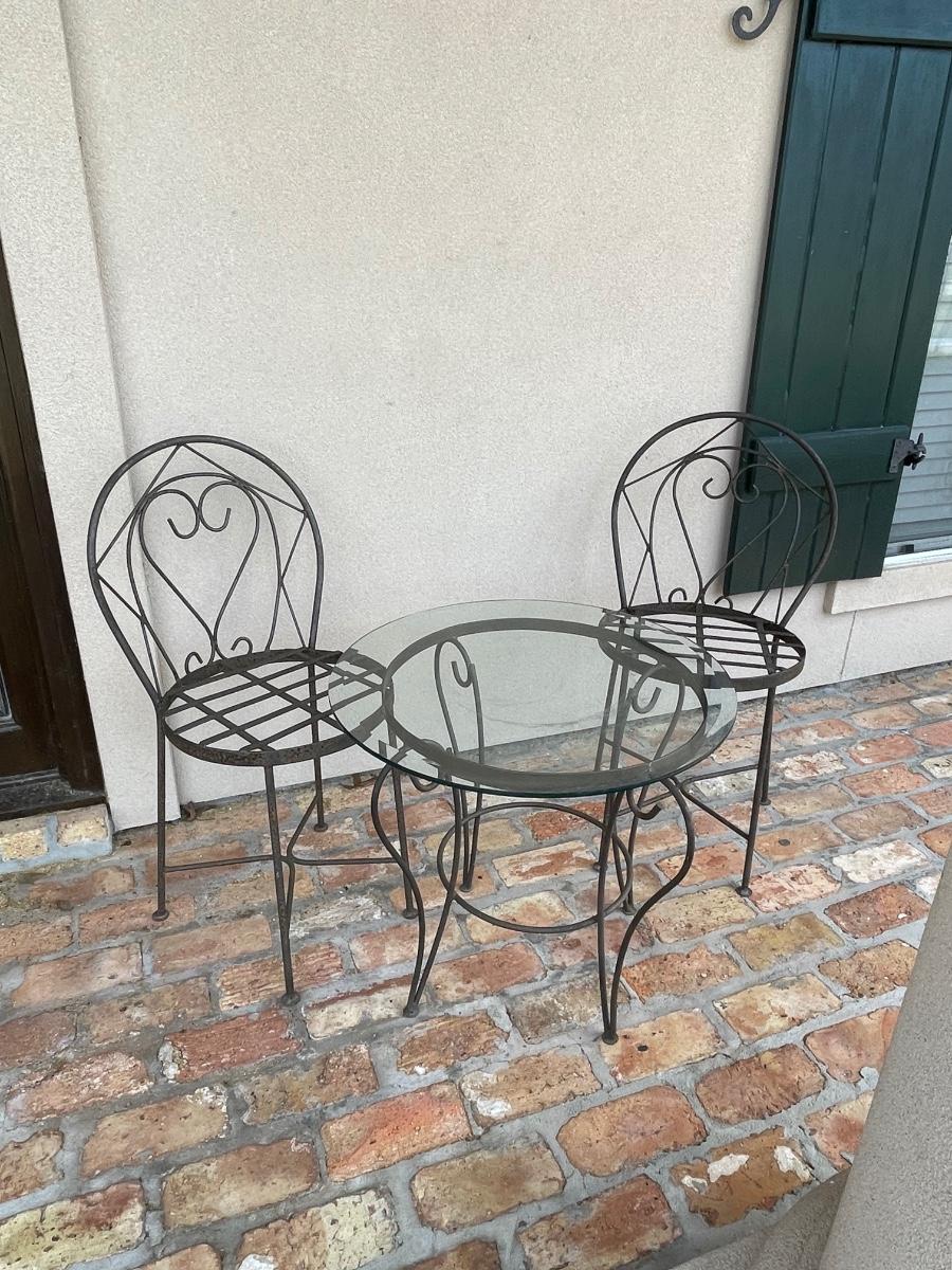 Three (3) Piece Set ~ Patio kept ~ surface rusting (see photos) ~ 32.5” H x 15” round. From Seat to floor is 18” / Round Table is 21" H with a 24" Beveled Glass Top *Glass top has been outdoors and has surface scratches.
